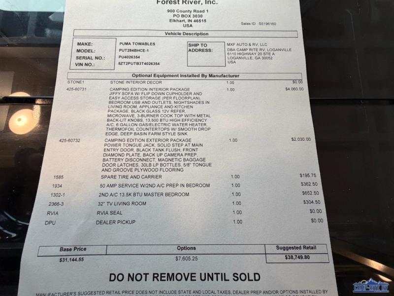 Forest River Puma Camping Edition travel trailer 284BHCE highlights: