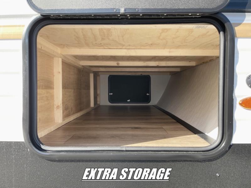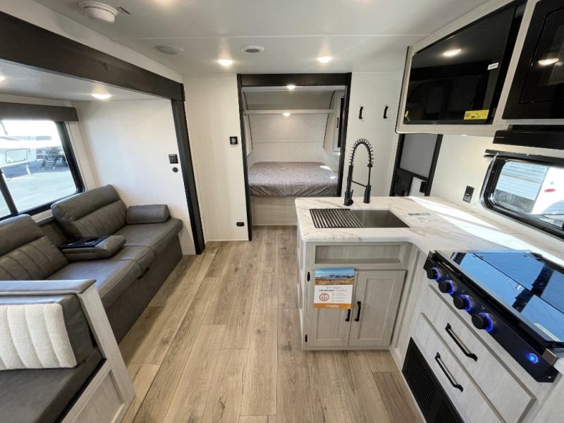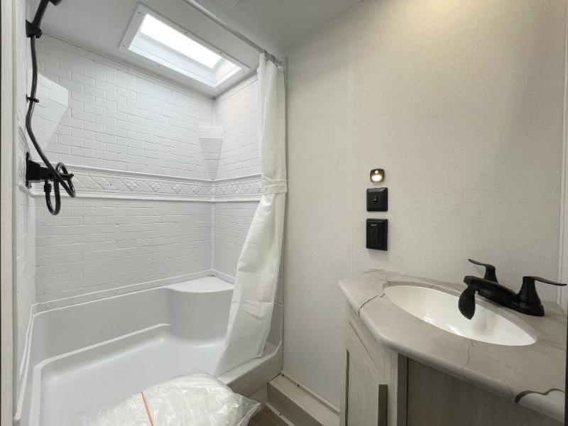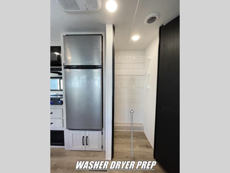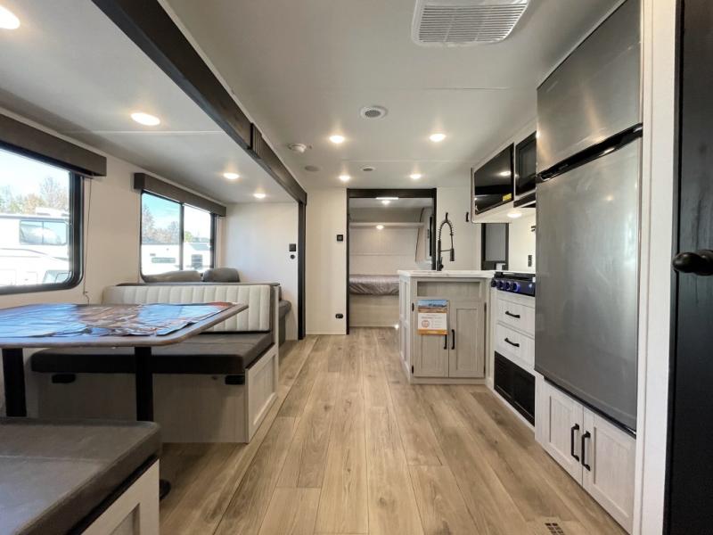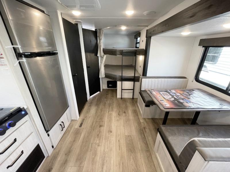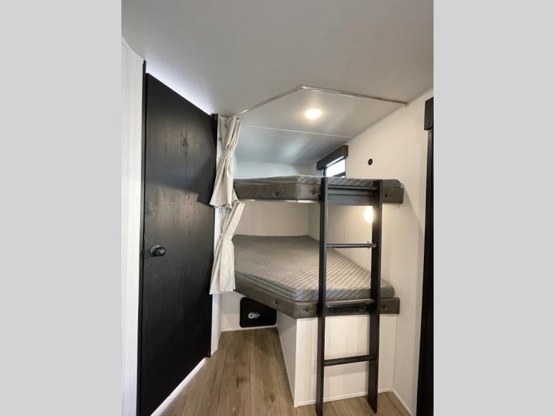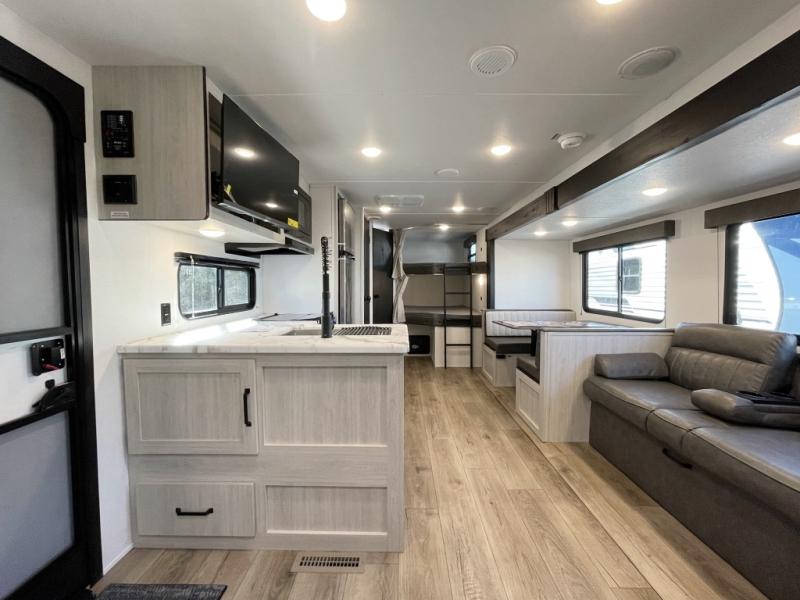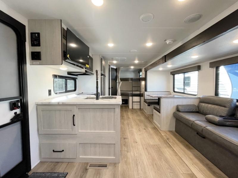 If you're looking for more space, this double axle unit features a large slide so you can walk about freely. Here, you'll find the booth dinette and sofa, which sit across from the optional TV if you want to enjoy movie nights. The full kitchen includes a microwave and three burner cooktop to make meals, plus a pantry and 12V refrigerator for food storage. There is even washer and dryer prep in the pantry if you choose to add these appliances. The kids or your guests will love the double-size bunks, and the full bath right beside the bunks includes one of the dual entry doors so you can easily get back out to the fun!
