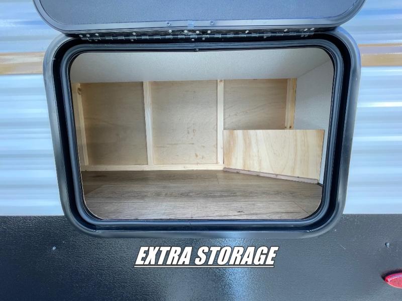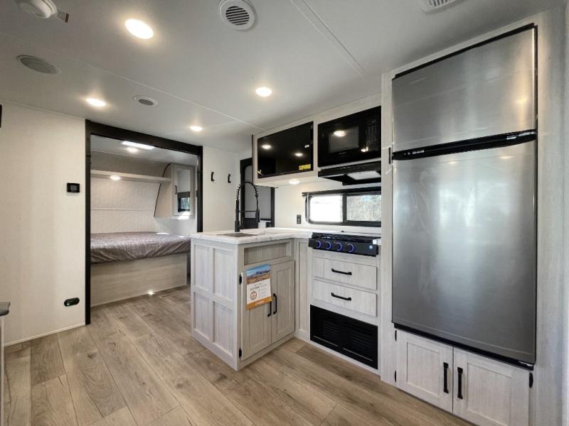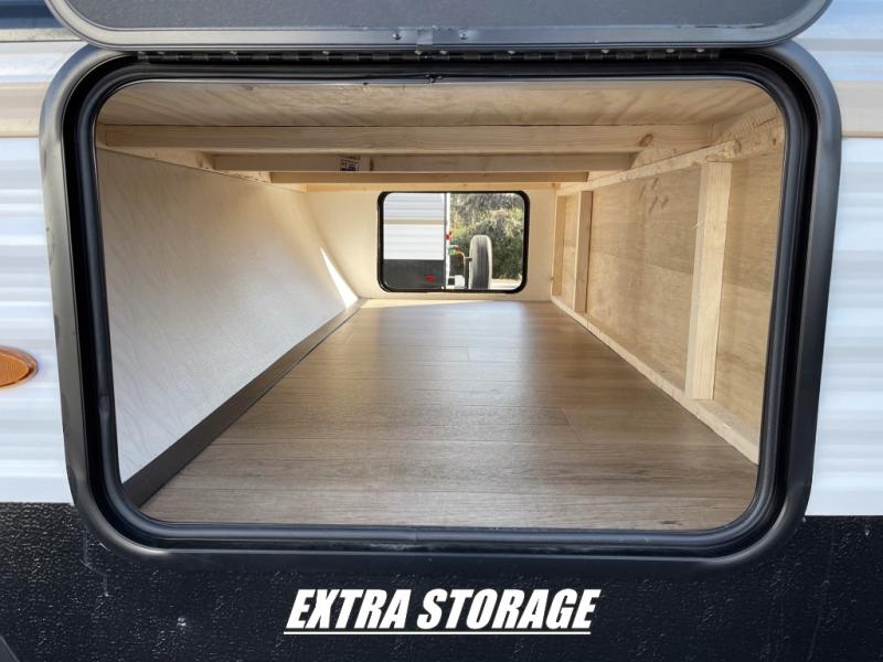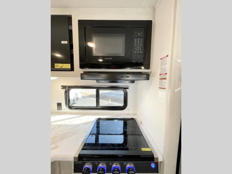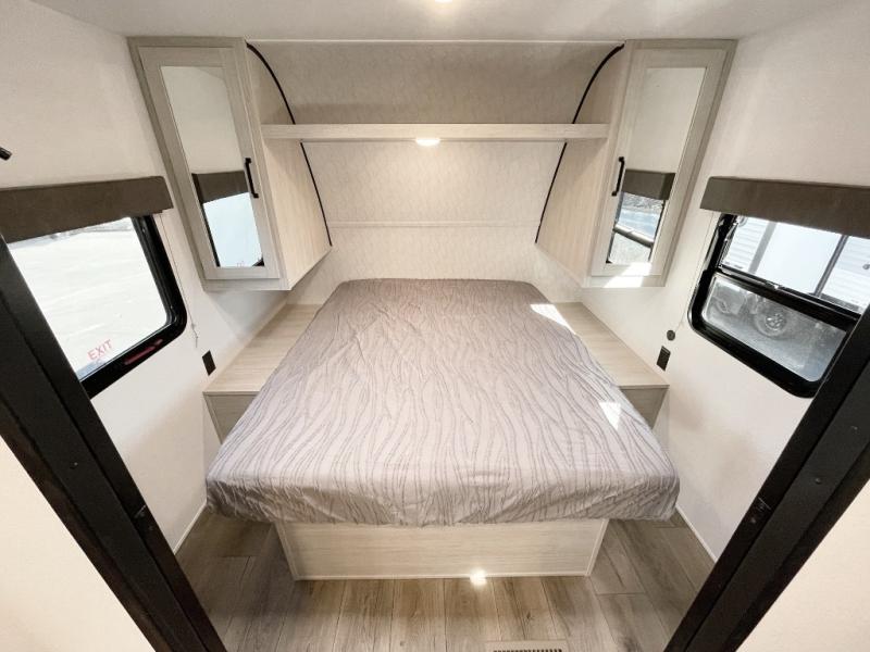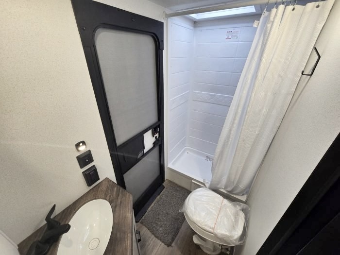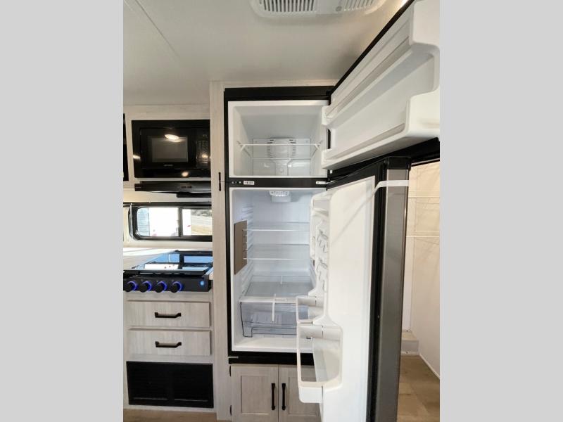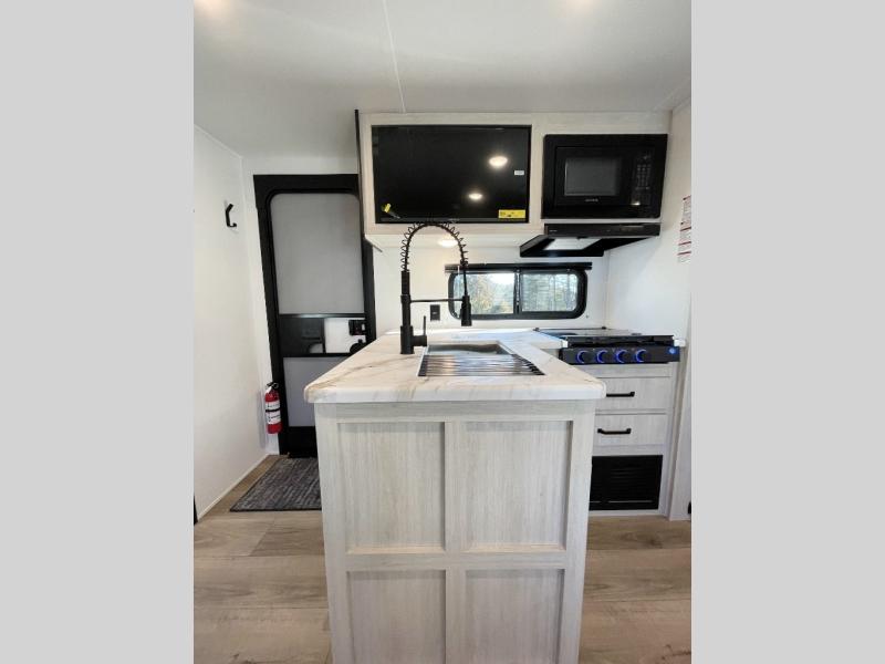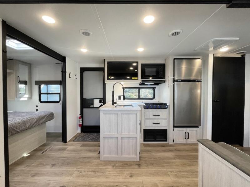 If you're looking for more space, this double axle unit features a large slide so you can walk about freely. Here, you'll find the booth dinette and sofa, which sit across from the optional TV if you want to enjoy movie nights. The full kitchen includes a microwave and three burner cooktop to make meals, plus a pantry and 12V refrigerator for food storage. There is even washer and dryer prep in the pantry if you choose to add these appliances. The kids or your guests will love the double-size bunks, and the full bath right beside the bunks includes one of the dual entry doors so you can easily get back out to the fun!
