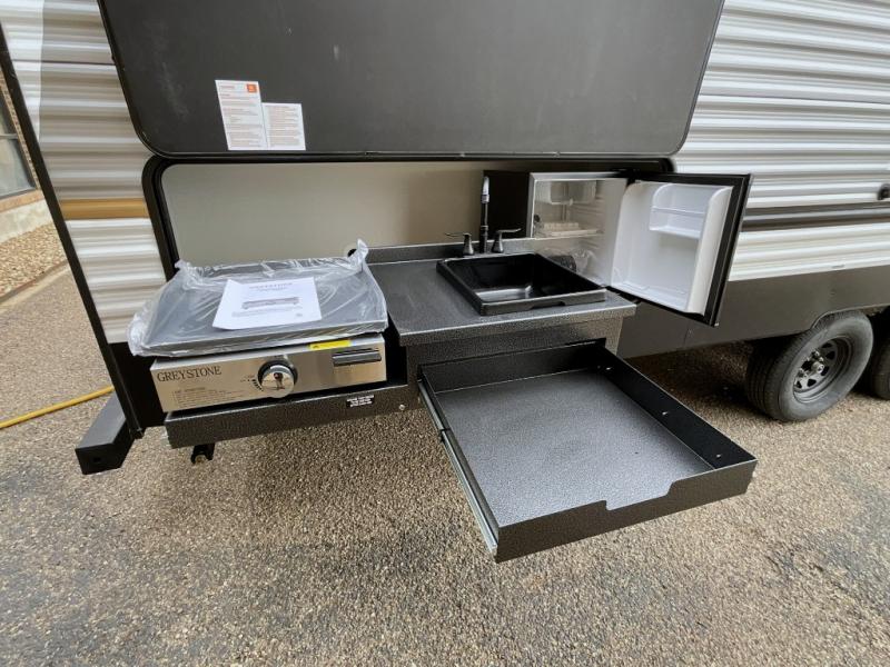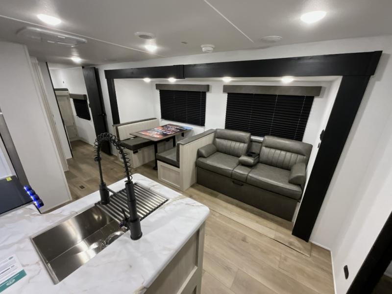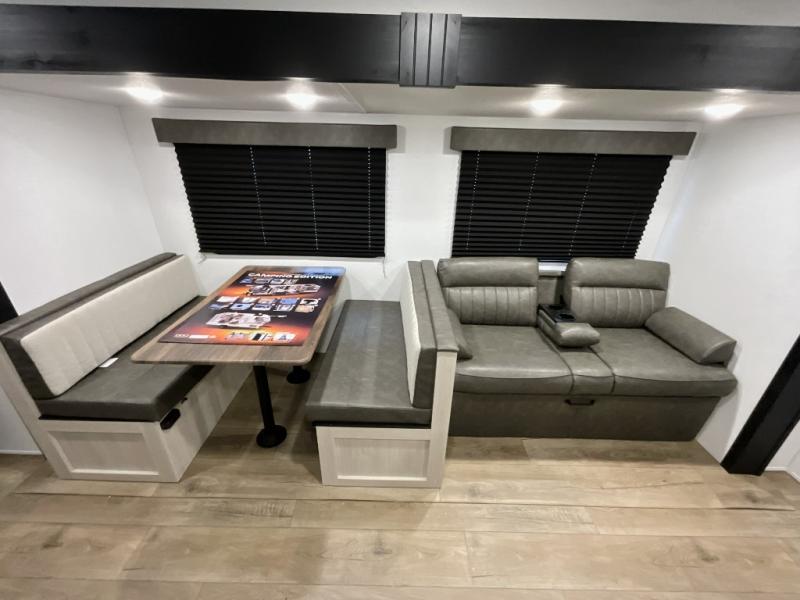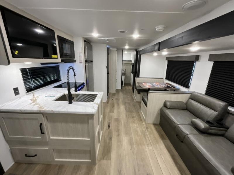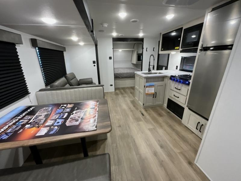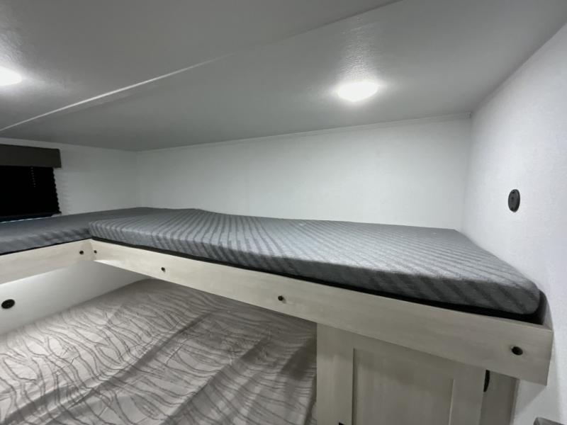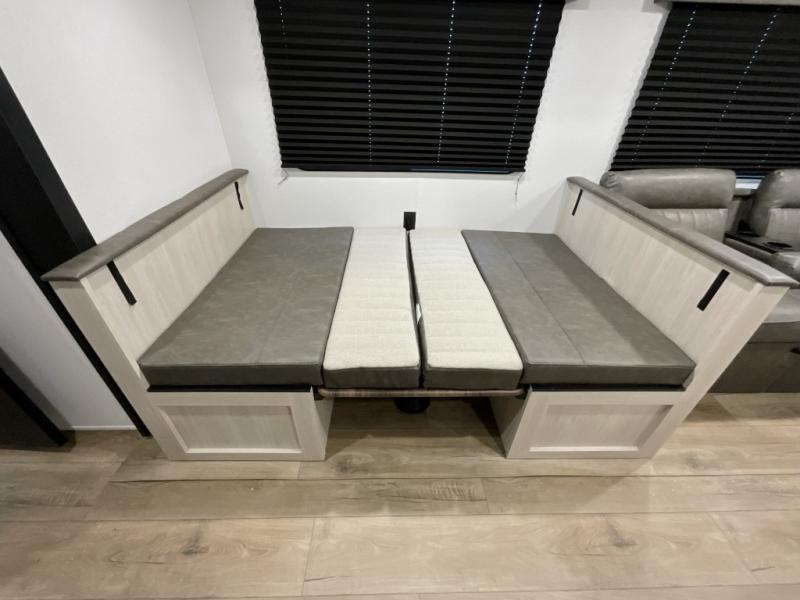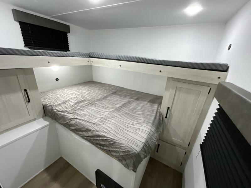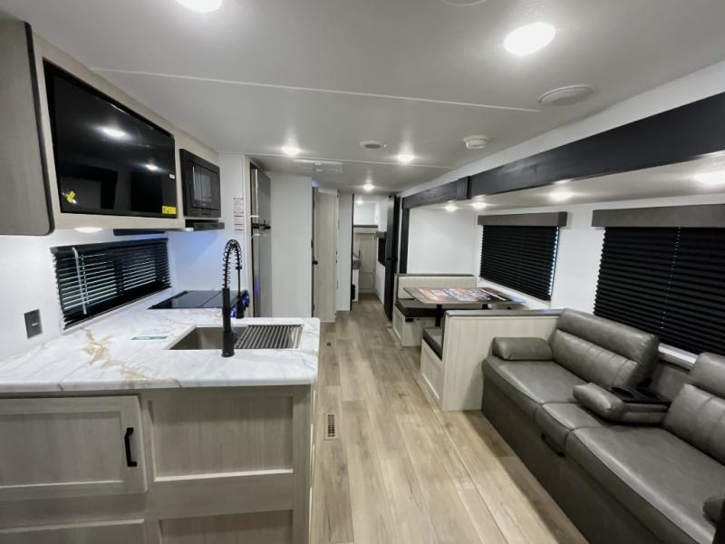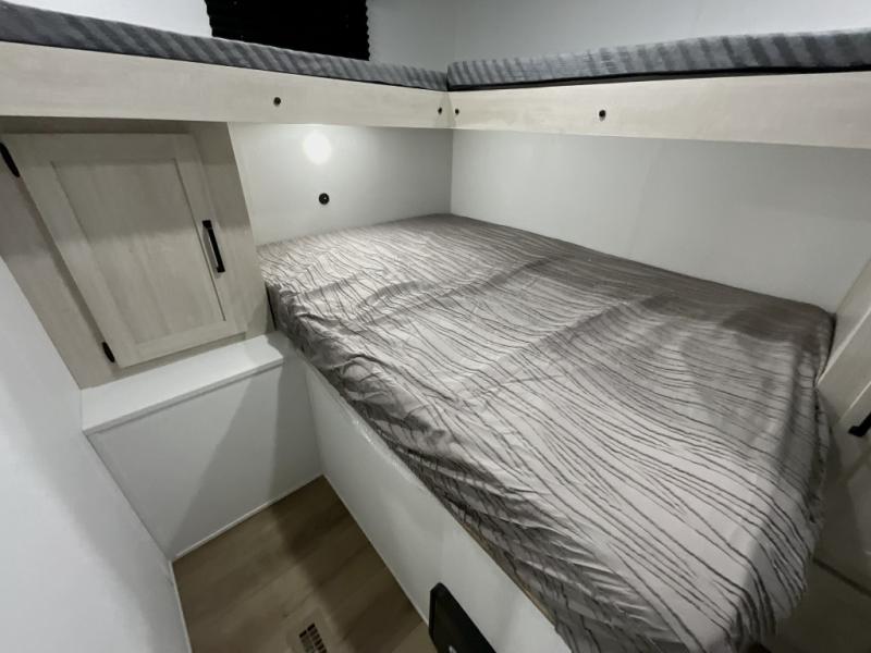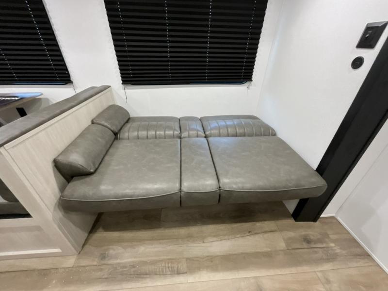 If you're looking for more space, this double axle unit features a large slide so you can walk about freely. Here, you'll find the booth dinette and sofa, which sit across from the optional TV if you want to enjoy movie nights. The full kitchen includes a stainless microwave and three burner cooktop to make meals, plus a pantry and 12V refrigerator for food storage. And an optional outside mini kitchen with a grill can be added if you enjoy cooking outdoors! Your guests or littles are sure to enjoy the rear bedroom with a queen bed, a 28" x 65" bunk, 28" x 76" bunk, a shirt closet, and a wardrobe so everything has a place!