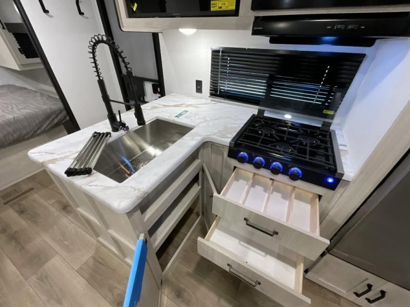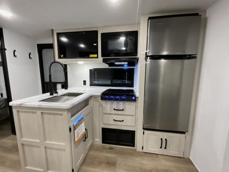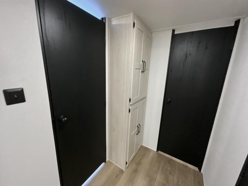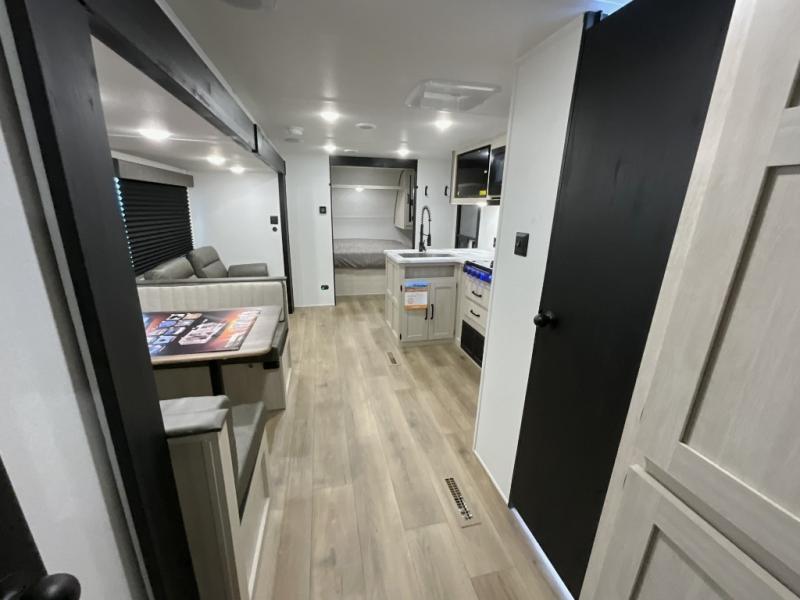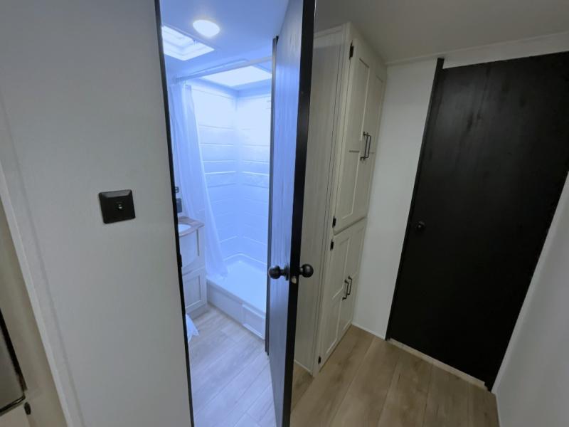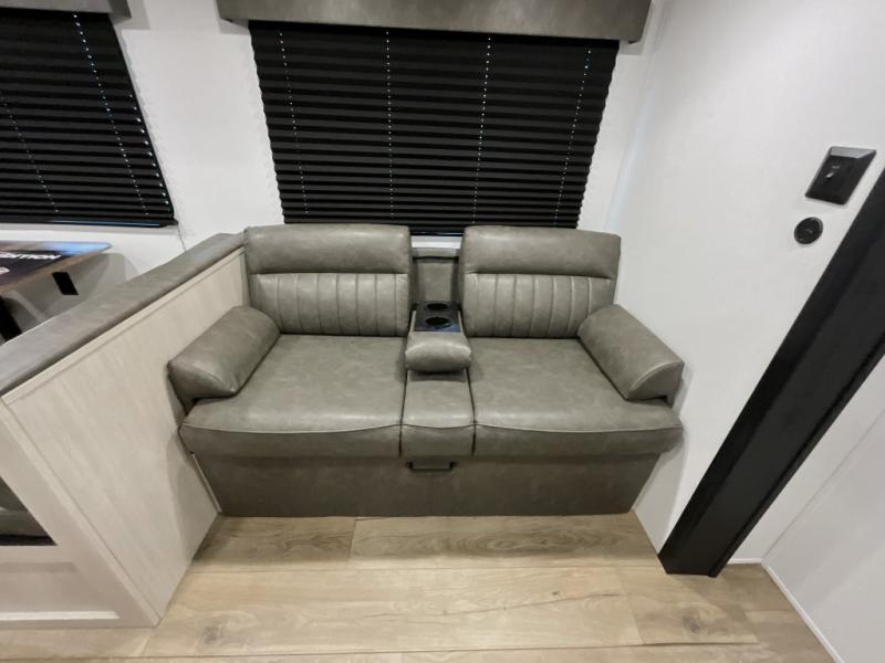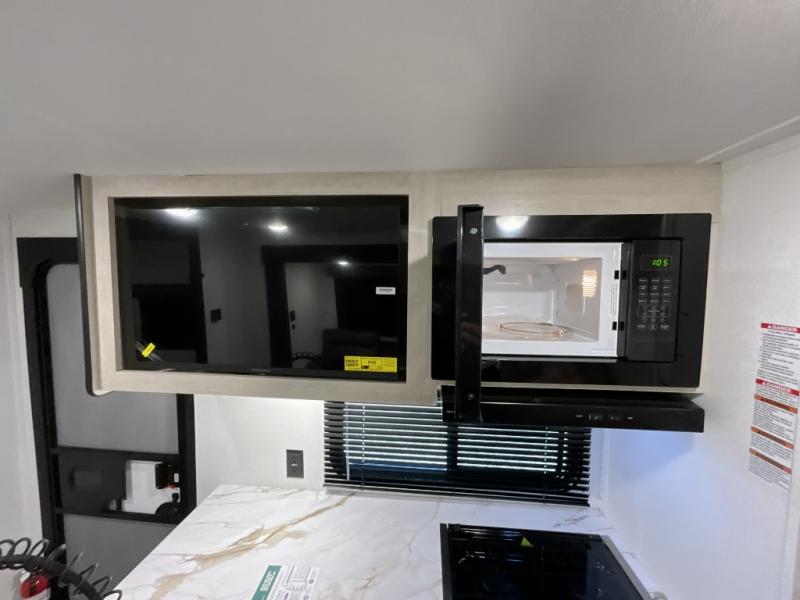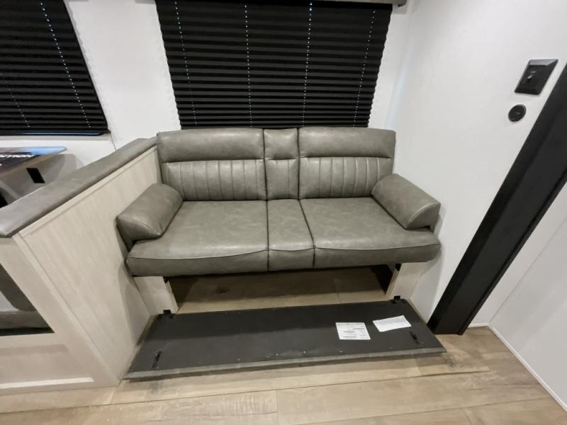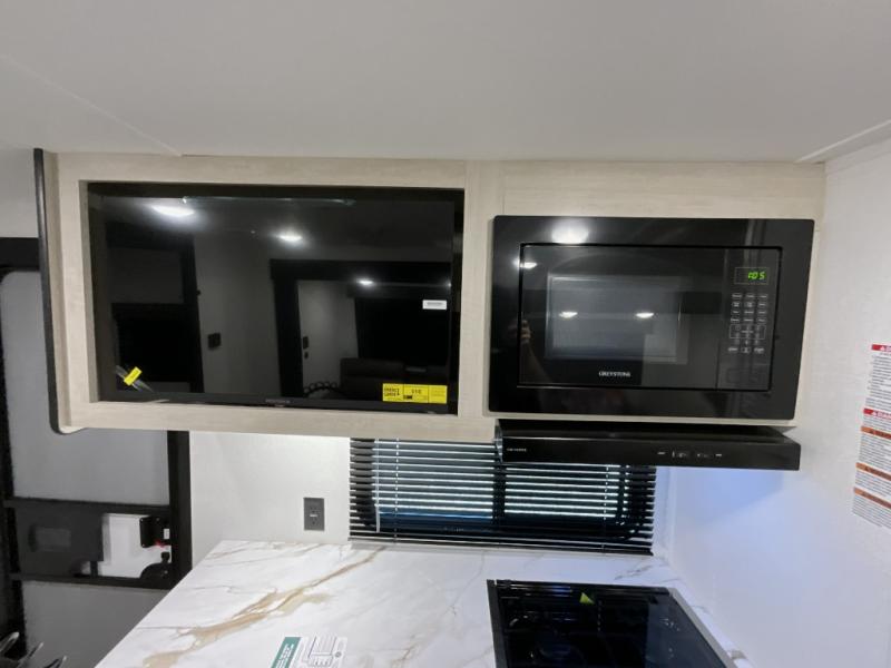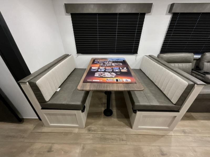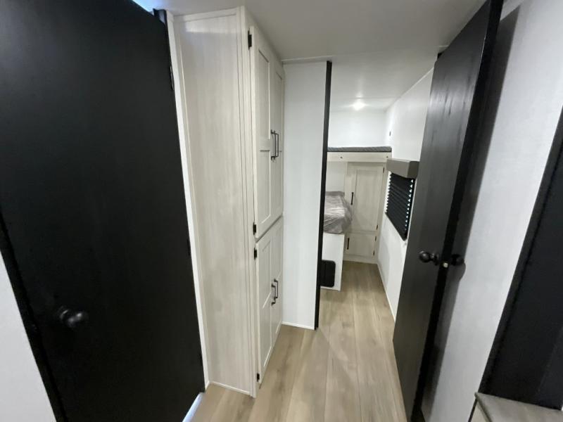 If you're looking for more space, this double axle unit features a large slide so you can walk about freely. Here, you'll find the booth dinette and sofa, which sit across from the optional TV if you want to enjoy movie nights. The full kitchen includes a stainless microwave and three burner cooktop to make meals, plus a pantry and 12V refrigerator for food storage. And an optional outside mini kitchen with a grill can be added if you enjoy cooking outdoors! Your guests or littles are sure to enjoy the rear bedroom with a queen bed, a 28" x 65" bunk, 28" x 76" bunk, a shirt closet, and a wardrobe so everything has a place!