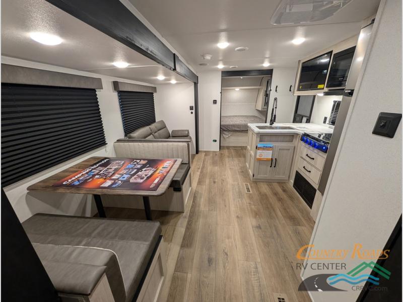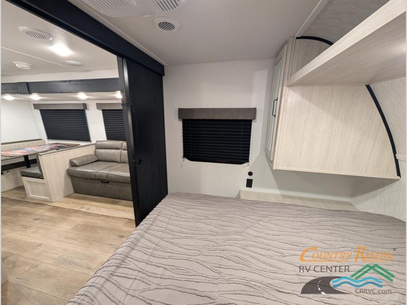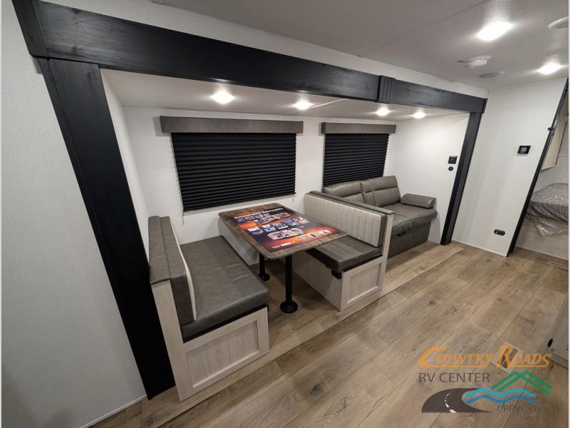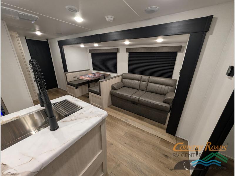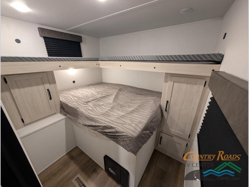 If you're looking for more space, this double axle unit features a large slide so you can walk about freely. Here, you'll find the booth dinette and sofa, which sit across from the optional TV if you want to enjoy movie nights. The full kitchen includes a stainless microwave and three burner cooktop to make meals, plus a pantry and 12V refrigerator for food storage. And an optional outside mini kitchen with a grill can be added if you enjoy cooking outdoors! Your guests or littles are sure to enjoy the rear bedroom with a queen bed, a 28" x 65" bunk, 28" x 76" bunk, a shirt closet, and a wardrobe so everything has a place!