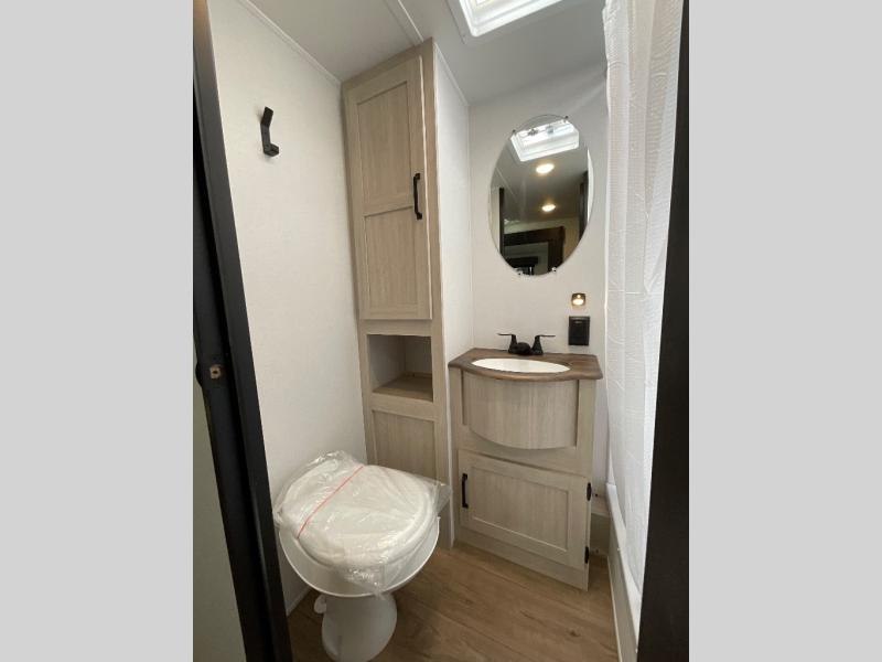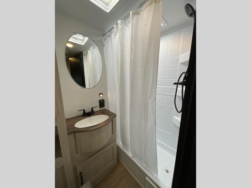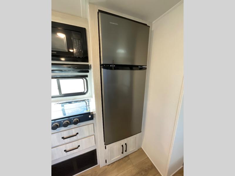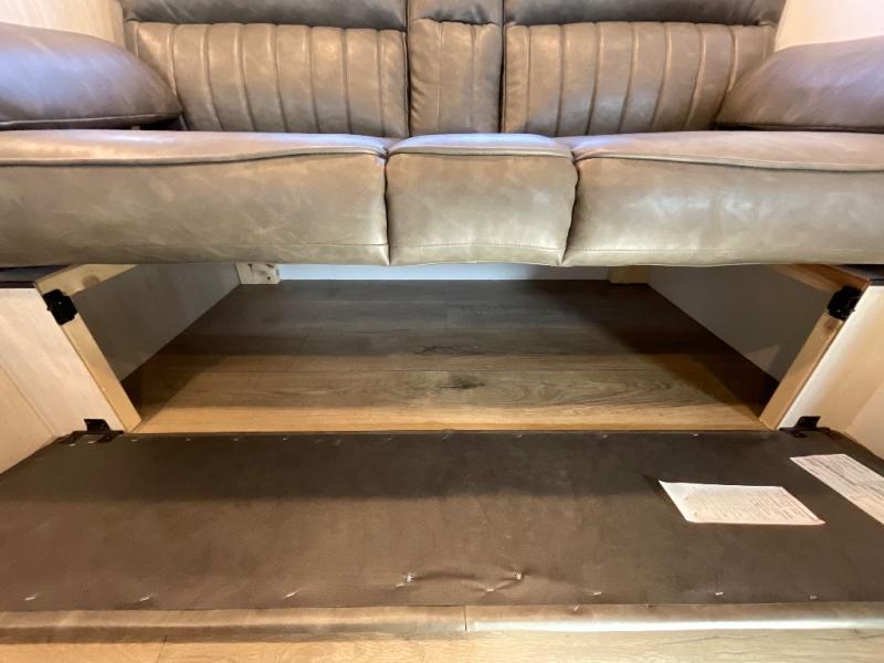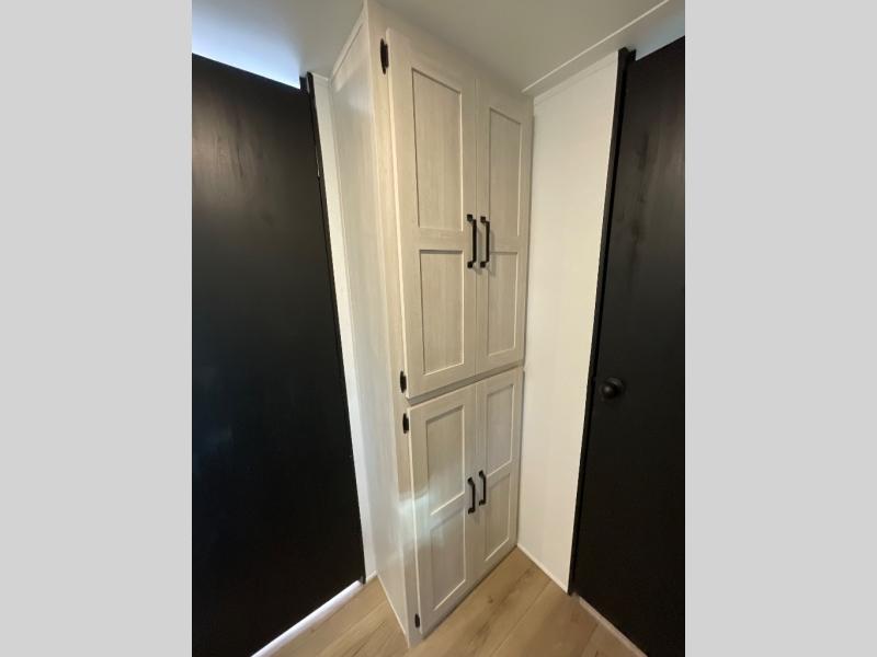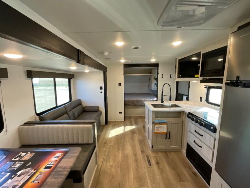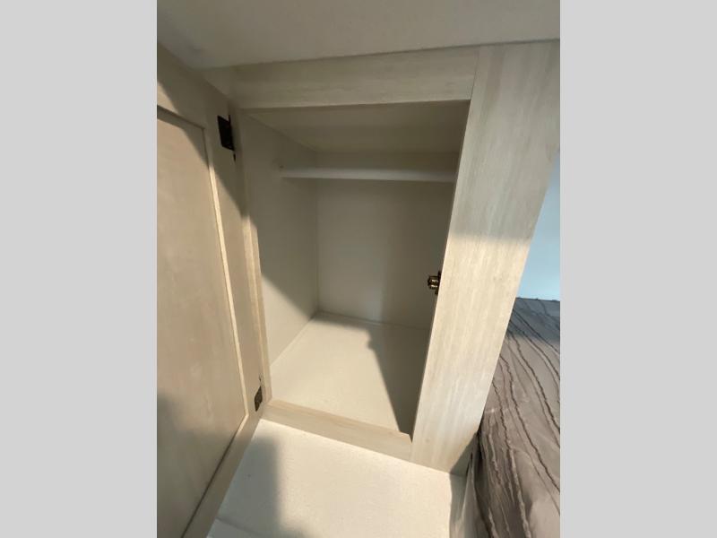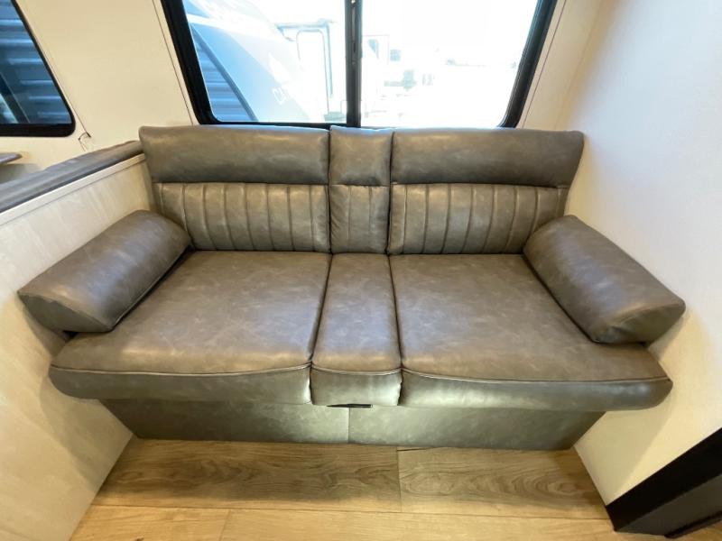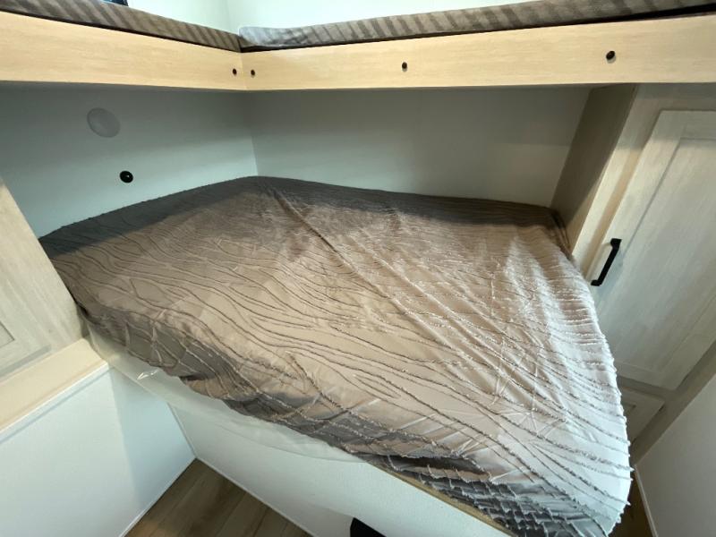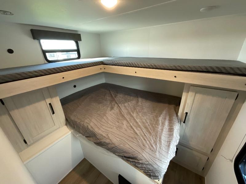 If you're looking for more space, this double axle unit features a large slide so you can walk about freely. Here, you'll find the booth dinette and sofa, which sit across from the optional TV if you want to enjoy movie nights. The full kitchen includes a stainless microwave and three burner cooktop to make meals, plus a pantry and 12V refrigerator for food storage. And an optional outside mini kitchen with a grill can be added if you enjoy cooking outdoors! Your guests or littles are sure to enjoy the rear bedroom with a queen bed, a 28" x 65" bunk, 28" x 76" bunk, a shirt closet, and a wardrobe so everything has a place!