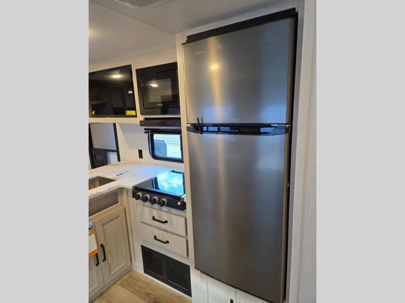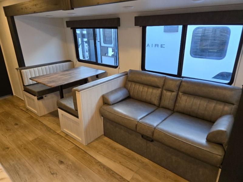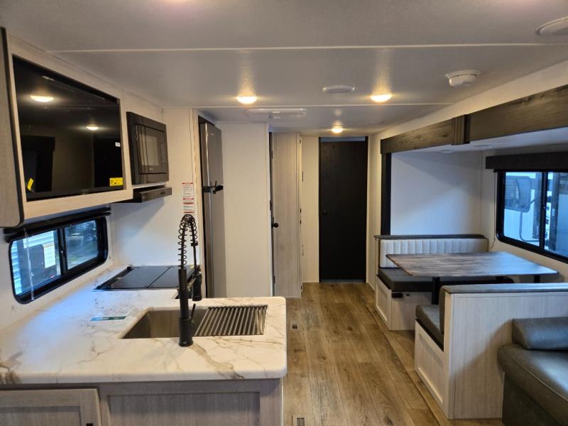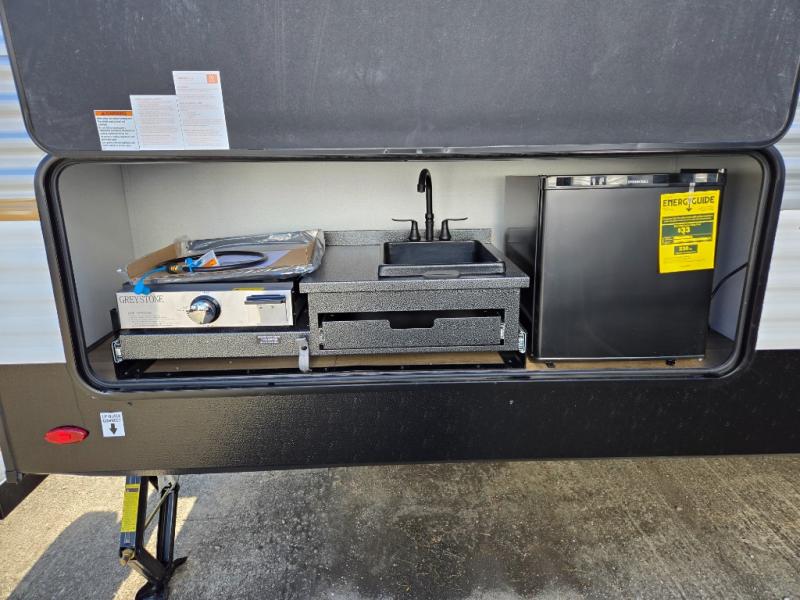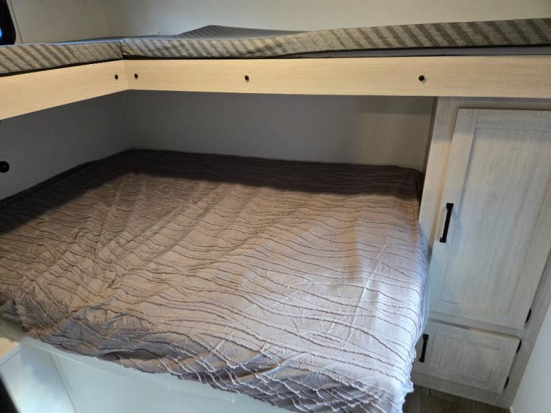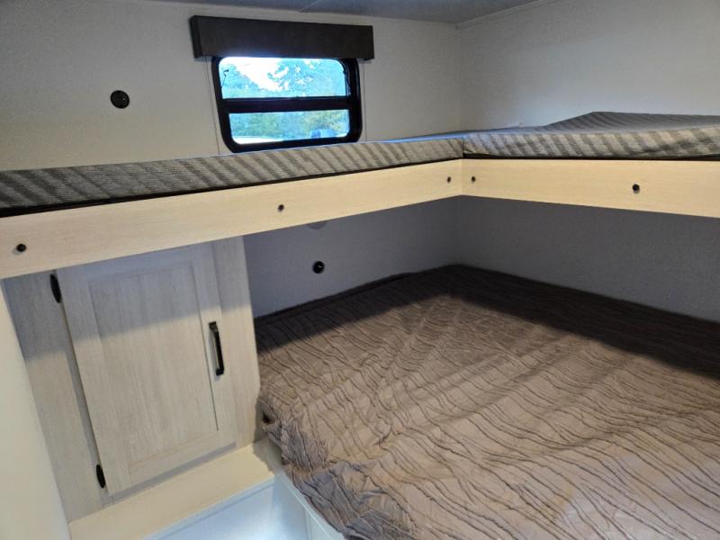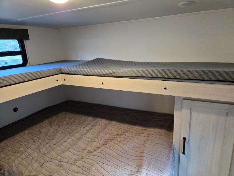 If you're looking for more space, this double axle unit features a large slide so you can walk about freely. Here, you'll find the booth dinette and sofa, which sit across from the optional TV if you want to enjoy movie nights. The full kitchen includes a stainless microwave and three burner cooktop to make meals, plus a pantry and 12V refrigerator for food storage. And an optional outside mini kitchen with a grill can be added if you enjoy cooking outdoors! Your guests or littles are sure to enjoy the rear bedroom with a queen bed, a 28" x 65" bunk, 28" x 76" bunk, a shirt closet, and a wardrobe so everything has a place!