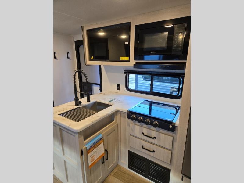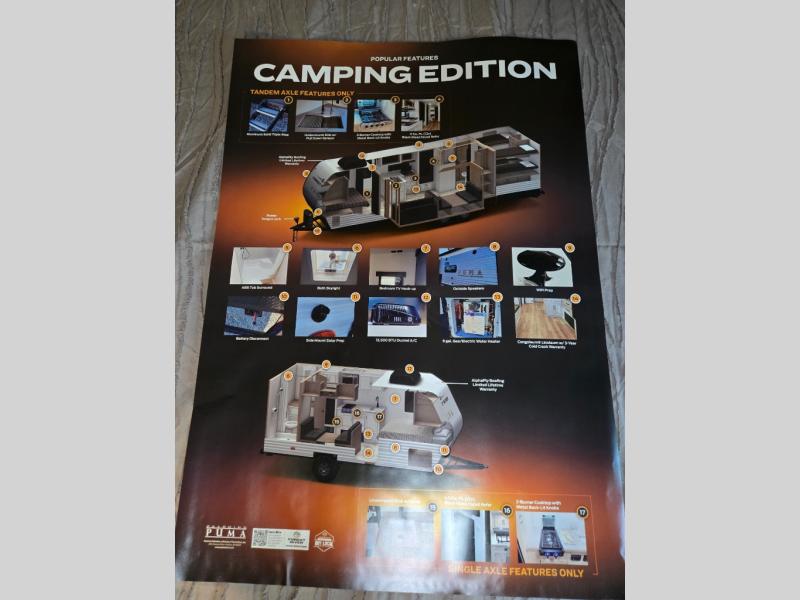 The Puma Camping Edition by Forest River offer an affordable travel trailer for rookie campers or seasoned RVers! They are built with 5/8" tongue and groove plywood flooring and a front diamond plate for added protection. There are also exterior magnetic baggage door latches, back up camera prep, a battery disconnect. Head inside to find Thermofoil countertops with a smooth drop edge, bedroom USB ports and outlets, and pleated shades in the living room.
