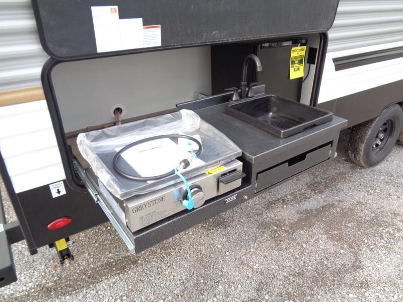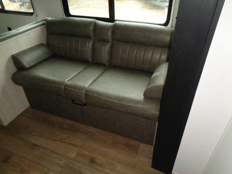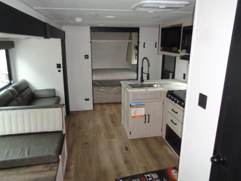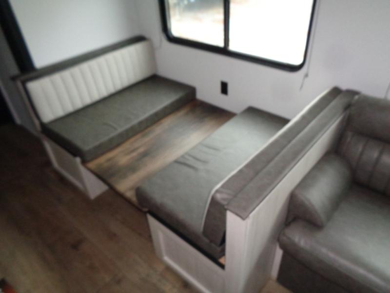 If you're looking for more space, this double axle unit features a large slide so you can walk about freely. Here, you'll find the booth dinette and sofa, which sit across from the optional TV if you want to enjoy movie nights. The full kitchen includes a stainless microwave and three burner cooktop to make meals, plus a pantry and 12V refrigerator for food storage. And an optional outside mini kitchen with a grill can be added if you enjoy cooking outdoors! Your guests or littles are sure to enjoy the rear bedroom with a queen bed, a 28" x 65" bunk, 28" x 76" bunk, a shirt closet, and a wardrobe so everything has a place!