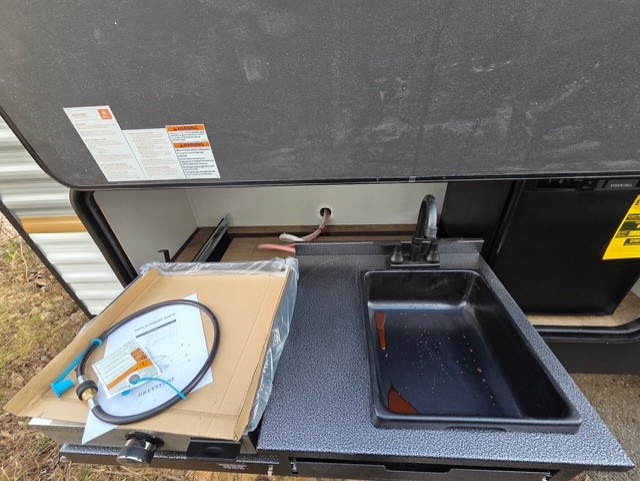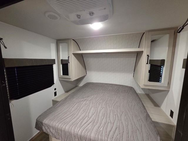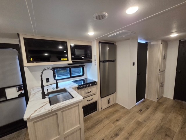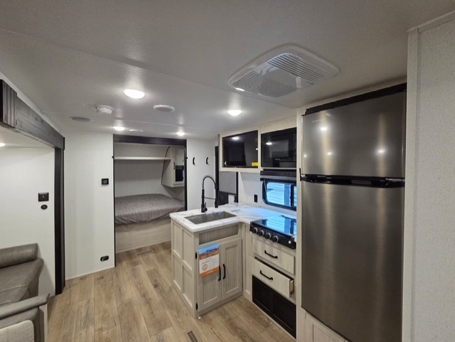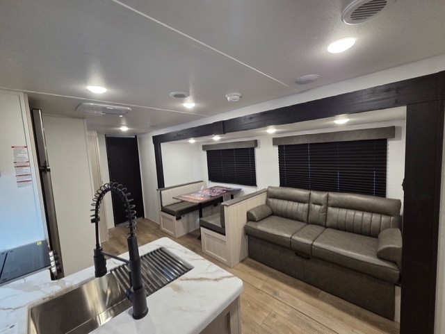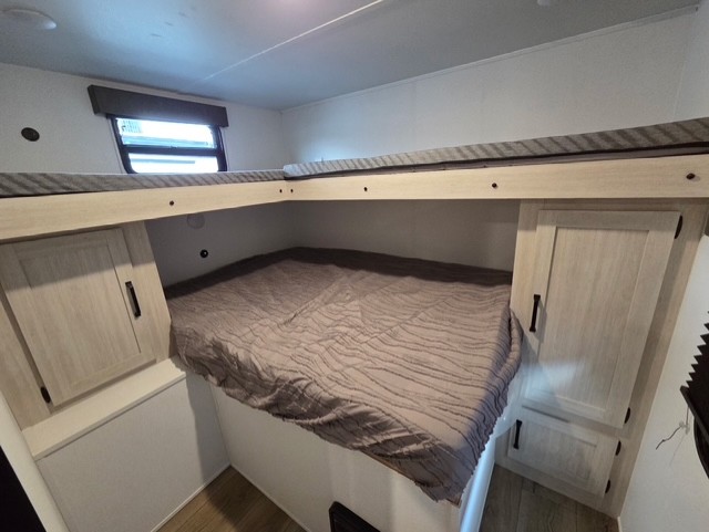If you're looking for more space, this double axle unit features a large slide so you can walk about freely. Here, you'll find the booth dinette and sofa, which sit across from the optional TV if you want to enjoy movie nights. The full kitchen includes a stainless microwave and three burner cooktop to make meals, plus a pantry and 12V refrigerator for food storage. And an optional outside mini kitchen with a grill can be added if you enjoy cooking outdoors! Your guests or littles are sure to enjoy the rear bedroom with a queen bed, a 28" x 65" bunk, 28" x 76" bunk, a shirt closet, and a wardrobe so everything has a place!