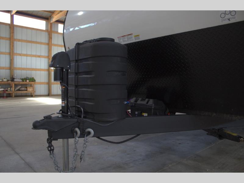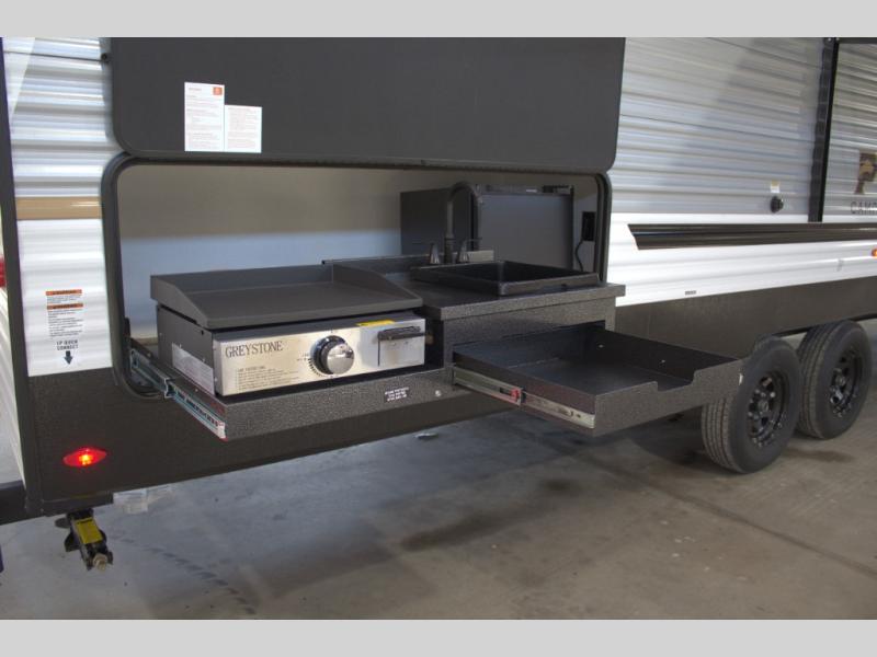 If you're looking for more space, this double axle unit features a large slide so you can walk about freely. Here, you'll find the booth dinette and sofa, which sit across from the optional TV if you want to enjoy movie nights. The full kitchen includes a stainless microwave and three burner cooktop to make meals, plus a pantry and 12V refrigerator for food storage. And an optional outside mini kitchen with a grill can be added if you enjoy cooking outdoors! Your guests or littles are sure to enjoy the rear bedroom with a queen bed, a 28" x 65" bunk, 28" x 76" bunk, a shirt closet, and a wardrobe so everything has a place!