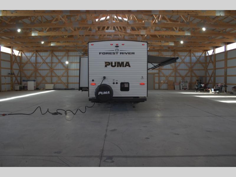 The Puma Camping Edition by Forest River offer an affordable travel trailer for rookie campers or seasoned RVers! They are built with 5/8" tongue and groove plywood flooring and a front diamond plate for added protection. There are also exterior magnetic baggage door latches, back up camera prep, a battery disconnect. Head inside to find Thermofoil countertops with a smooth drop edge, bedroom USB ports and outlets, and pleated shades in the living room.