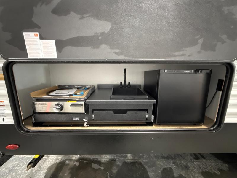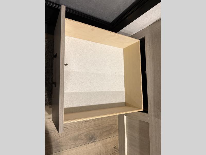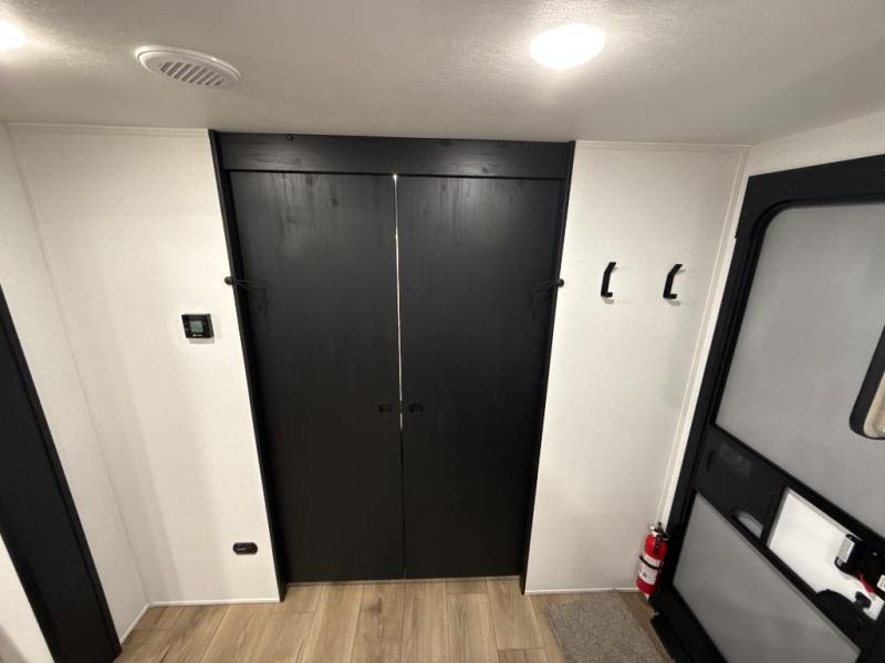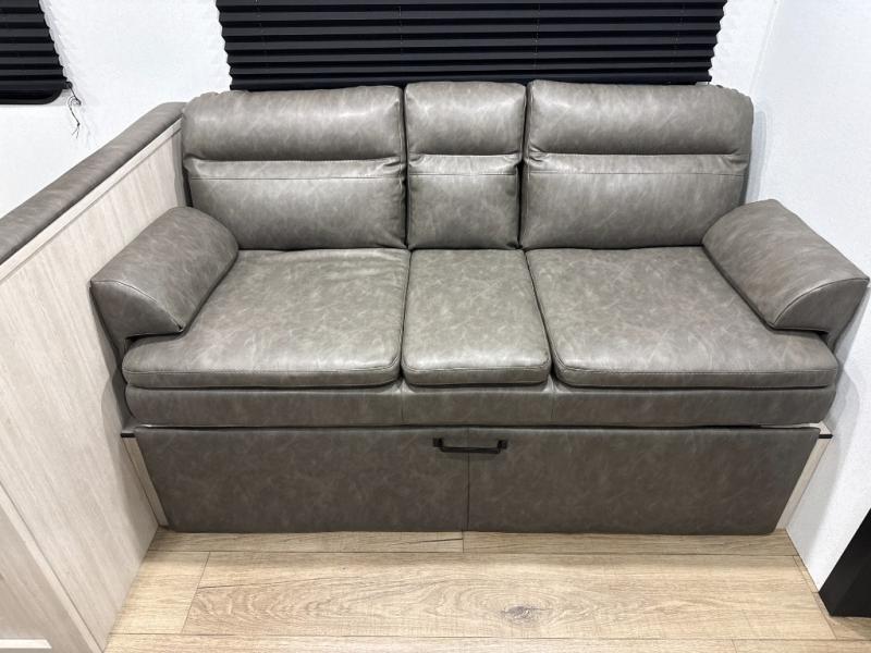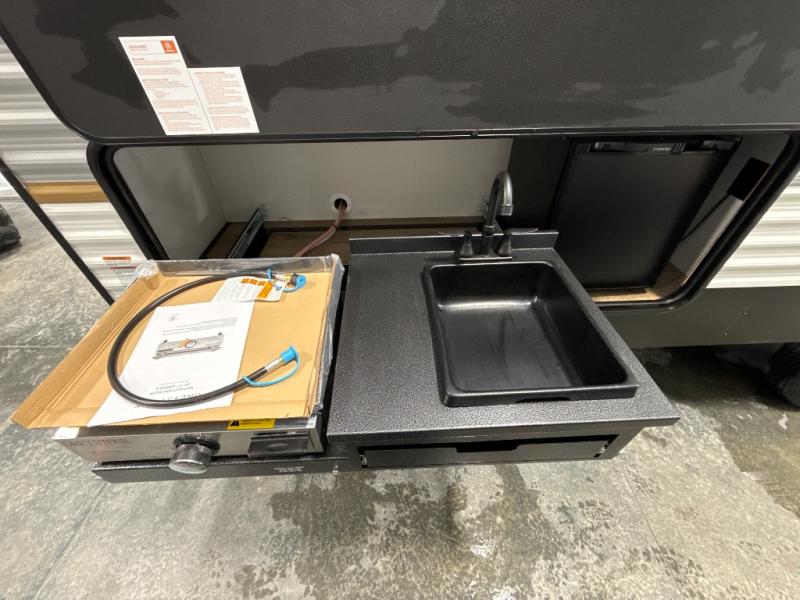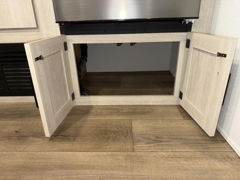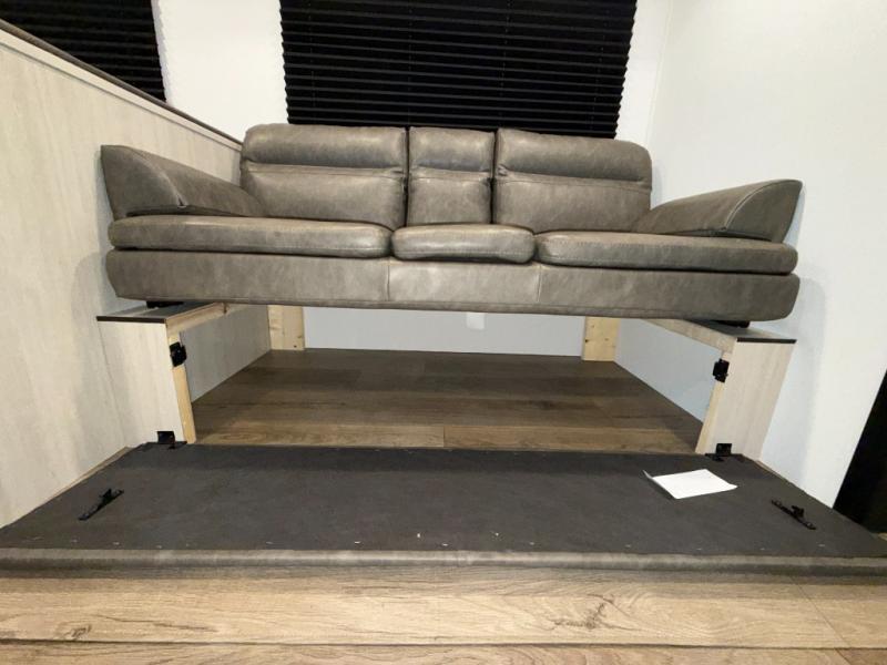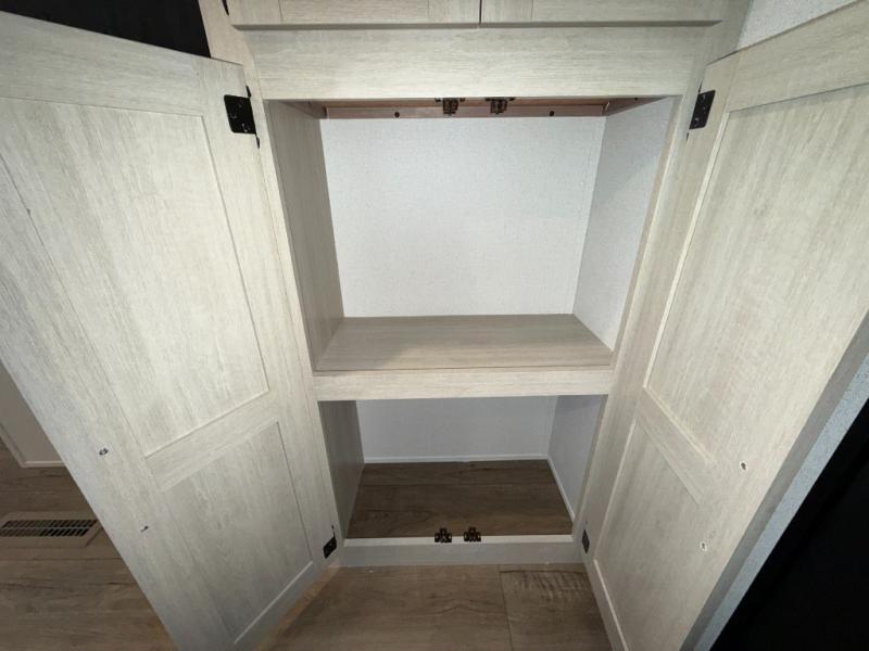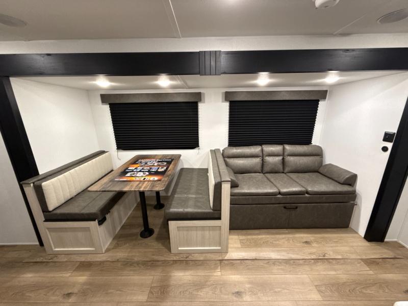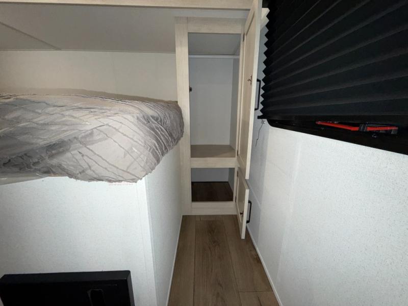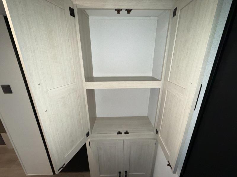 If you're looking for more space, this double axle unit features a large slide so you can walk about freely. Here, you'll find the booth dinette and sofa, which sit across from the optional TV if you want to enjoy movie nights. The full kitchen includes a stainless microwave and three burner cooktop to make meals, plus a pantry and 12V refrigerator for food storage. And an optional outside mini kitchen with a grill can be added if you enjoy cooking outdoors! Your guests or littles are sure to enjoy the rear bedroom with a queen bed, a 28" x 65" bunk, 28" x 76" bunk, a shirt closet, and a wardrobe so everything has a place!