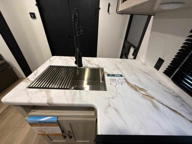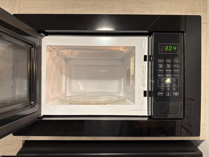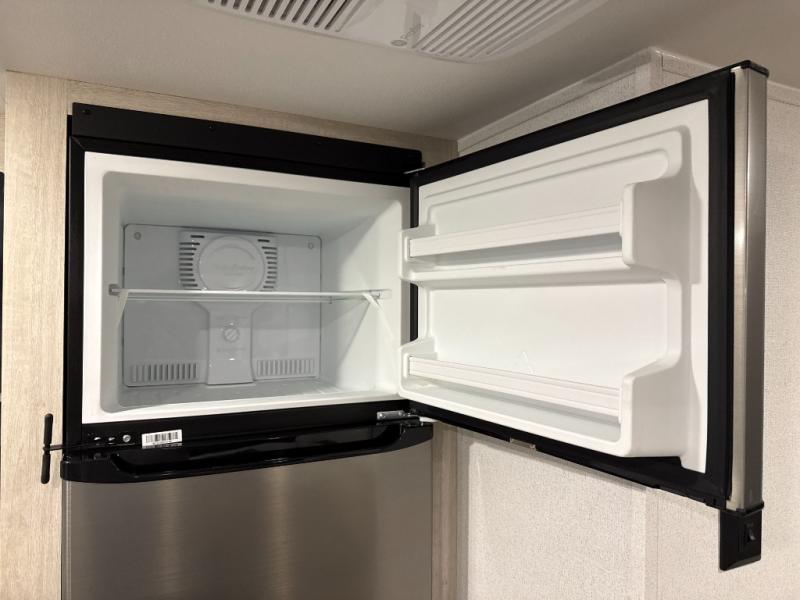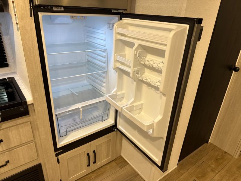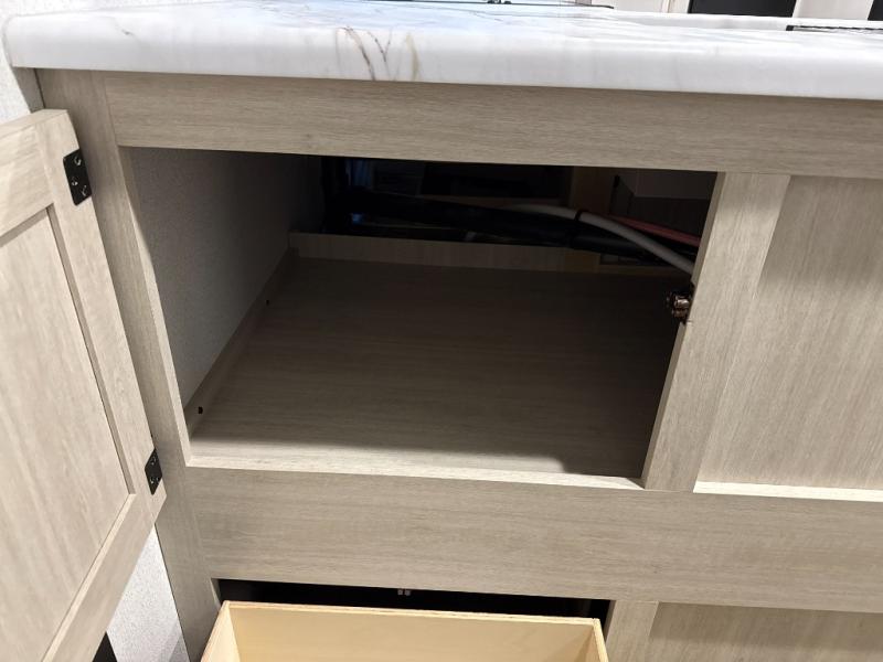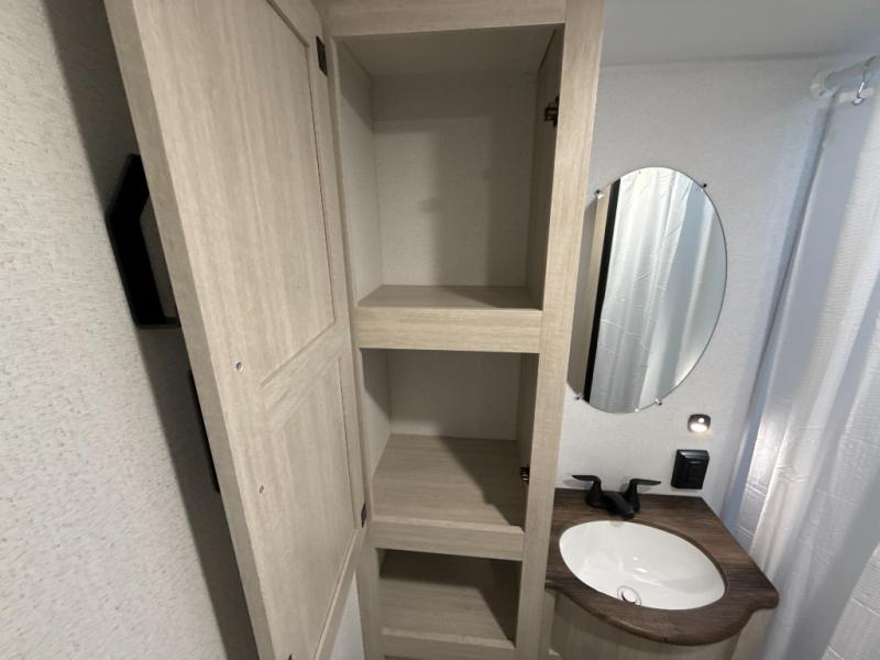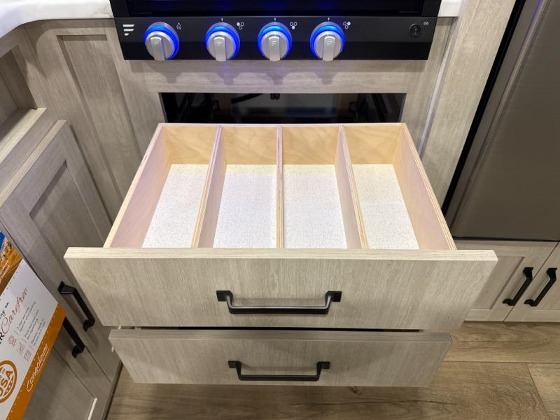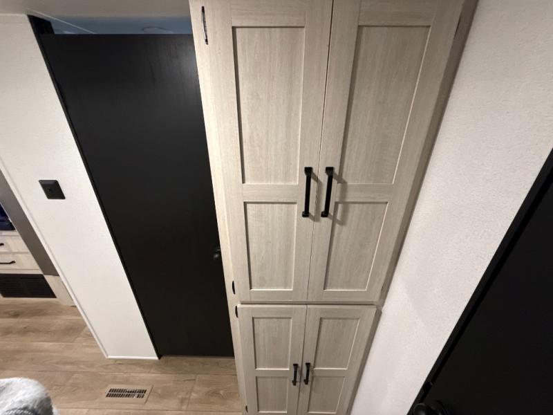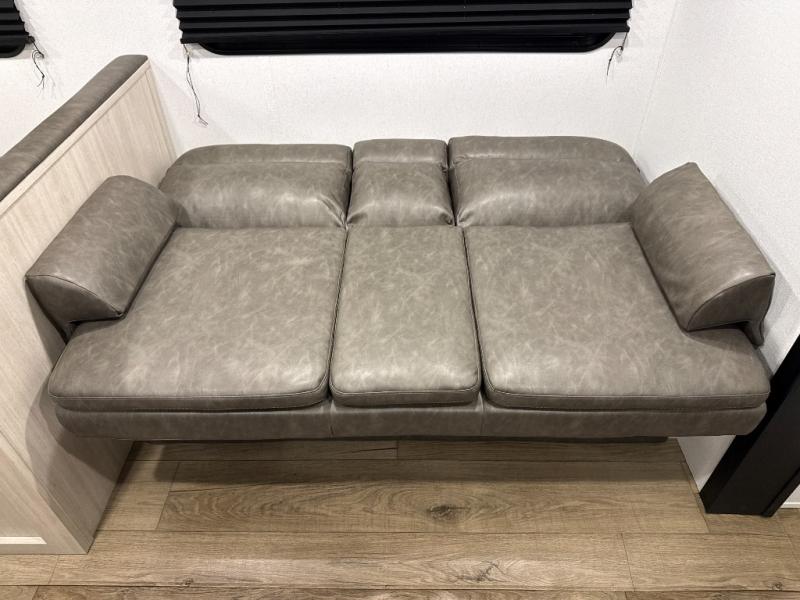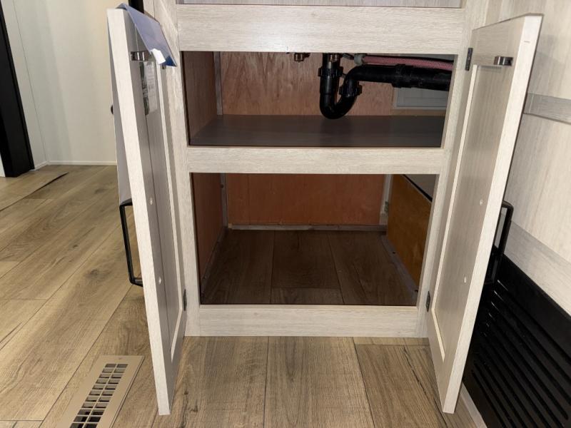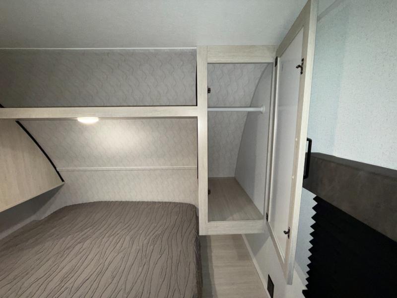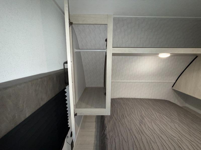 If you're looking for more space, this double axle unit features a large slide so you can walk about freely. Here, you'll find the booth dinette and sofa, which sit across from the optional TV if you want to enjoy movie nights. The full kitchen includes a stainless microwave and three burner cooktop to make meals, plus a pantry and 12V refrigerator for food storage. And an optional outside mini kitchen with a grill can be added if you enjoy cooking outdoors! Your guests or littles are sure to enjoy the rear bedroom with a queen bed, a 28" x 65" bunk, 28" x 76" bunk, a shirt closet, and a wardrobe so everything has a place!