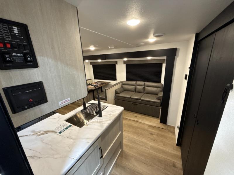 The Puma Camping Edition by Forest River offer an affordable travel trailer for rookie campers or seasoned RVers! They are built with 5/8" tongue and groove plywood flooring and a front diamond plate for added protection. There are also exterior magnetic baggage door latches, back up camera prep, a battery disconnect. Head inside to find Thermofoil countertops with a smooth drop edge, bedroom USB ports and outlets, and pleated shades in the living room.