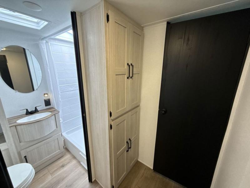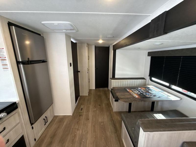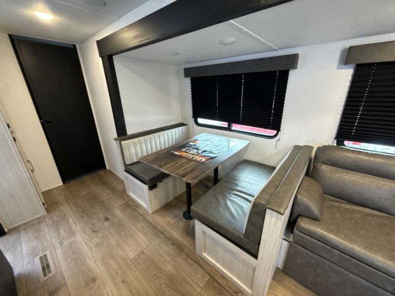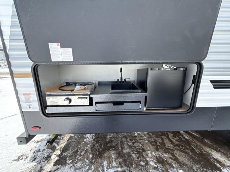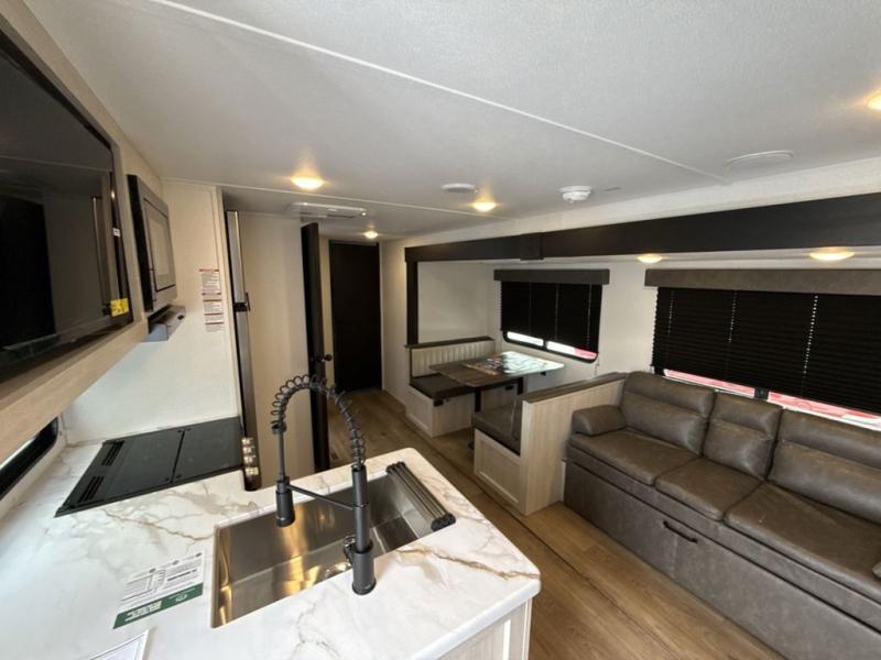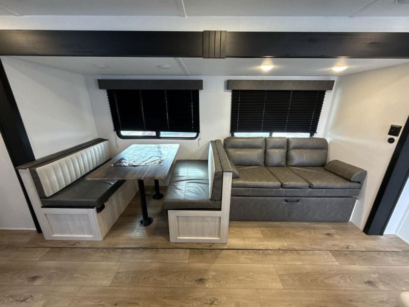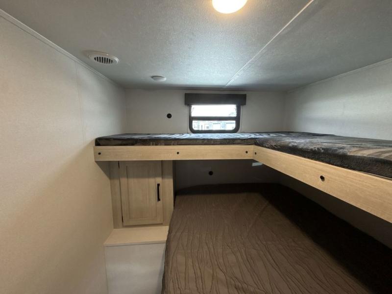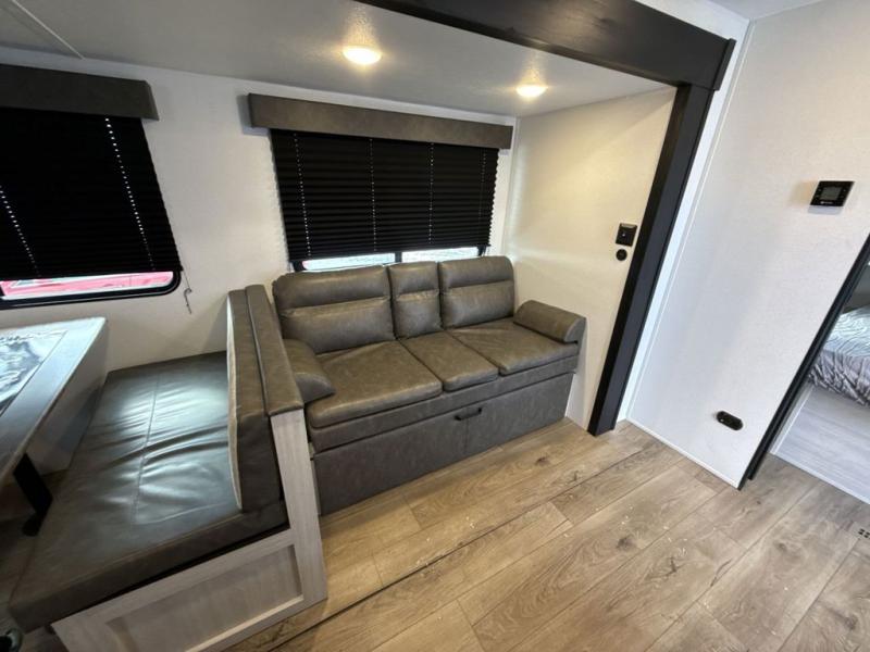If you're looking for more space, this double axle unit features a large slide so you can walk about freely. Here, you'll find the booth dinette and sofa, which sit across from the optional TV if you want to enjoy movie nights. The full kitchen includes a stainless microwave and three burner cooktop to make meals, plus a pantry and 12V refrigerator for food storage. And an optional outside mini kitchen with a grill can be added if you enjoy cooking outdoors! Your guests or littles are sure to enjoy the rear bedroom with a queen bed, a 28" x 65" bunk, 28" x 76" bunk, a shirt closet, and a wardrobe so everything has a place!