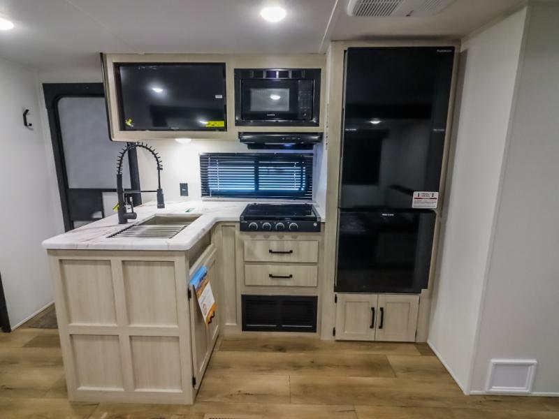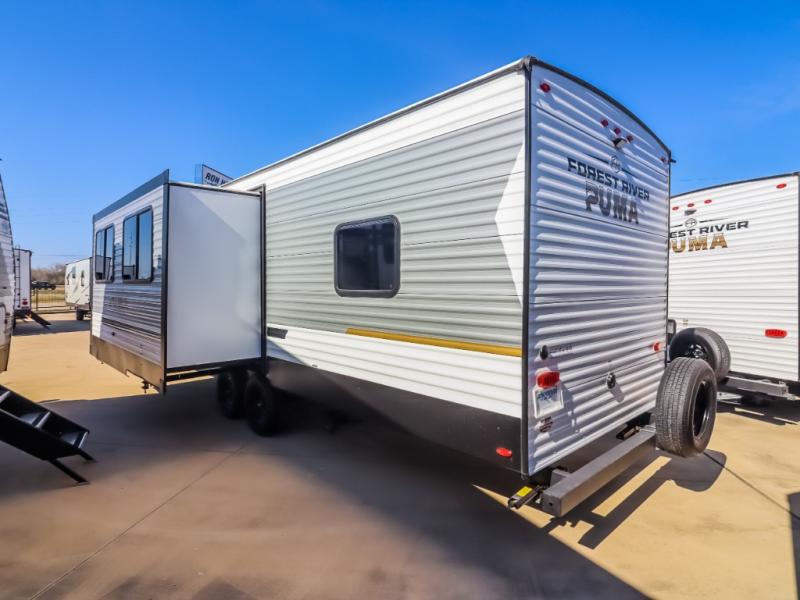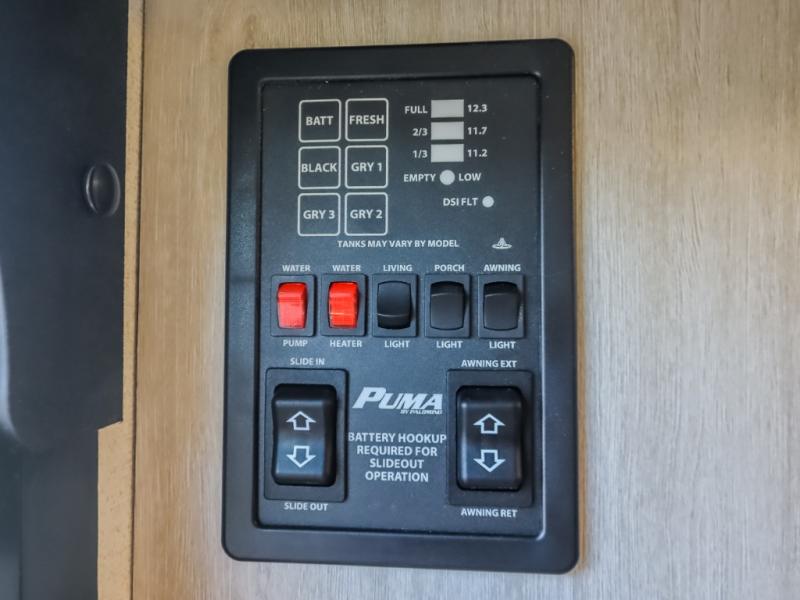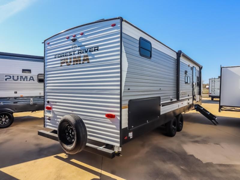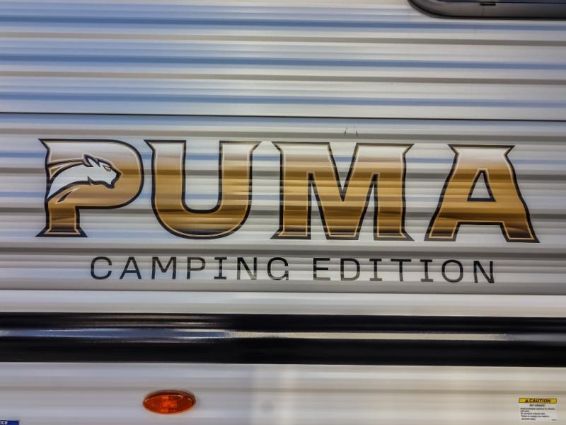 The Puma Camping Edition by Forest River offer an affordable travel trailer for rookie campers or seasoned RVers! They are built with 5/8" tongue and groove plywood flooring and a front diamond plate for added protection. There are also exterior magnetic baggage door latches, back up camera prep, a battery disconnect. Head inside to find Thermofoil countertops with a smooth drop edge, bedroom USB ports and outlets, and pleated shades in the living room.