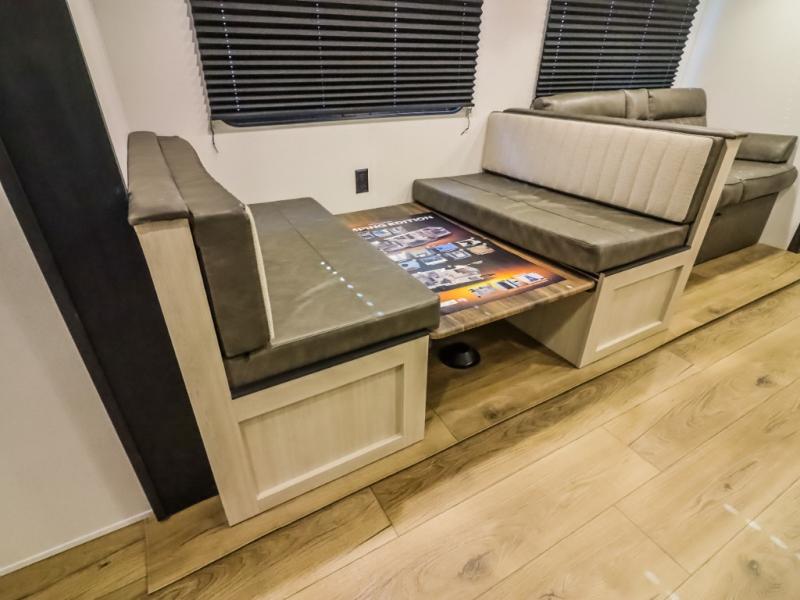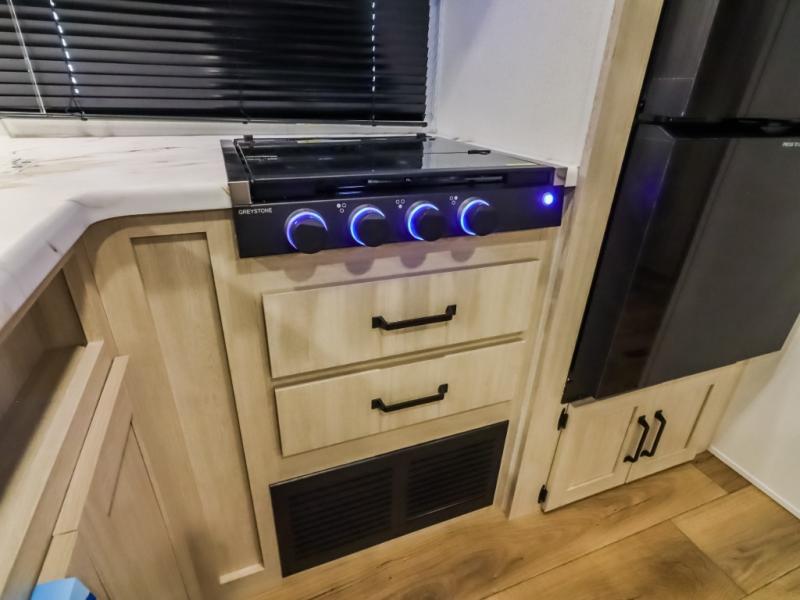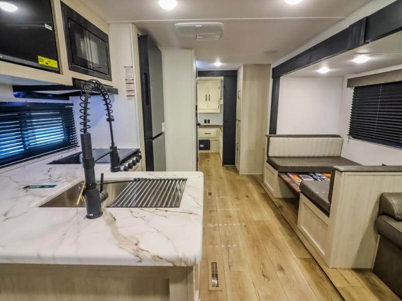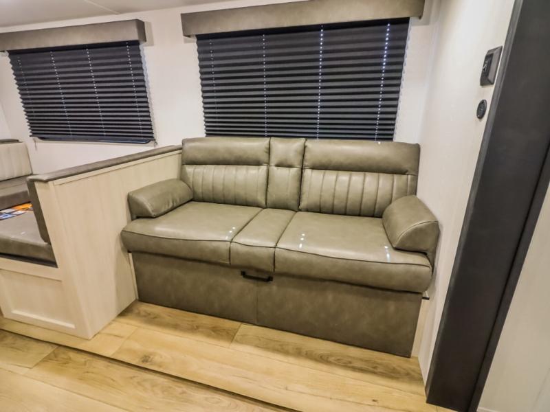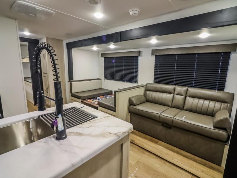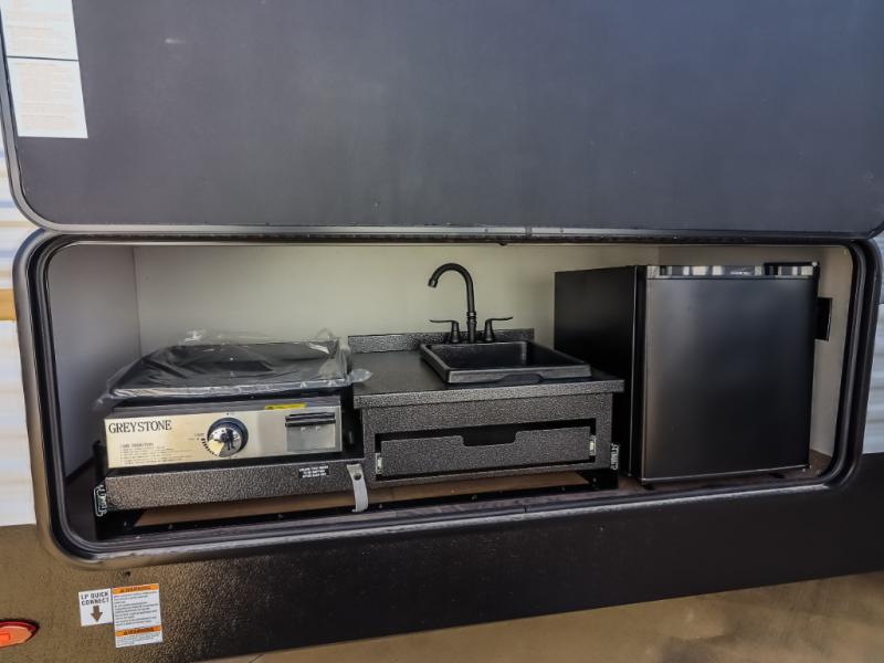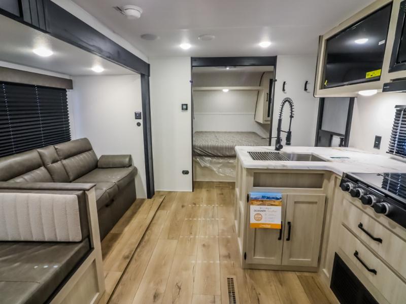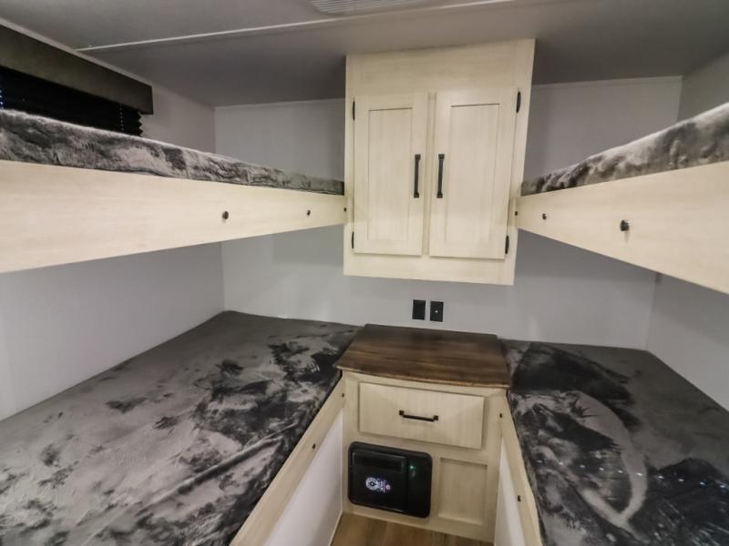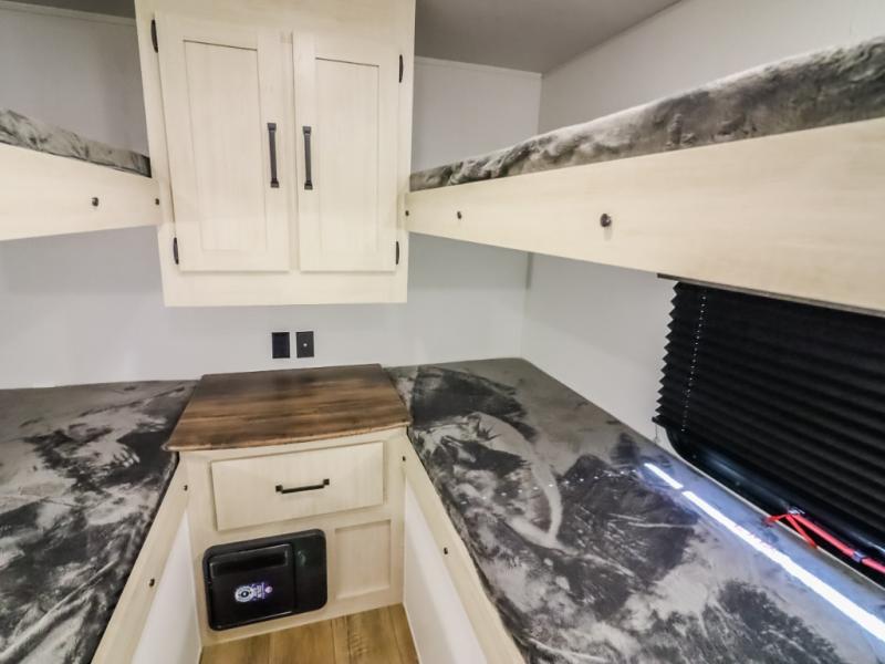 If you're looking for more space, this double axle unit features a large slide so you can walk about freely. Here, you'll find the booth dinette and sofa, which sit across from the optional TV if you want to enjoy movie nights. The full kitchen includes a stainless microwave and three burner cooktop to make meals, plus a pantry and 12V refrigerator for food storage. And an optional outside mini kitchen with a grill can be added if you enjoy cooking outdoors! Your guests or littles are sure to enjoy the rear private bunkhouse with four bunk beds and a wardrobe for their things!