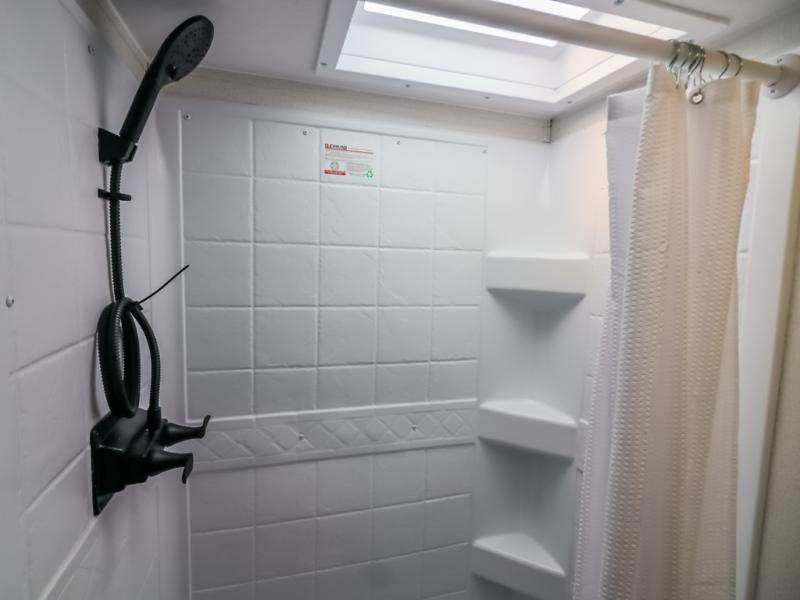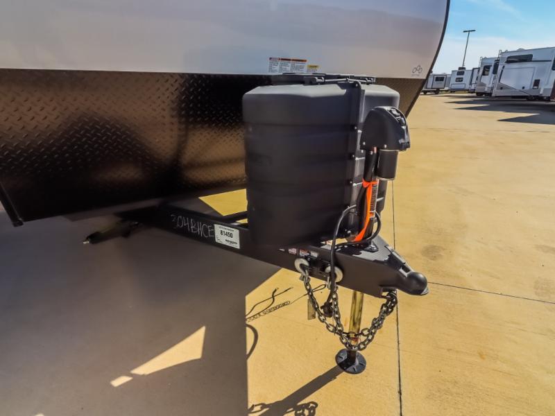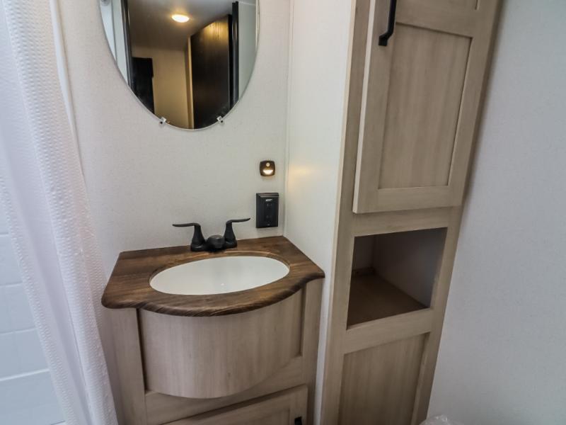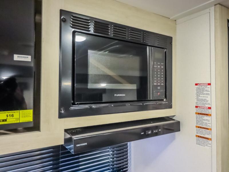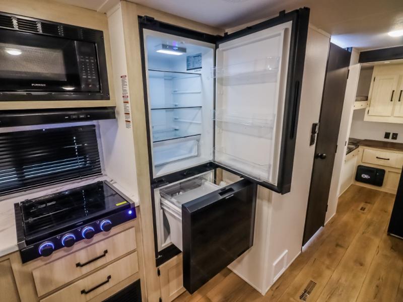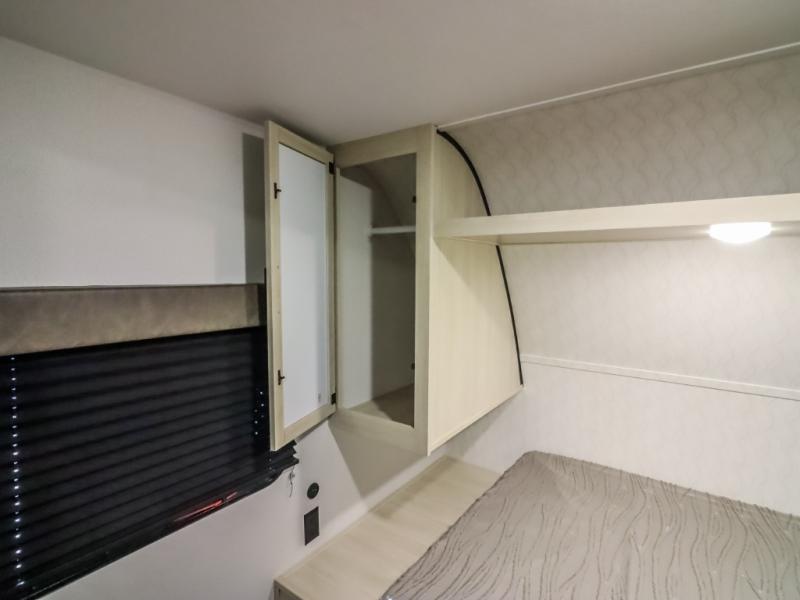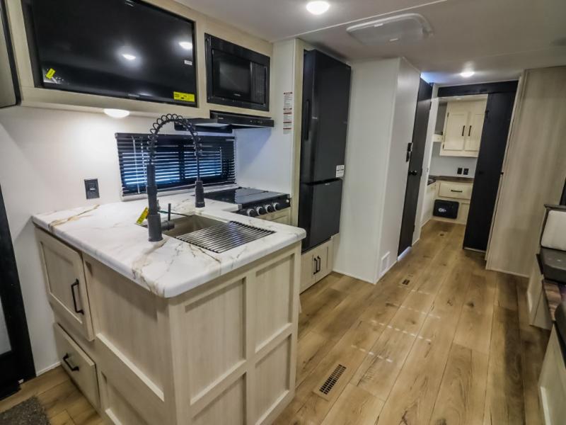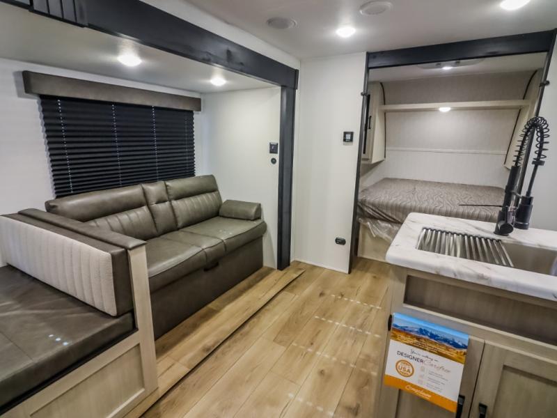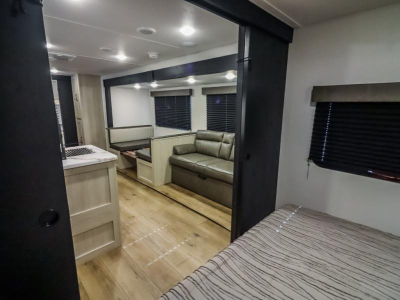 If you're looking for more space, this double axle unit features a large slide so you can walk about freely. Here, you'll find the booth dinette and sofa, which sit across from the optional TV if you want to enjoy movie nights. The full kitchen includes a stainless microwave and three burner cooktop to make meals, plus a pantry and 12V refrigerator for food storage. And an optional outside mini kitchen with a grill can be added if you enjoy cooking outdoors! Your guests or littles are sure to enjoy the rear private bunkhouse with four bunk beds and a wardrobe for their things!