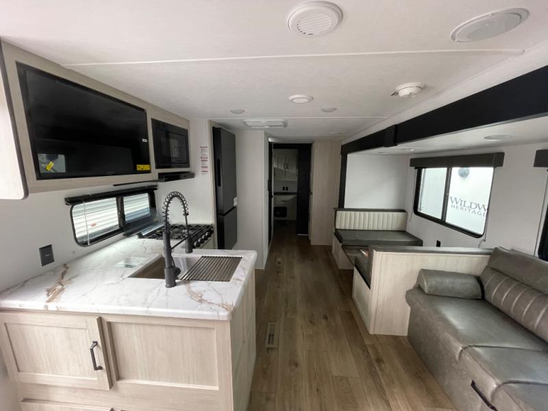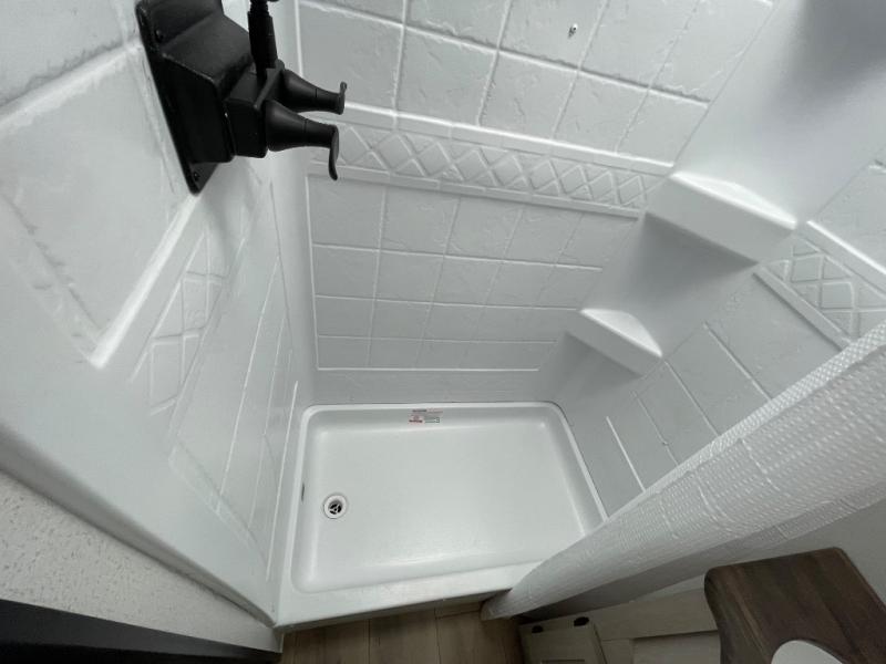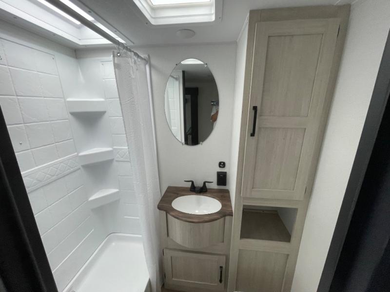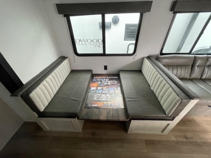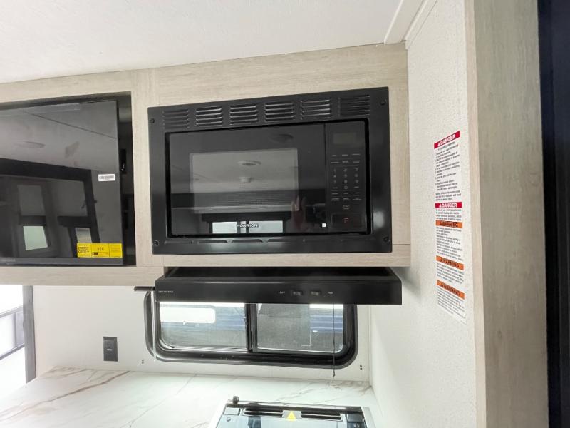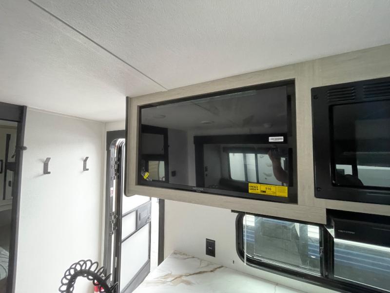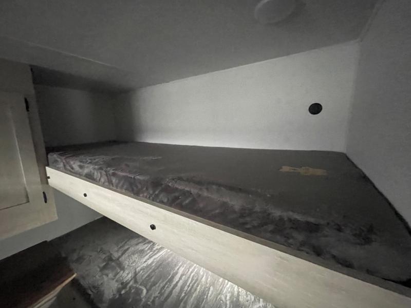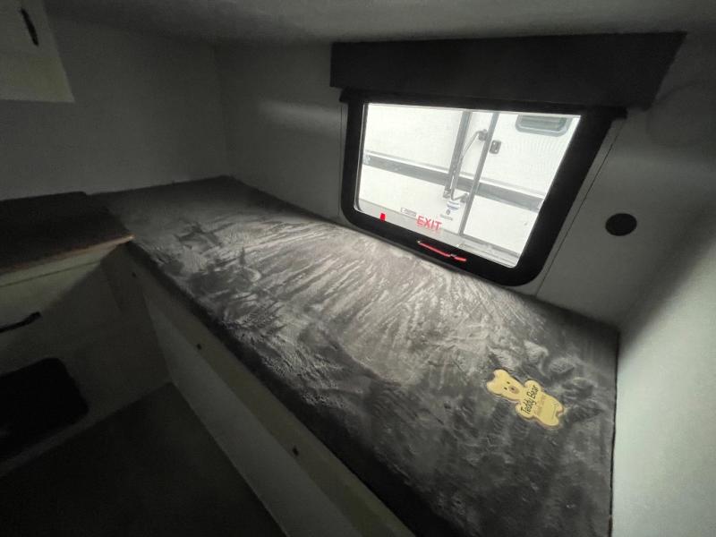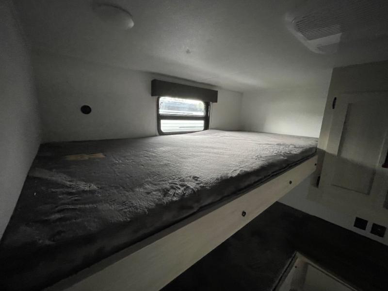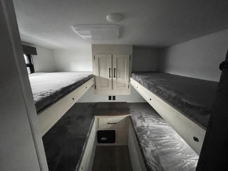 If you're looking for more space, this double axle unit features a large slide so you can walk about freely. Here, you'll find the booth dinette and sofa, which sit across from the optional TV if you want to enjoy movie nights. The full kitchen includes a stainless microwave and three burner cooktop to make meals, plus a pantry and 12V refrigerator for food storage. And an optional outside mini kitchen with a grill can be added if you enjoy cooking outdoors! Your guests or littles are sure to enjoy the rear private bunkhouse with four bunk beds and a wardrobe for their things!