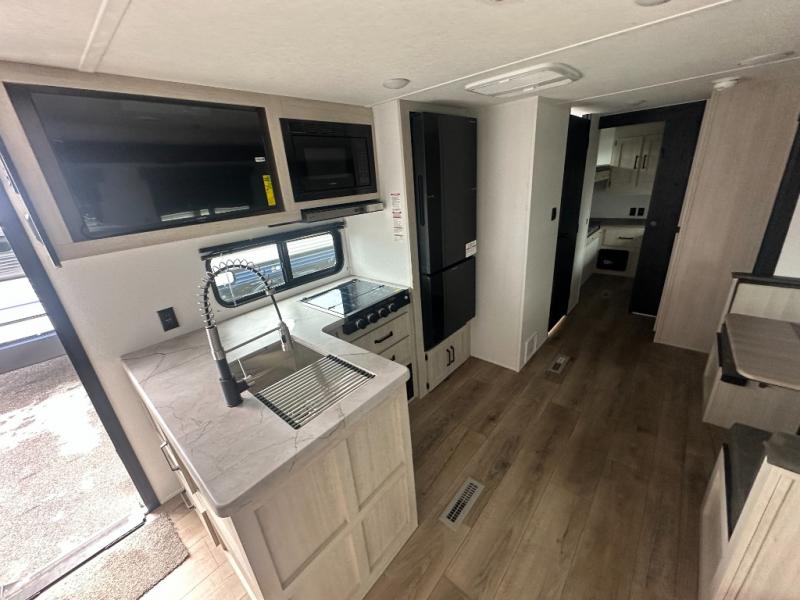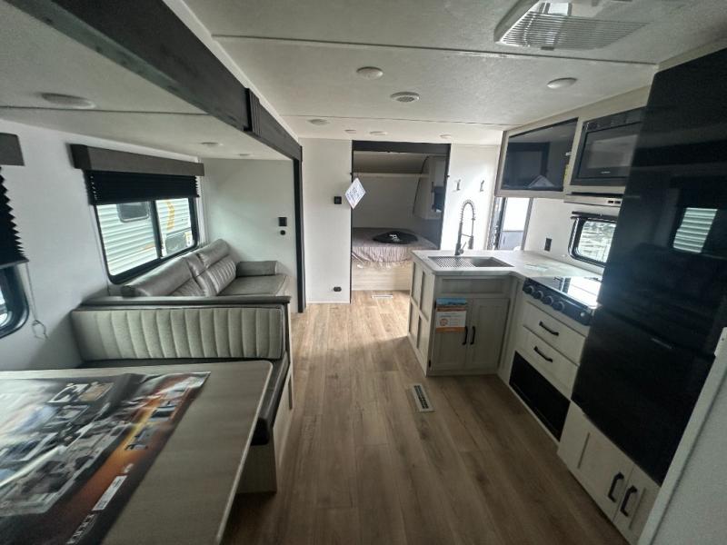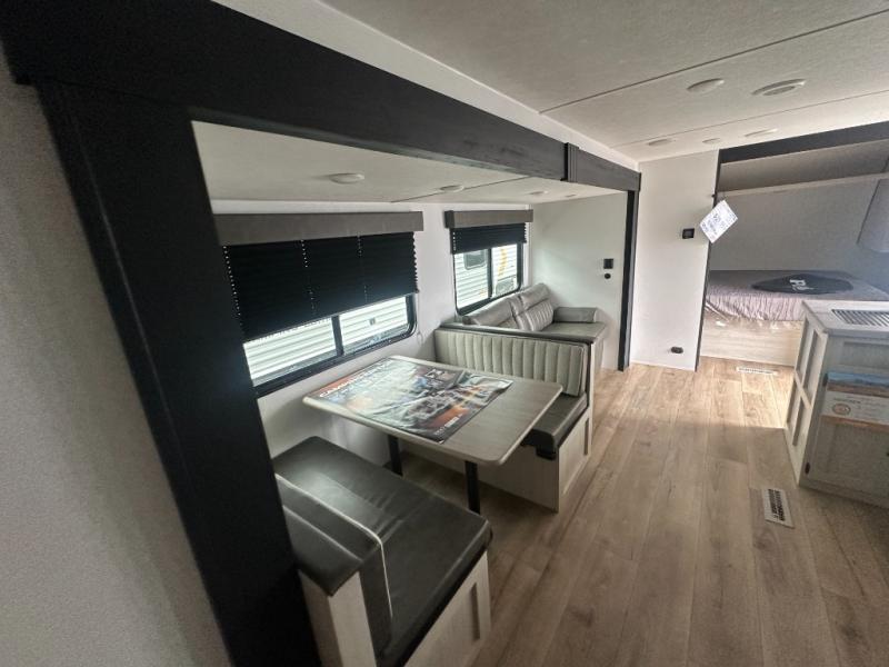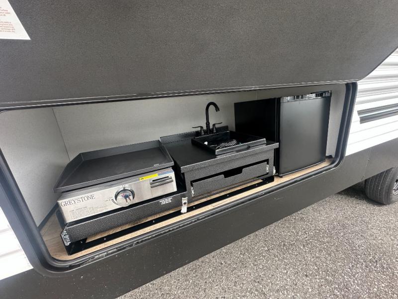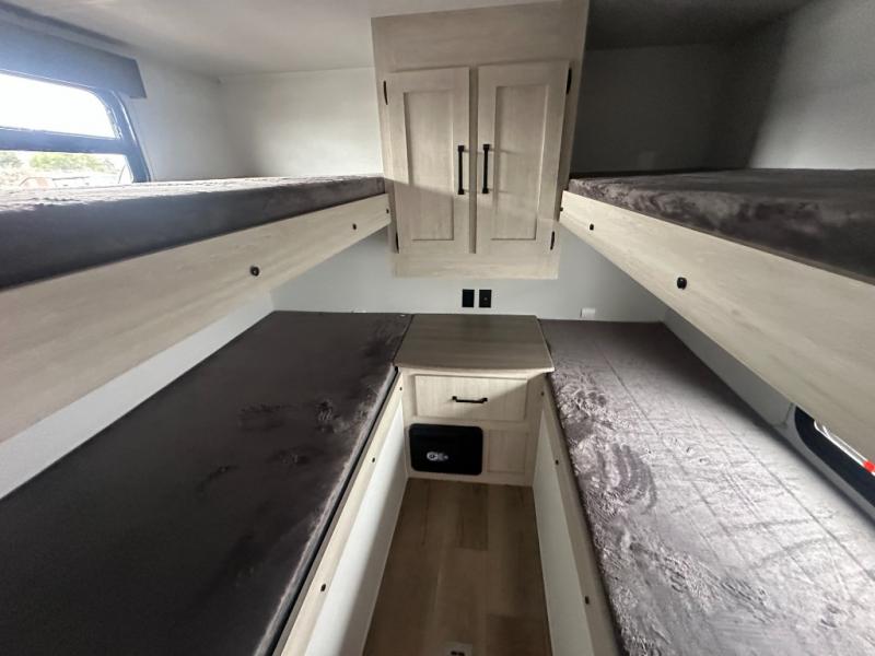 If you're looking for more space, this double axle unit features a large slide so you can walk about freely. Here, you'll find the booth dinette and sofa, which sit across from the optional TV if you want to enjoy movie nights. The full kitchen includes a stainless microwave and three burner cooktop to make meals, plus a pantry and 12V refrigerator for food storage. And an optional outside kitchen with a griddle can be added if you enjoy cooking outdoors! Your guests or littles are sure to enjoy the rear private bunkhouse with four bunk beds and a wardrobe for their things!