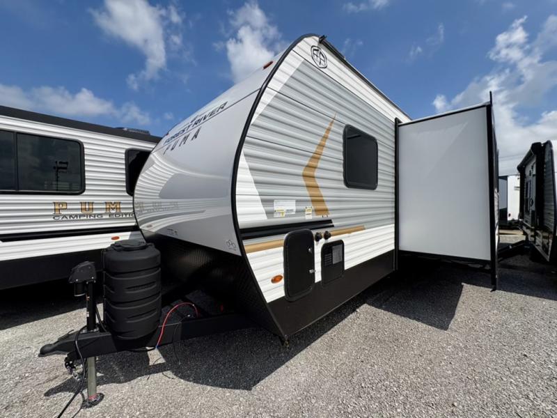 The Puma Camping Edition by Palomino offer an affordable travel trailer for rookie campers or seasoned RVers! They are built with 5/8" tongue and groove plywood flooring and a front diamond plate for added protection. There are also exterior clamp style door latches, back up camera prep, and 20 lb. LP bottles. Head inside to find Thermofoil countertops with a smooth drop edge, bedroom USB ports and outlets, and a GE appliance and kitchen package.