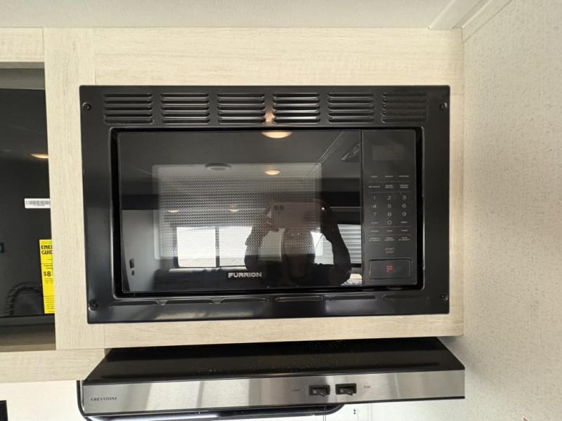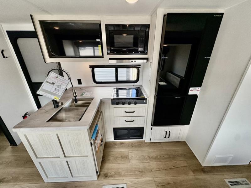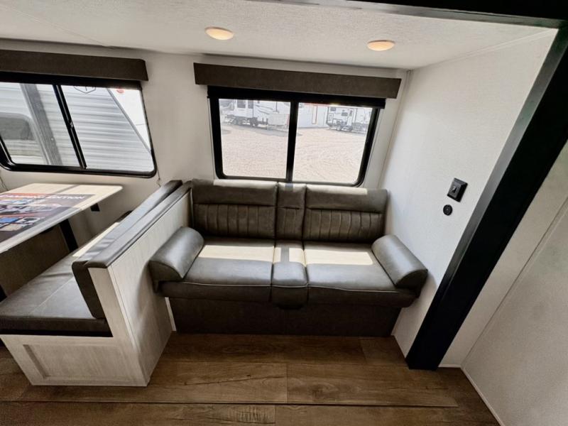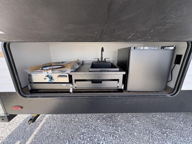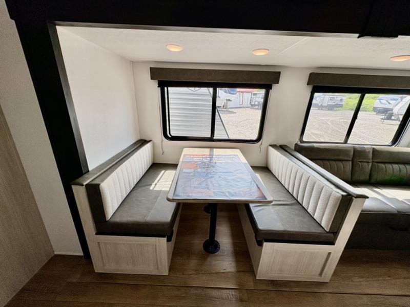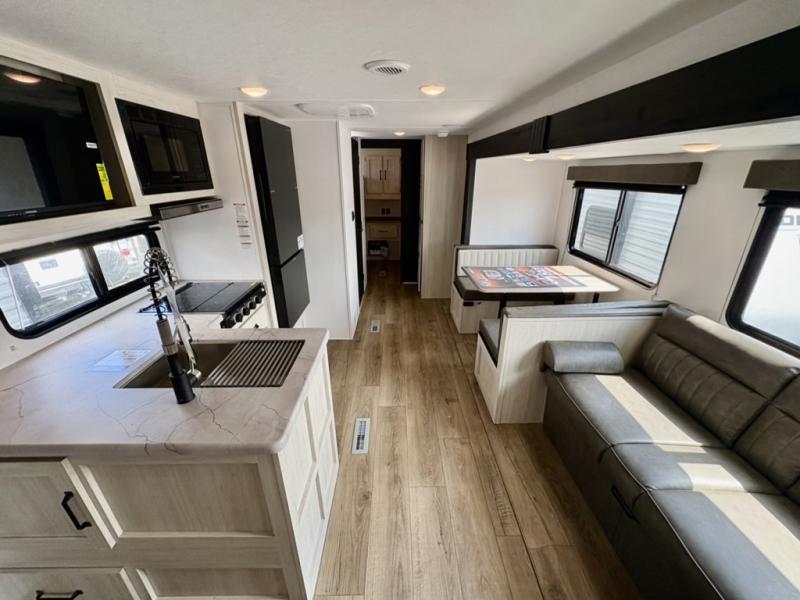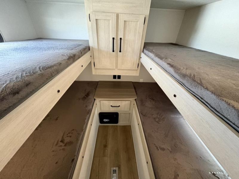 If you're looking for more space, this double axle unit features a large slide so you can walk about freely. Here, you'll find the booth dinette and sofa, which sit across from the optional TV if you want to enjoy movie nights. The full kitchen includes a stainless microwave and three burner cooktop to make meals, plus a pantry and 12V refrigerator for food storage. And an optional outside kitchen with a griddle can be added if you enjoy cooking outdoors! Your guests or littles are sure to enjoy the rear private bunkhouse with four bunk beds and a wardrobe for their things!