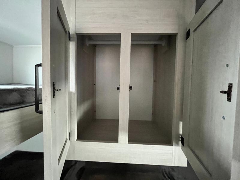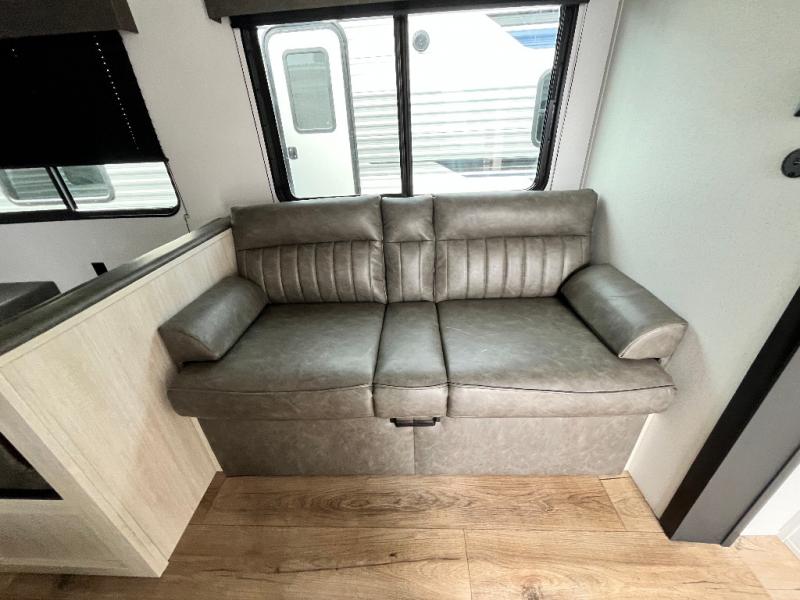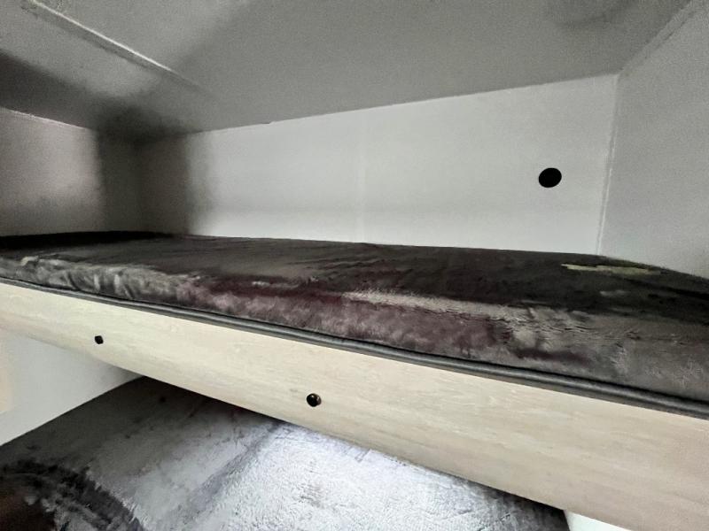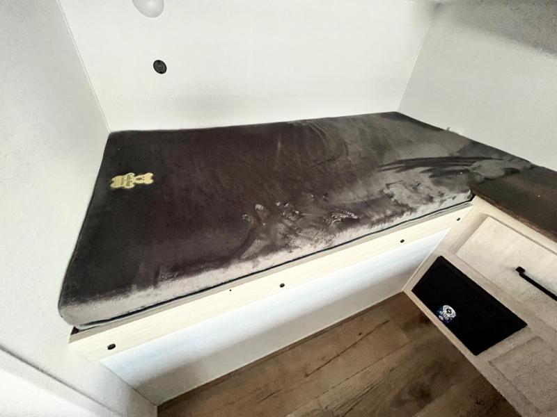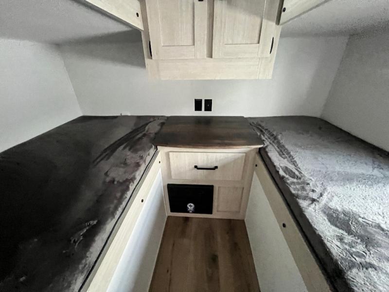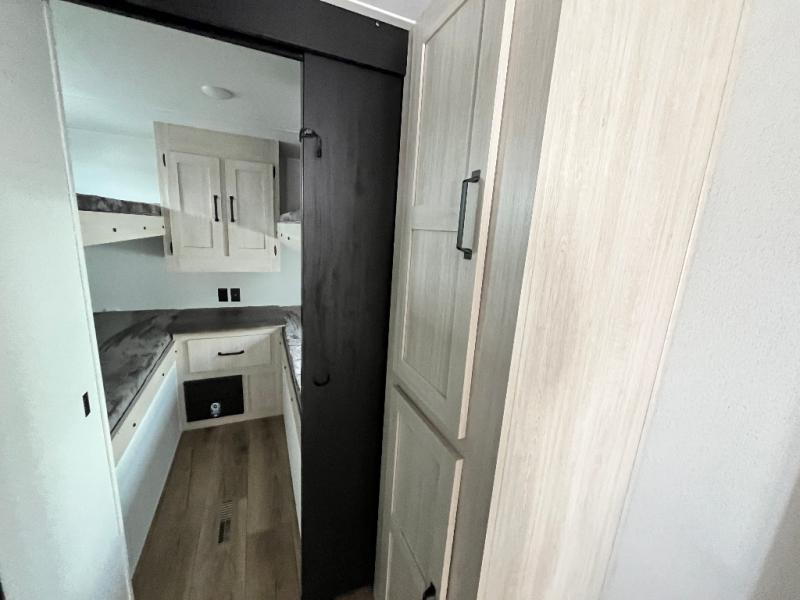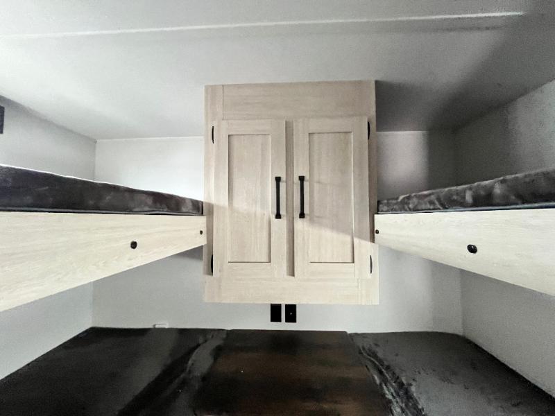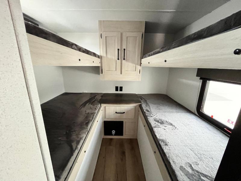 If you're looking for more space, this double axle unit features a large slide so you can walk about freely. Here, you'll find the booth dinette and sofa, which sit across from the optional TV if you want to enjoy movie nights. The full kitchen includes a stainless microwave and three burner cooktop to make meals, plus a pantry and 12V refrigerator for food storage. And an optional outside kitchen with a griddle can be added if you enjoy cooking outdoors! Your guests or littles are sure to enjoy the rear private bunkhouse with four bunk beds and a wardrobe for their things!