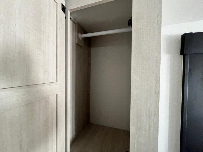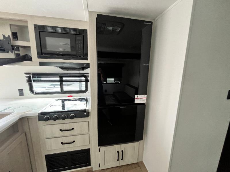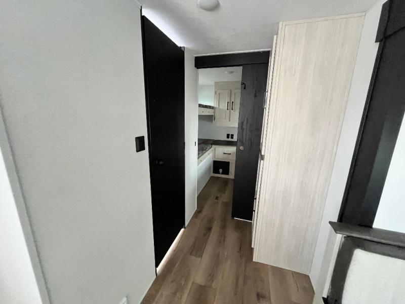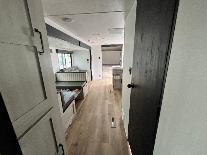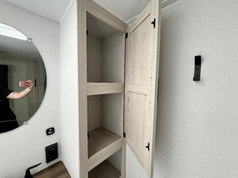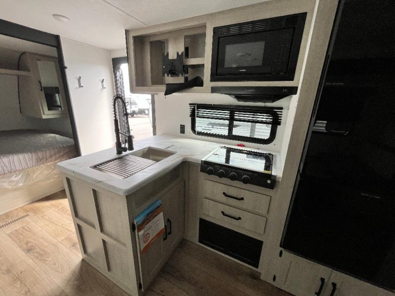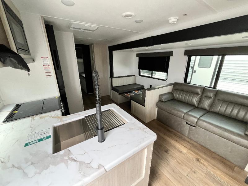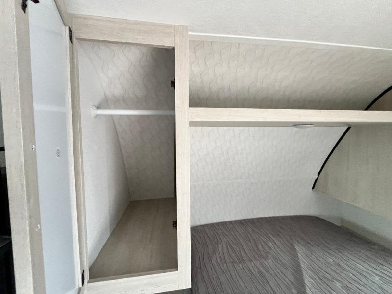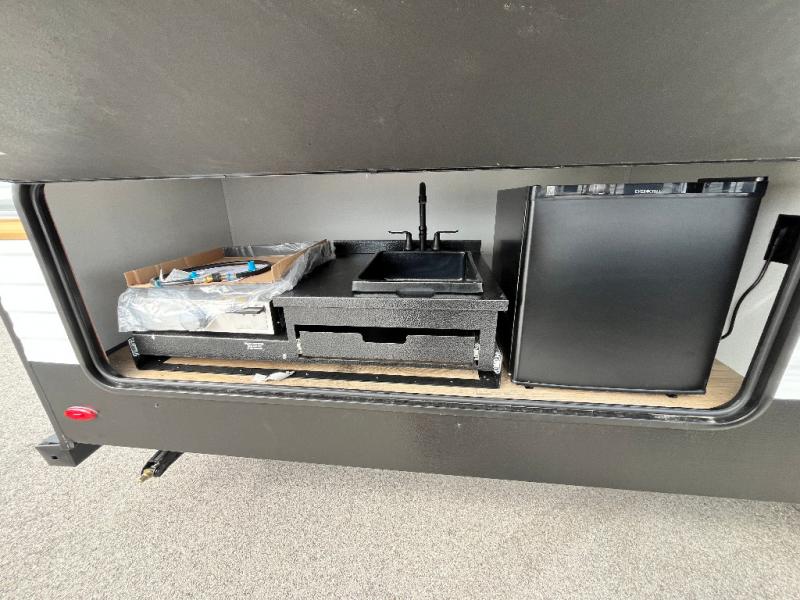 If you're looking for more space, this double axle unit features a large slide so you can walk about freely. Here, you'll find the booth dinette and sofa, which sit across from the optional TV if you want to enjoy movie nights. The full kitchen includes a stainless microwave and three burner cooktop to make meals, plus a pantry and 12V refrigerator for food storage. And an optional outside kitchen with a griddle can be added if you enjoy cooking outdoors! Your guests or littles are sure to enjoy the rear private bunkhouse with four bunk beds and a wardrobe for their things!