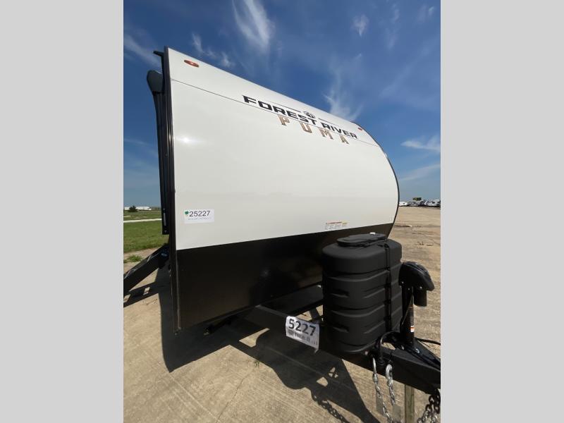 The Puma Camping Edition by Palomino offer an affordable travel trailer for rookie campers or seasoned RVers! They are built with 5/8" tongue and groove plywood flooring and a front diamond plate for added protection. There are also exterior clamp style door latches, back up camera prep, and 20 lb. LP bottles. Head inside to find Thermofoil countertops with a smooth drop edge, bedroom USB ports and outlets, and a GE appliance and kitchen package.