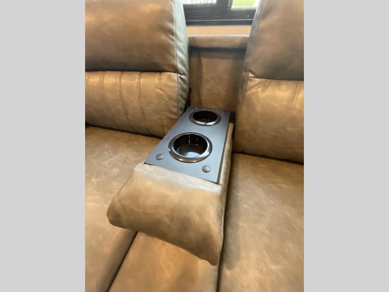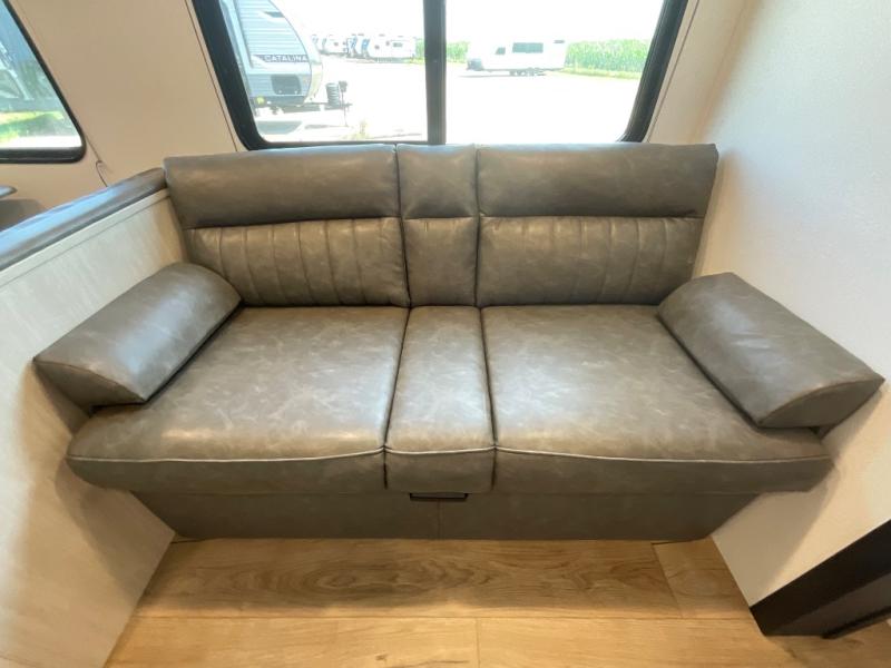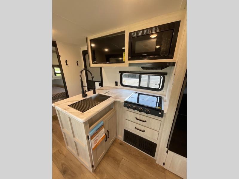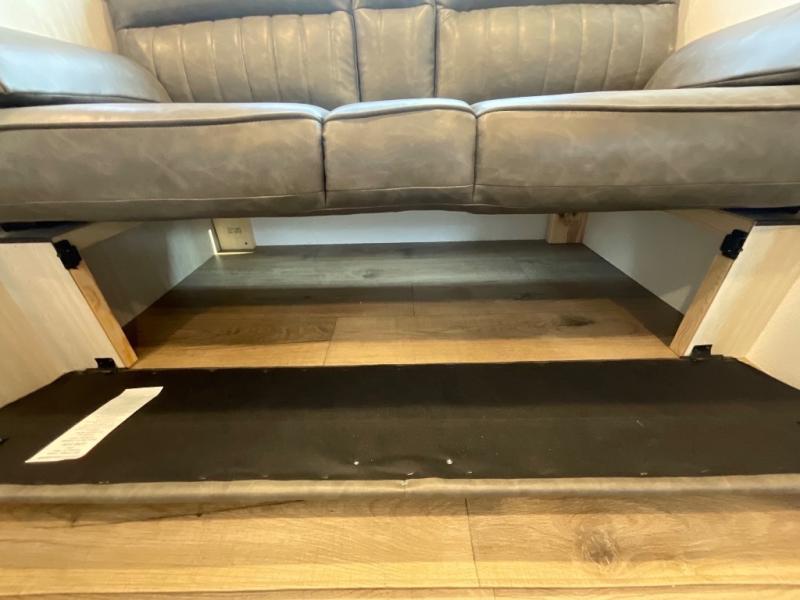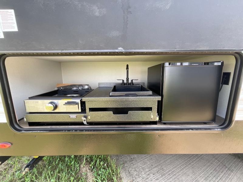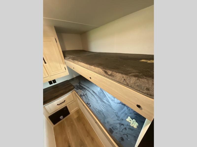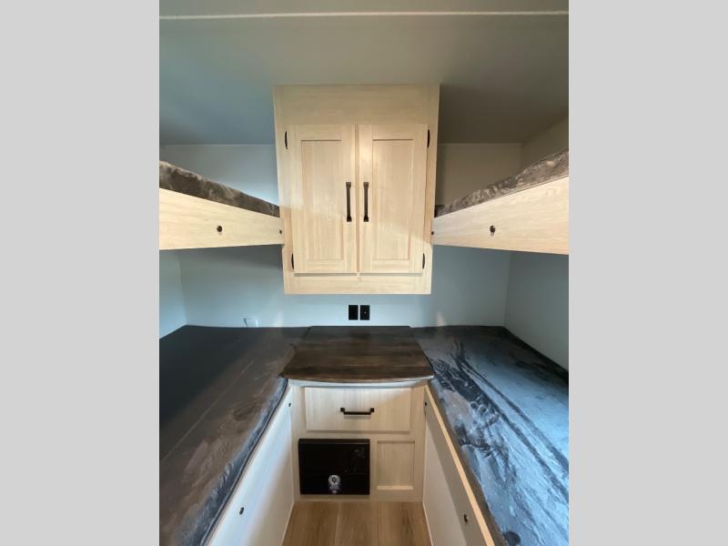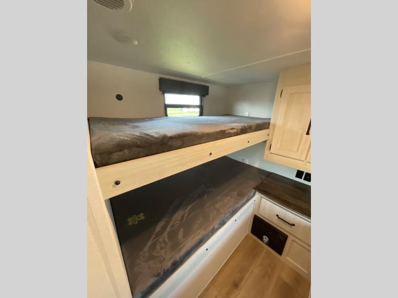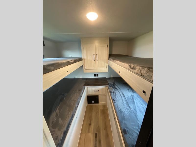If you're looking for more space, this double axle unit features a large slide so you can walk about freely. Here, you'll find the booth dinette and sofa, which sit across from the optional TV if you want to enjoy movie nights. The full kitchen includes a stainless microwave and three burner cooktop to make meals, plus a pantry and 12V refrigerator for food storage. And an optional outside kitchen with a griddle can be added if you enjoy cooking outdoors! Your guests or littles are sure to enjoy the rear private bunkhouse with four bunk beds and a wardrobe for their things!