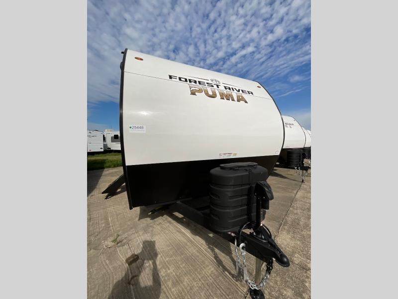 The Puma Camping Edition by Palomino offer an affordable travel trailer for rookie campers or seasoned RVers! They are built with 5/8" tongue and groove plywood flooring and a front diamond plate for added protection. There are also exterior clamp style door latches, back up camera prep, and 20 lb. LP bottles. Head inside to find Thermofoil countertops with a smooth drop edge, bedroom USB ports and outlets, and a GE appliance and kitchen package.