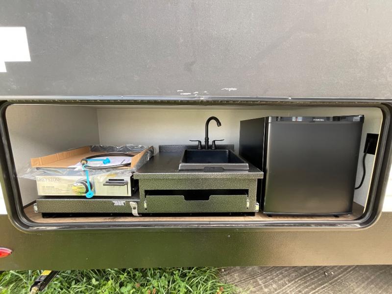 If you're looking for more space, this double axle unit features a large slide so you can walk about freely. Here, you'll find the booth dinette and sofa, which sit across from the optional TV if you want to enjoy movie nights. The full kitchen includes a stainless microwave and three burner cooktop to make meals, plus a pantry and 12V refrigerator for food storage. And an optional outside kitchen with a griddle can be added if you enjoy cooking outdoors! Your guests or littles are sure to enjoy the rear private bunkhouse with four bunk beds and a wardrobe for their things!
