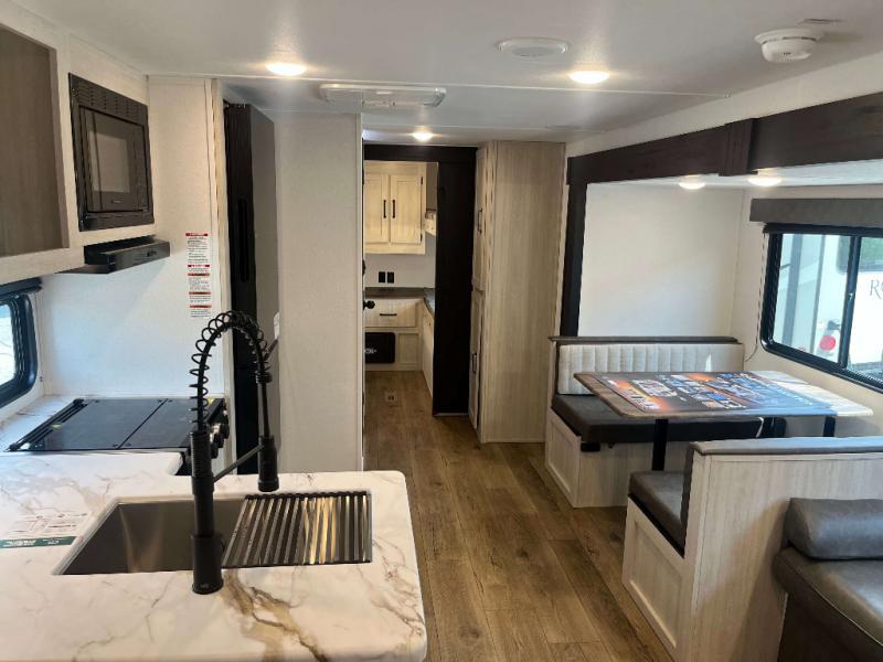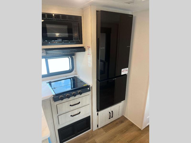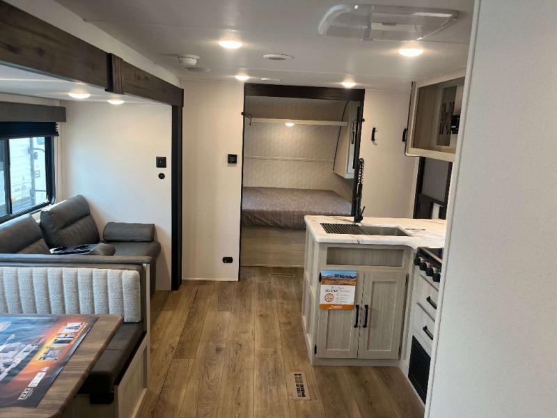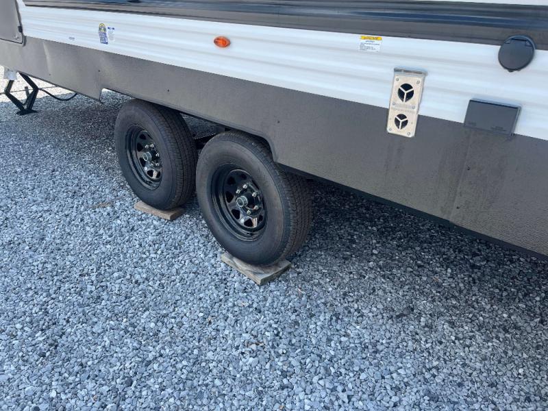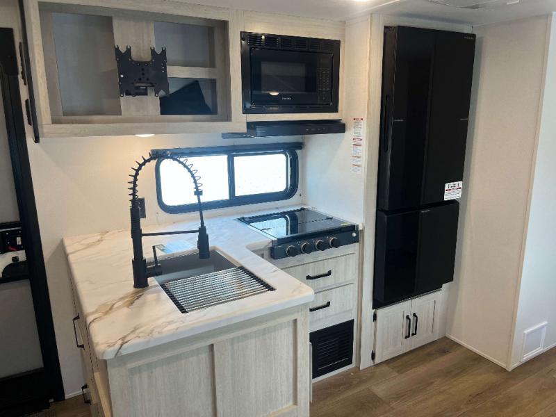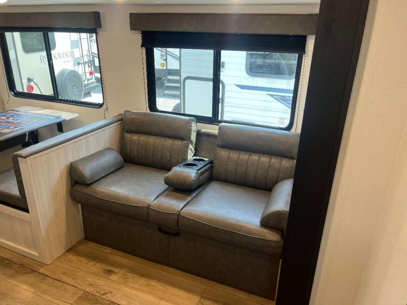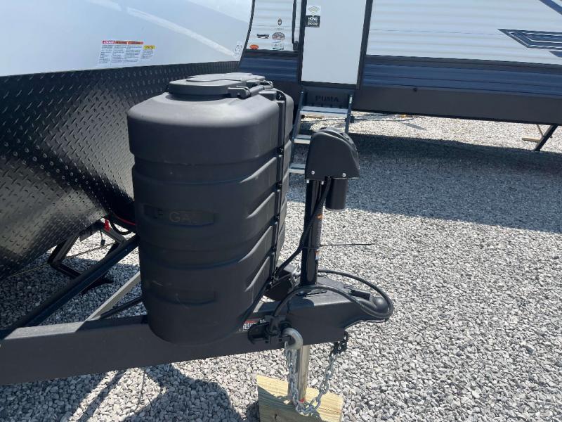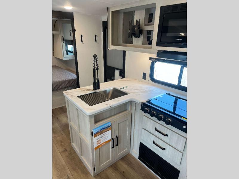 JIFFY SOFA W/ FLIP DOWN CUPHOLDER AND EASY ACCESS STORAGE (PER FLOORPLAN), BEDROOM USB AND OUTLETS, NIGHTSHADES IN LIVING ROOM, APPLIANCE AND KITCHEN PACKAGE, BLACK GLASS 12V REFER, MICROWAVE, 3-BURNER COOK TOP WITH METAL BACK-LIT KNOBS, 13,500 BTU HIGH EFFICIENCY A/C, 6 GALLON GAS/ELECTRIC WATER HEATER, THERMOFOIL COUNTERTOPS W/ SMOOTH DROP EDGE, DEEP BASIN FARM STYLE SINK - CAMPING EDITION EXTERIOR PACKAGE