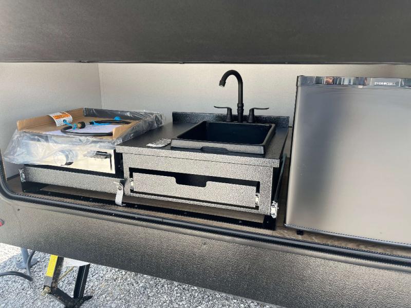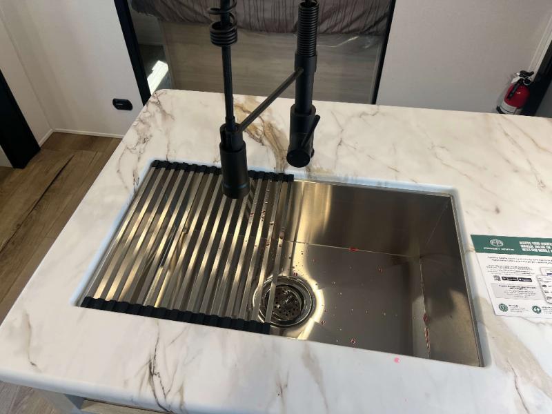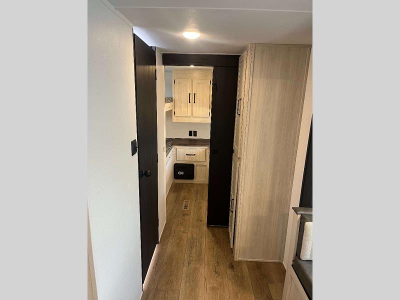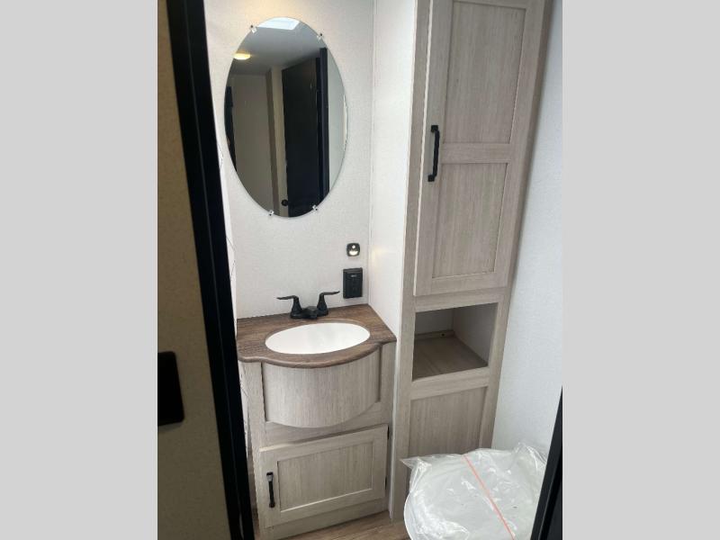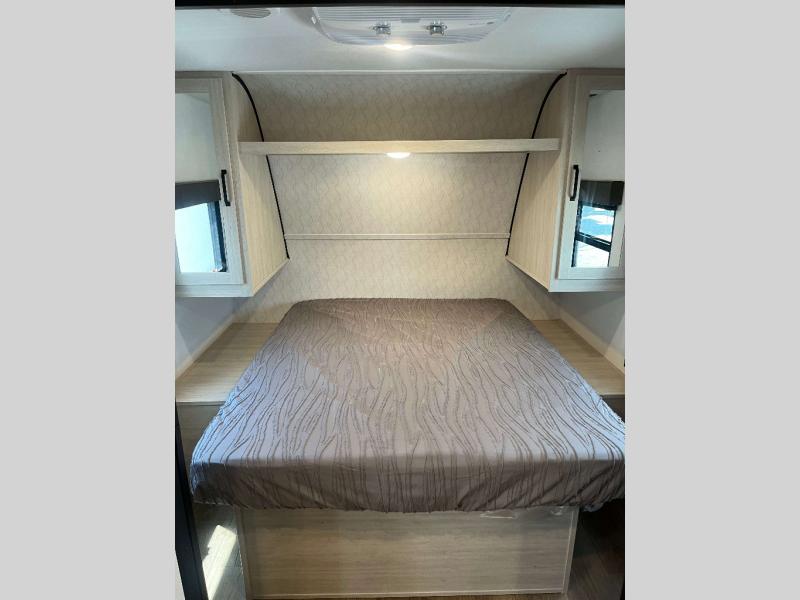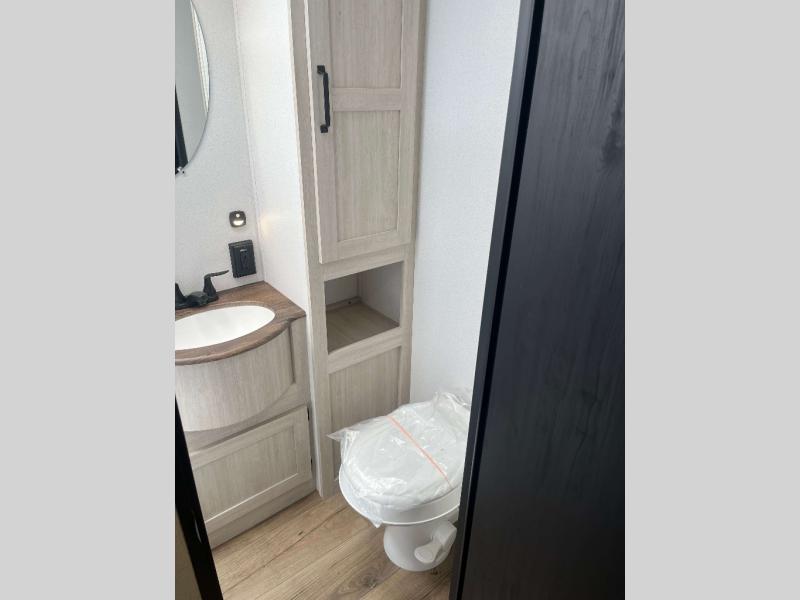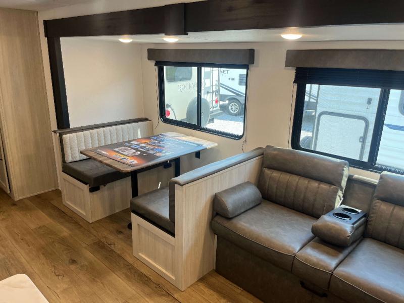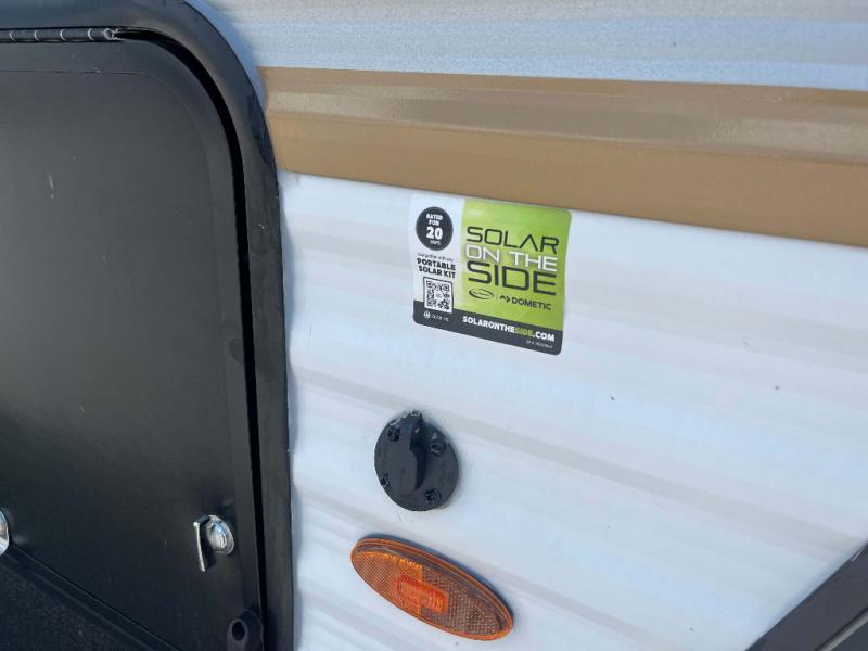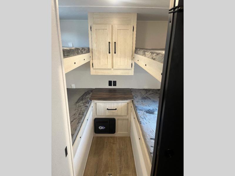 JIFFY SOFA W/ FLIP DOWN CUPHOLDER AND EASY ACCESS STORAGE (PER FLOORPLAN), BEDROOM USB AND OUTLETS, NIGHTSHADES IN LIVING ROOM, APPLIANCE AND KITCHEN PACKAGE, BLACK GLASS 12V REFER, MICROWAVE, 3-BURNER COOK TOP WITH METAL BACK-LIT KNOBS, 13,500 BTU HIGH EFFICIENCY A/C, 6 GALLON GAS/ELECTRIC WATER HEATER, THERMOFOIL COUNTERTOPS W/ SMOOTH DROP EDGE, DEEP BASIN FARM STYLE SINK - CAMPING EDITION EXTERIOR PACKAGE