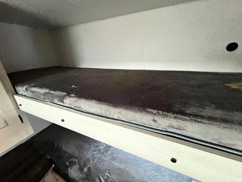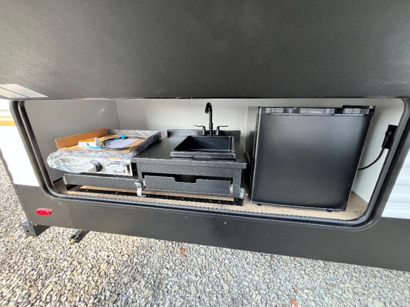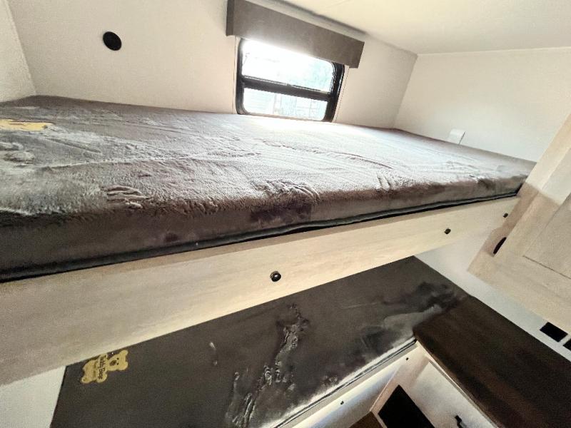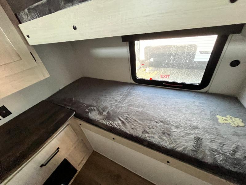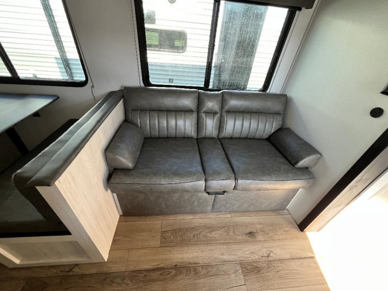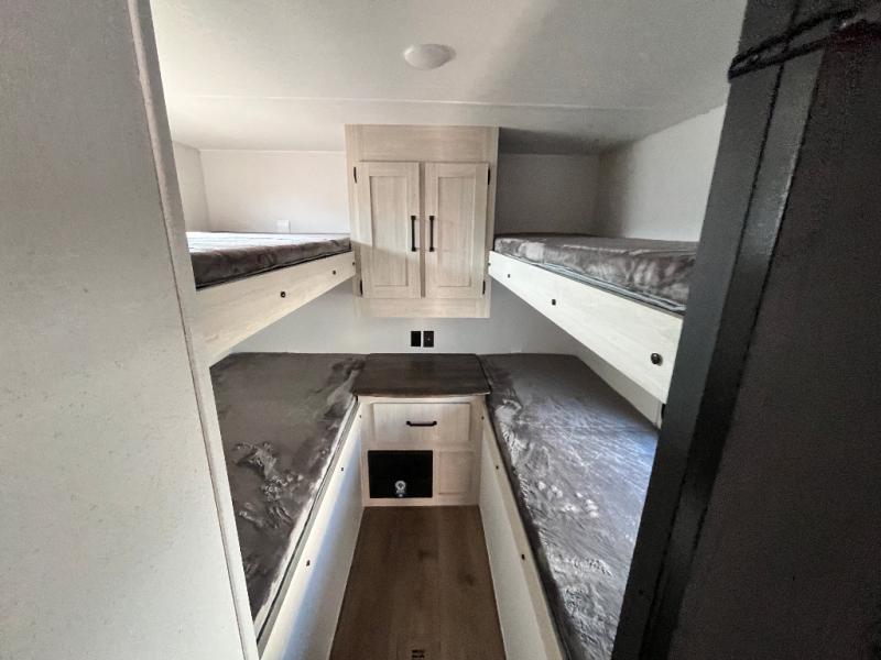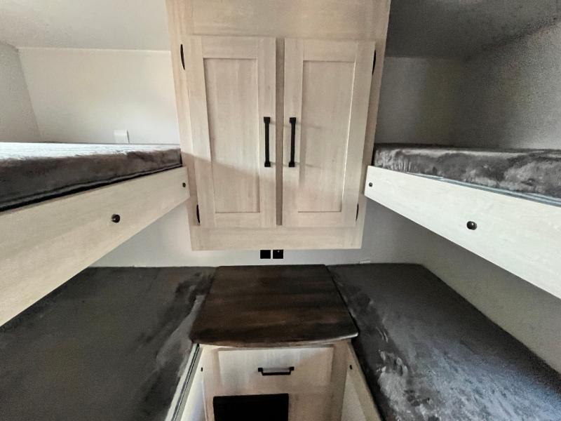 If you're looking for more space, this double axle unit features a large slide so you can walk about freely. Here, you'll find the booth dinette and sofa, which sit across from the optional TV if you want to enjoy movie nights. The full kitchen includes a stainless microwave and three burner cooktop to make meals, plus a pantry and 12V refrigerator for food storage. And an optional outside kitchen with a griddle can be added if you enjoy cooking outdoors! Your guests or littles are sure to enjoy the rear private bunkhouse with four bunk beds and a wardrobe for their things!