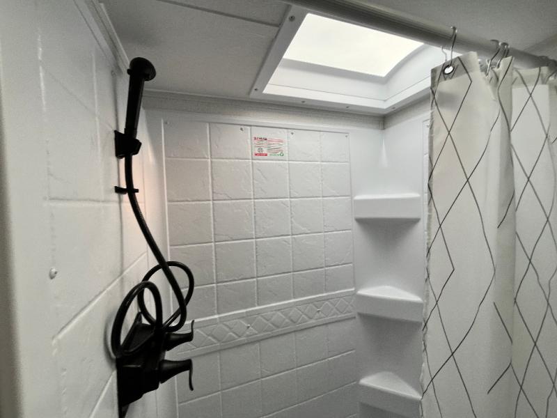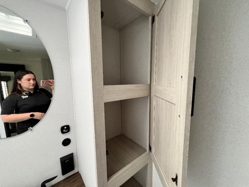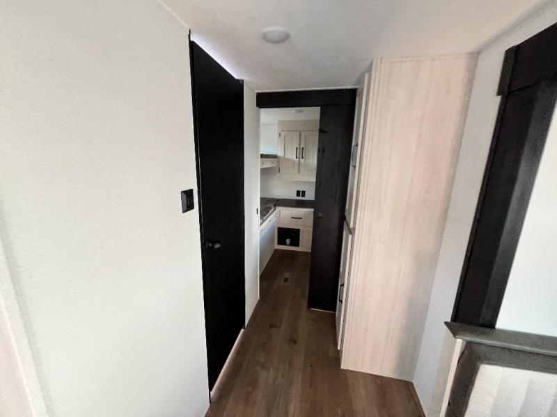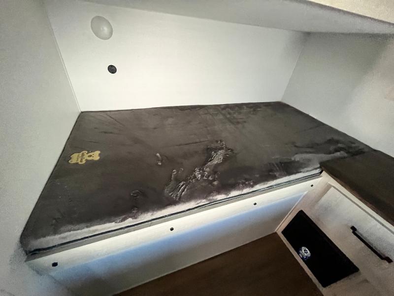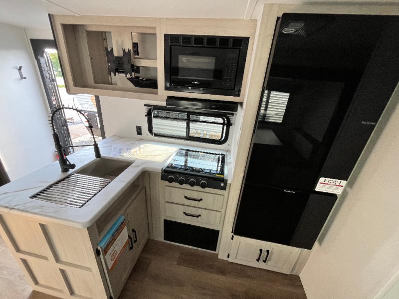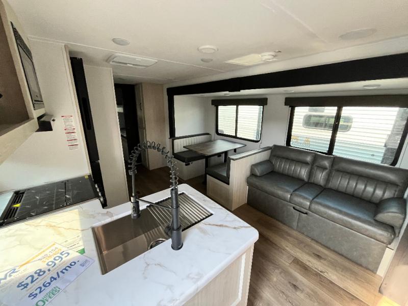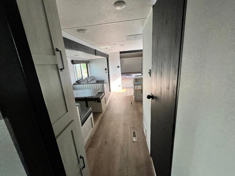 If you're looking for more space, this double axle unit features a large slide so you can walk about freely. Here, you'll find the booth dinette and sofa, which sit across from the optional TV if you want to enjoy movie nights. The full kitchen includes a stainless microwave and three burner cooktop to make meals, plus a pantry and 12V refrigerator for food storage. And an optional outside kitchen with a griddle can be added if you enjoy cooking outdoors! Your guests or littles are sure to enjoy the rear private bunkhouse with four bunk beds and a wardrobe for their things!