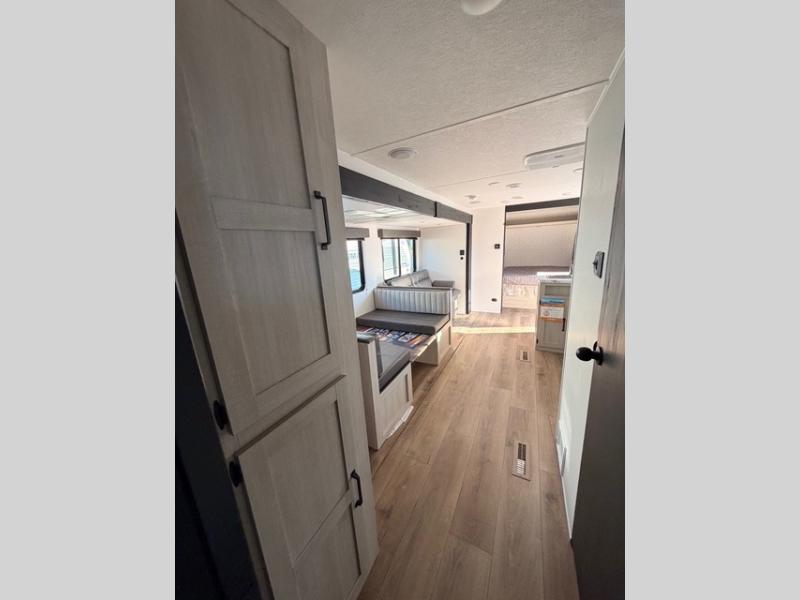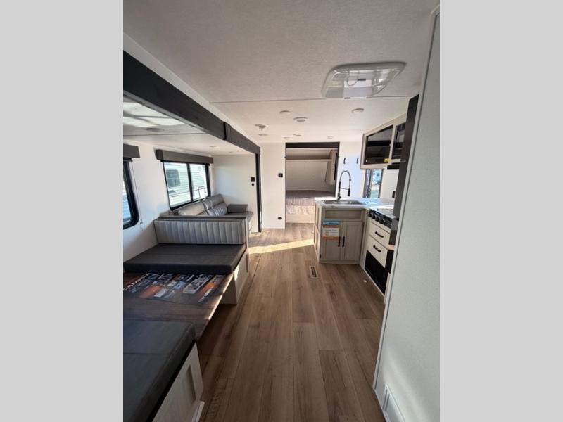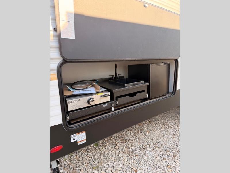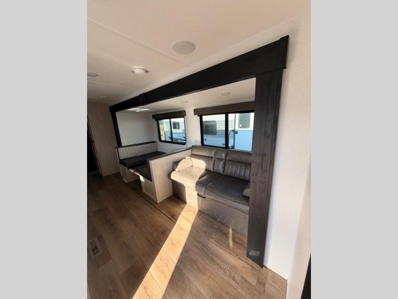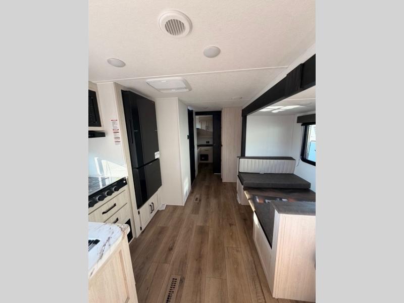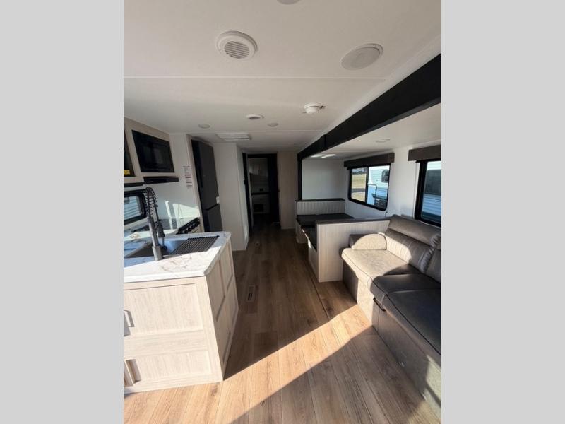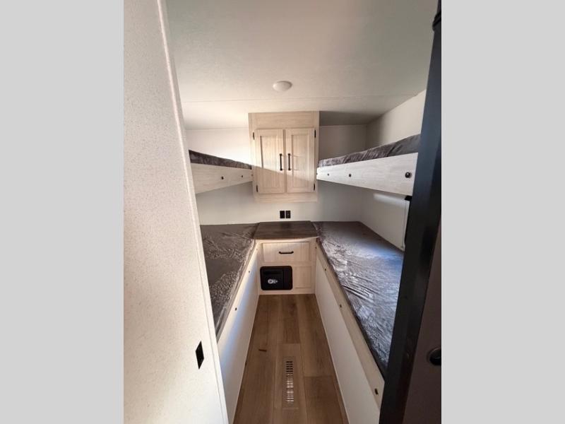 If you're looking for more space, this double axle unit features a large slide so you can walk about freely. Here, you'll find the booth dinette and sofa, which sit across from the optional TV if you want to enjoy movie nights. The full kitchen includes a stainless microwave and three burner cooktop to make meals, plus a pantry and 12V refrigerator for food storage. And an optional outside kitchen with a griddle can be added if you enjoy cooking outdoors! Your guests or littles are sure to enjoy the rear private bunkhouse with four bunk beds and a wardrobe for their things!