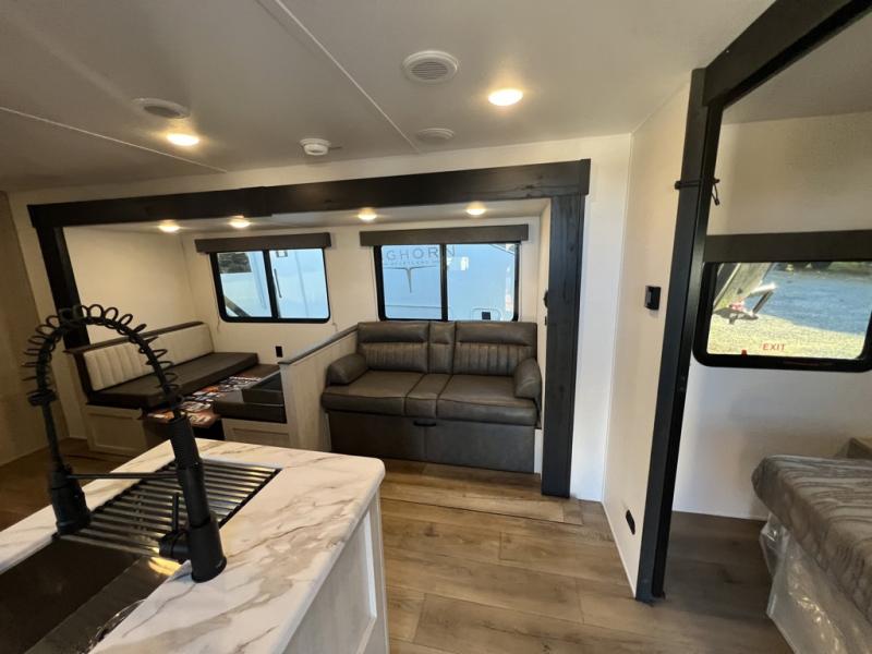 If you're looking for more space, this double axle unit features a large slide so you can walk about freely. Here, you'll find the booth dinette and sofa, which sit across from the optional TV if you want to enjoy movie nights. The full kitchen includes a stainless microwave and three burner cooktop to make meals, plus a pantry and 12V refrigerator for food storage. And an optional outside kitchen with a griddle can be added if you enjoy cooking outdoors! Your guests or littles are sure to enjoy the rear private bunkhouse with four bunk beds and a wardrobe for their things!