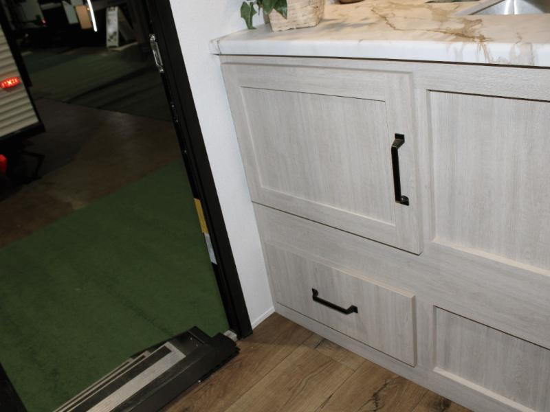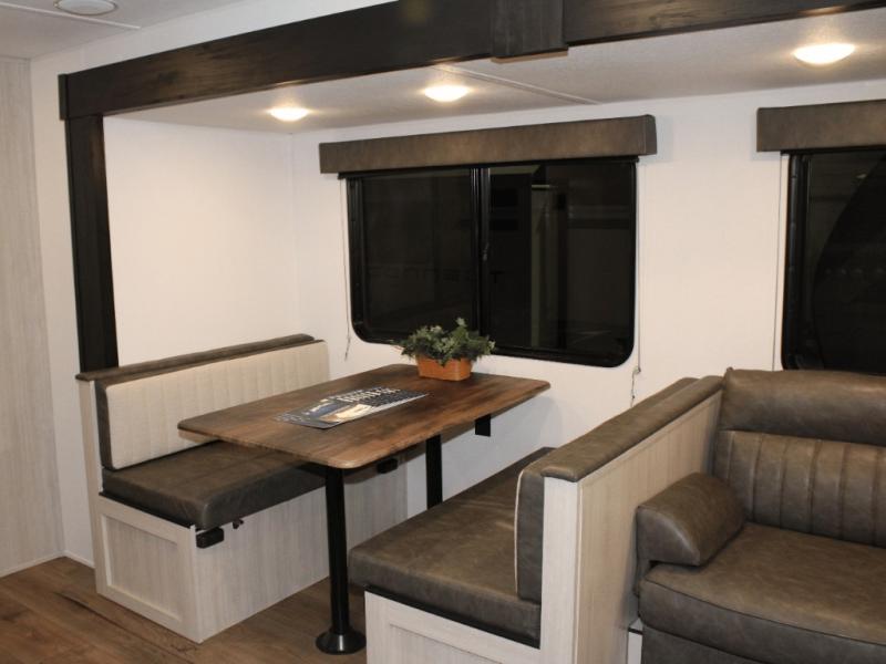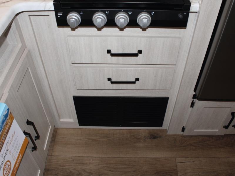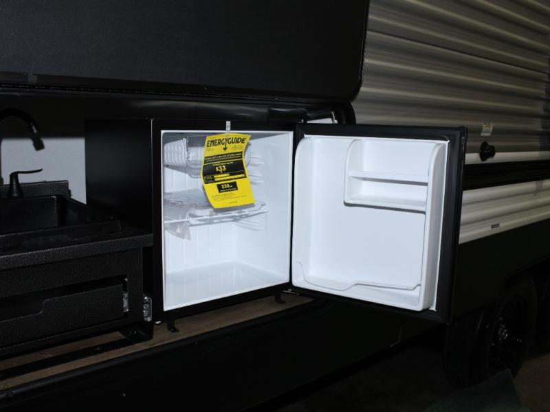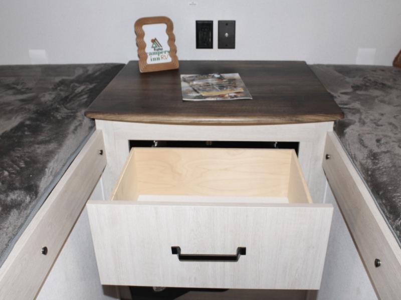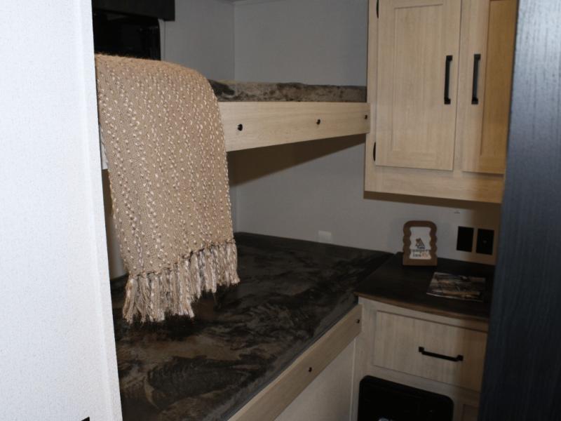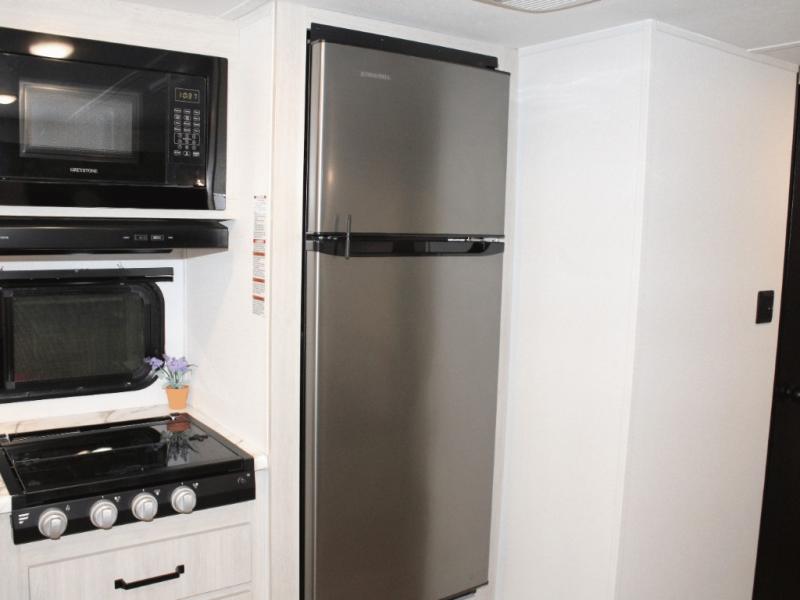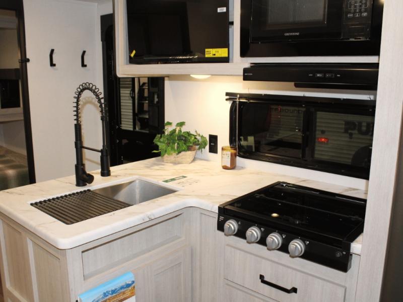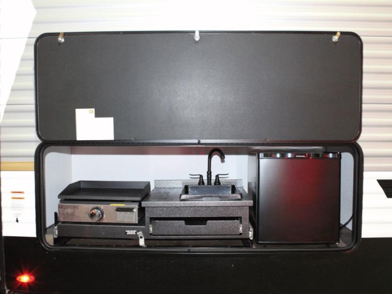 Step inside and enjoy the large slide-out that opens up the living space, giving you room to move freely. The booth dinette and sofa sit across from an optional TV, creating the ideal space for meals, games, and movie nights. The full kitchen features a three-burner cooktop, stainless microwave, 12V refrigerator, and pantry—making it easy to prepare home-cooked meals wherever your travels take you. For those who love cooking outdoors, an optional mini kitchen with a grill adds even more versatility.