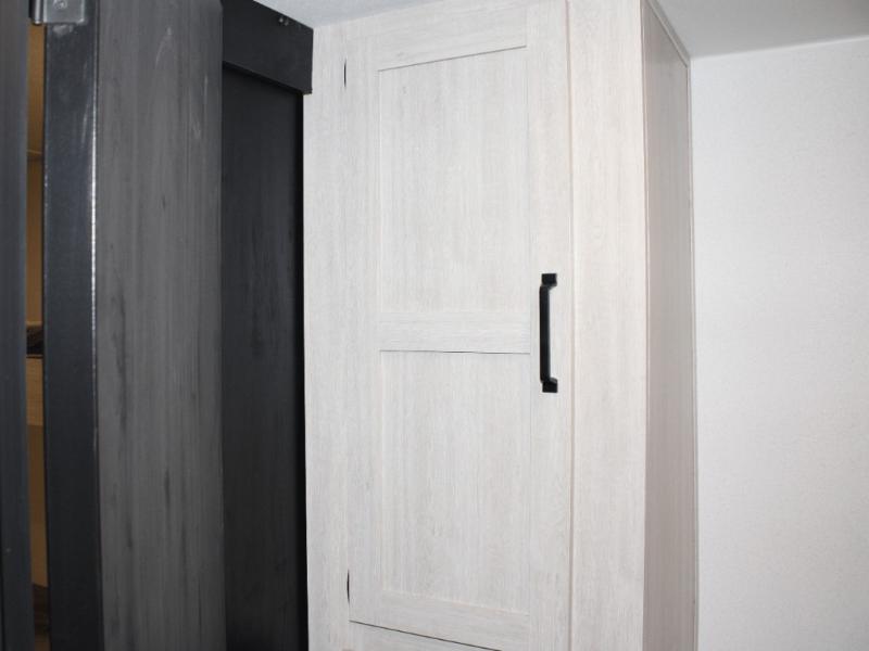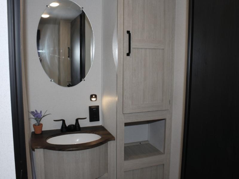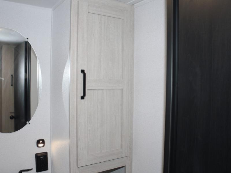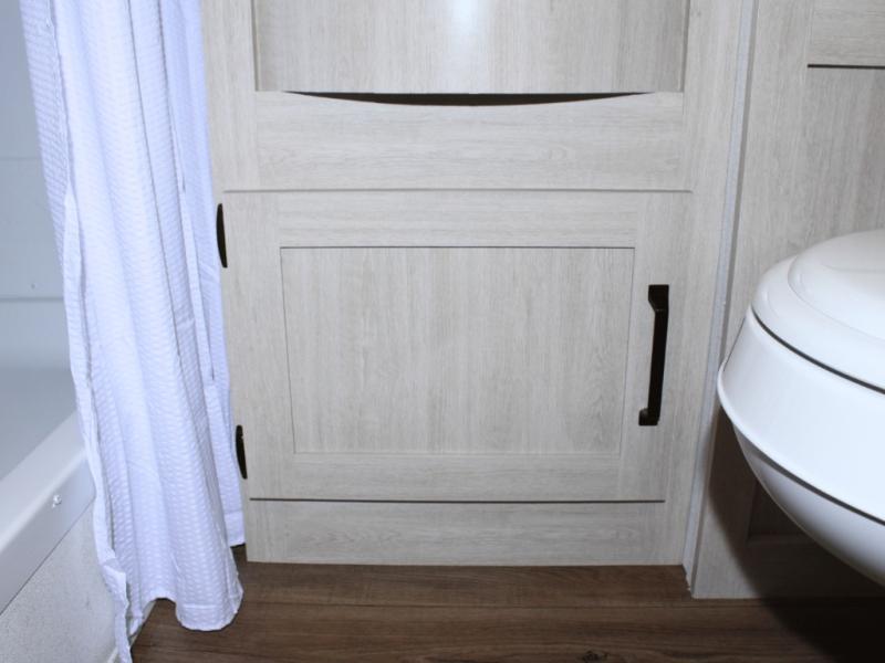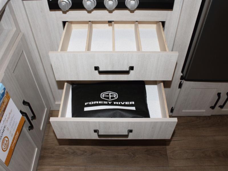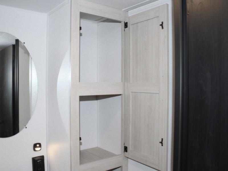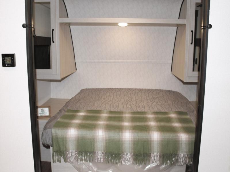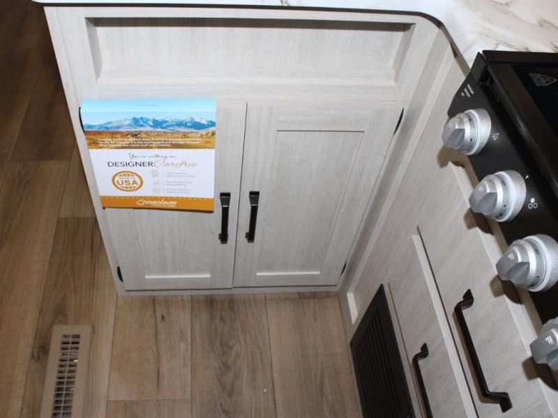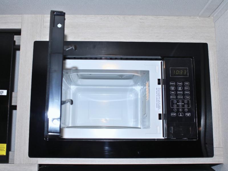 Step inside and enjoy the large slide-out that opens up the living space, giving you room to move freely. The booth dinette and sofa sit across from an optional TV, creating the ideal space for meals, games, and movie nights. The full kitchen features a three-burner cooktop, stainless microwave, 12V refrigerator, and pantry—making it easy to prepare home-cooked meals wherever your travels take you. For those who love cooking outdoors, an optional mini kitchen with a grill adds even more versatility.