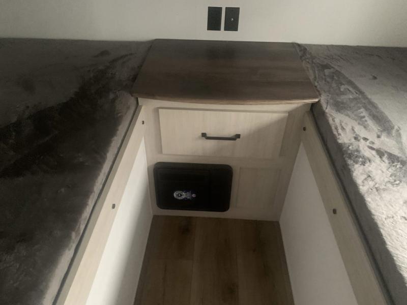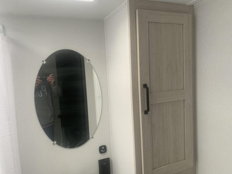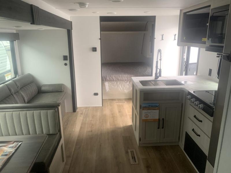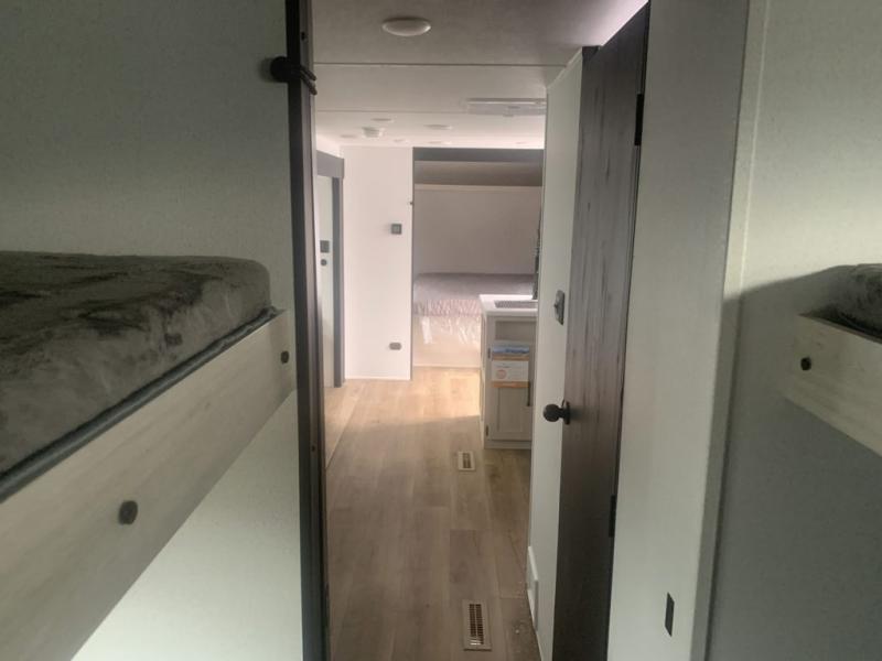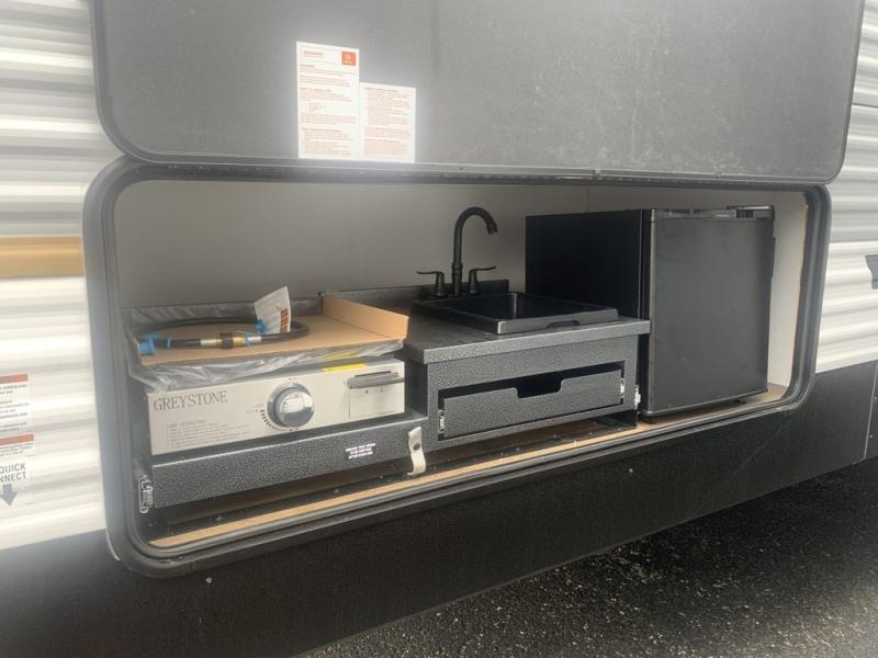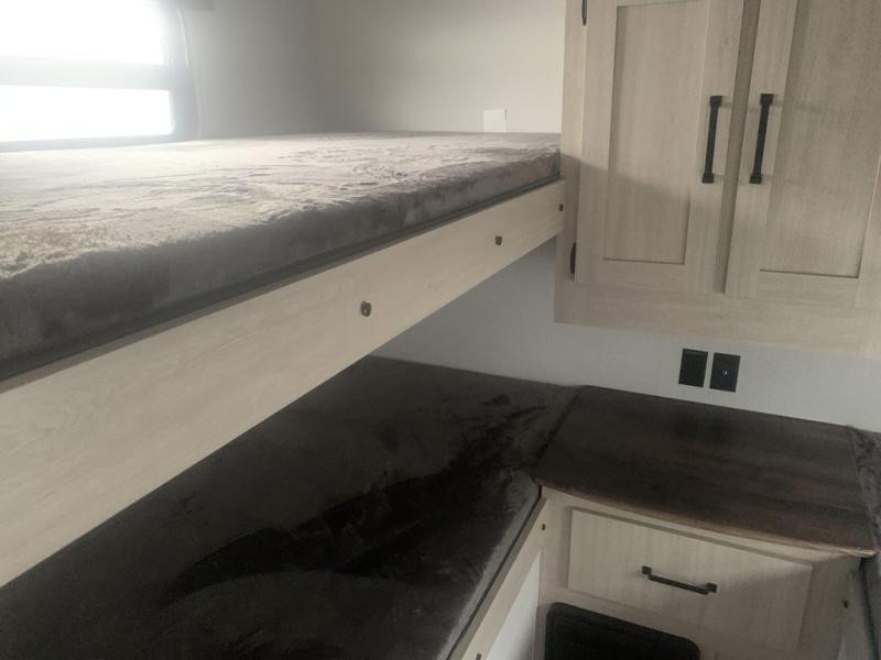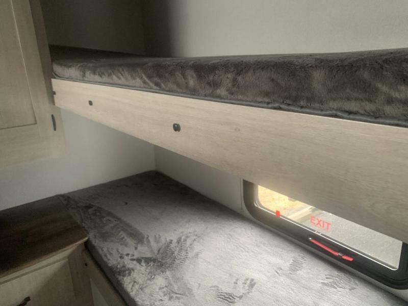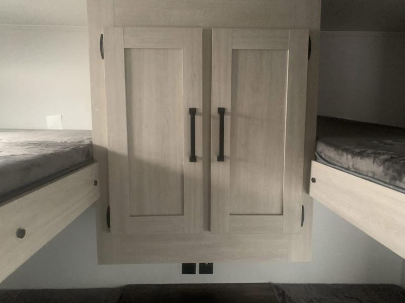 If you're looking for more space, this double axle unit features a large slide so you can walk about freely. Here, you'll find the booth dinette and sofa, which sit across from the optional TV if you want to enjoy movie nights. The full kitchen includes a stainless microwave and three burner cooktop to make meals, plus a pantry and 12V refrigerator for food storage. And an optional outside mini kitchen with a grill can be added if you enjoy cooking outdoors! Your guests or littles are sure to enjoy the rear private bunkhouse with four bunk beds and a wardrobe for their things!