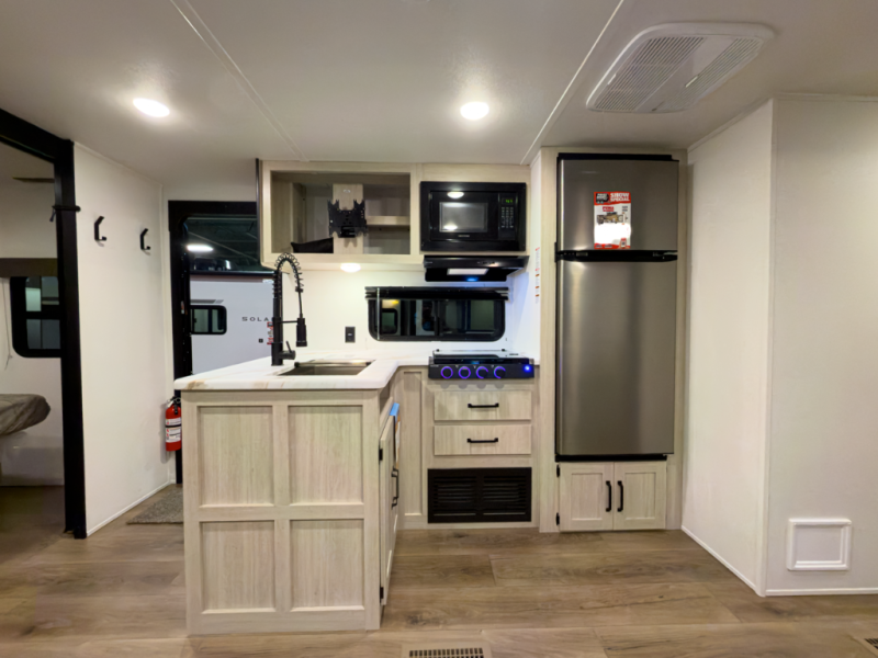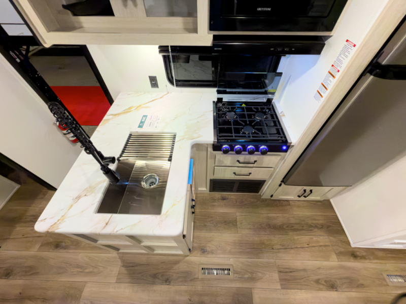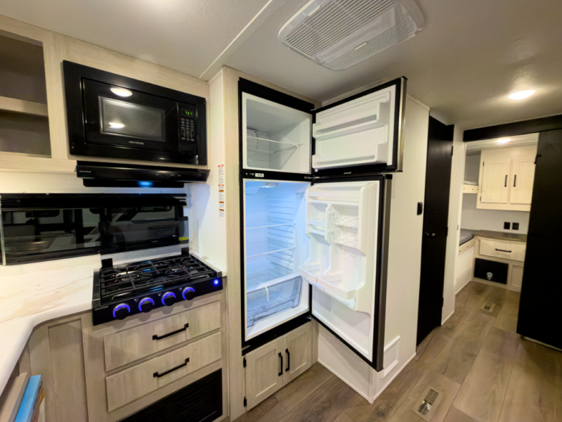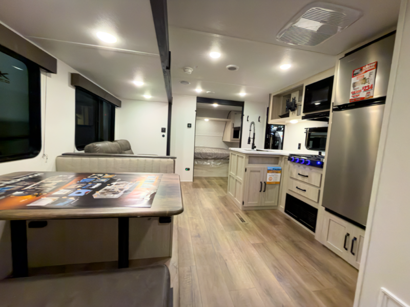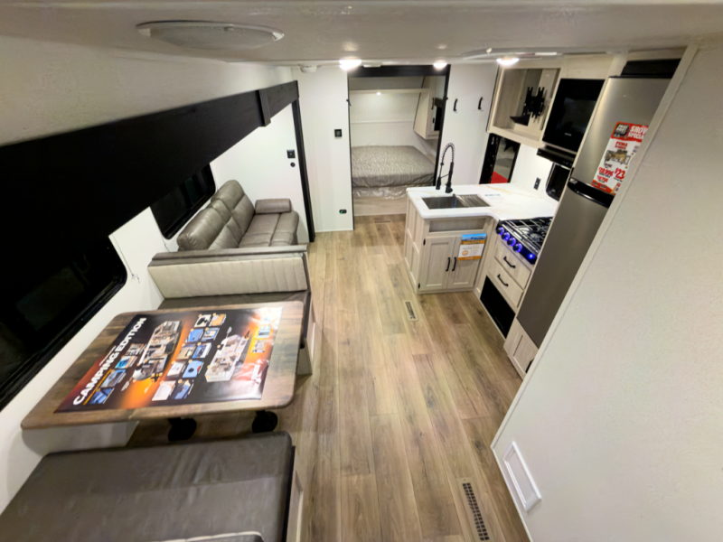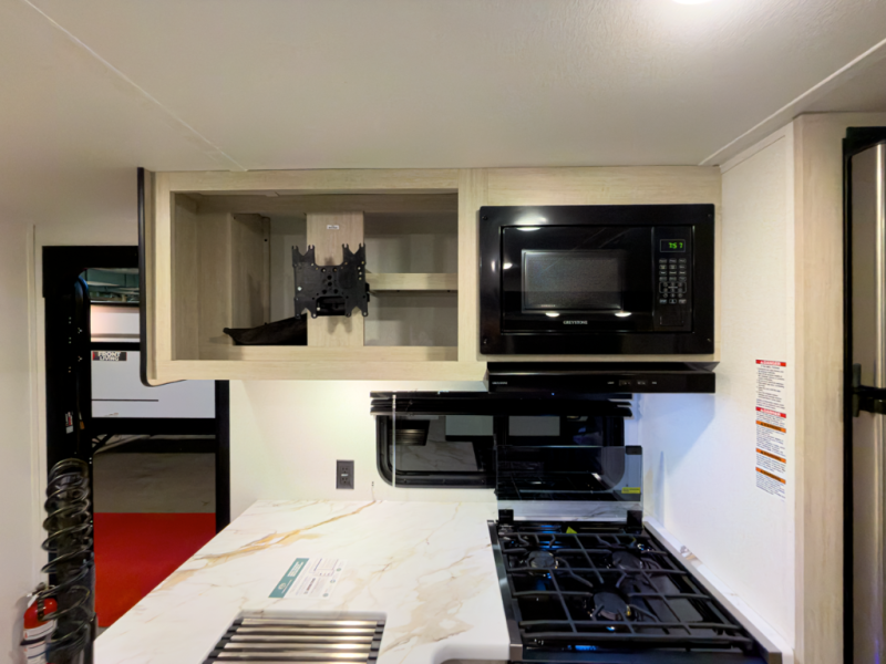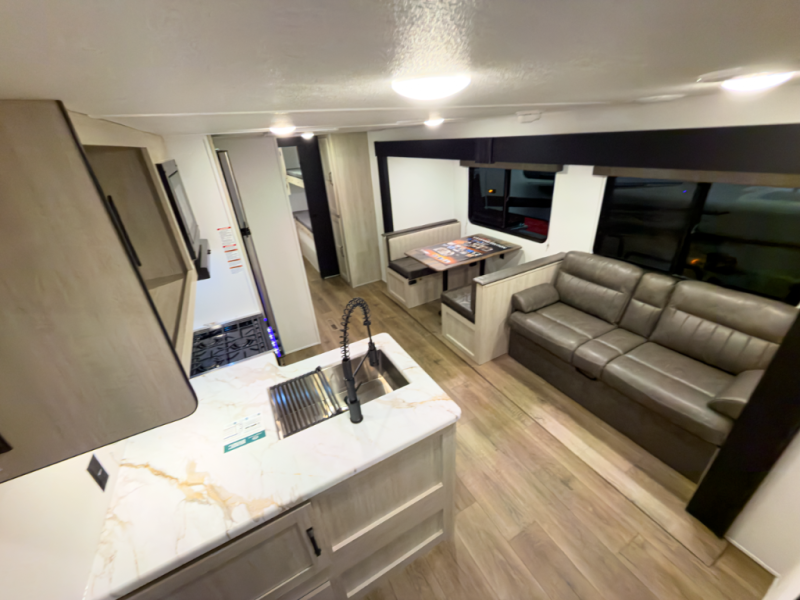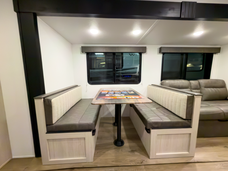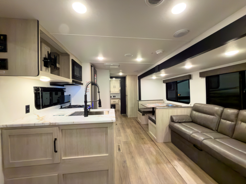 If you're looking for more space, this double axle unit features a large slide so you can walk about freely. Here, you'll find the booth dinette and sofa, which sit across from the optional TV if you want to enjoy movie nights. The full kitchen includes a stainless microwave and three burner cooktop to make meals, plus a pantry and 12V refrigerator for food storage. And an optional outside mini kitchen with a grill can be added if you enjoy cooking outdoors! Your guests or littles are sure to enjoy the rear private bunkhouse with four bunk beds and a wardrobe for their things!