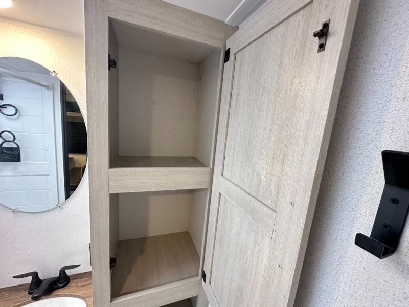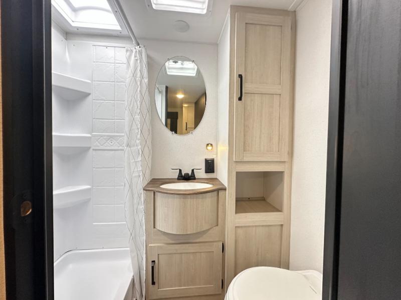 Bathroom: 40" shower, toilet, sink, and linen storage