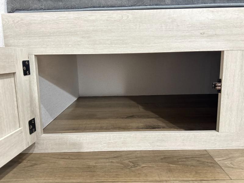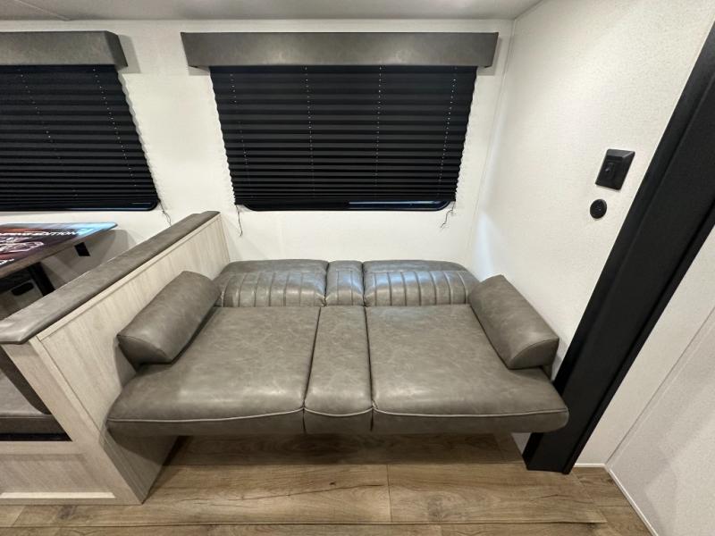 Living Area: Jack knife sofa with flip-down cupholder and storage, booth dinette