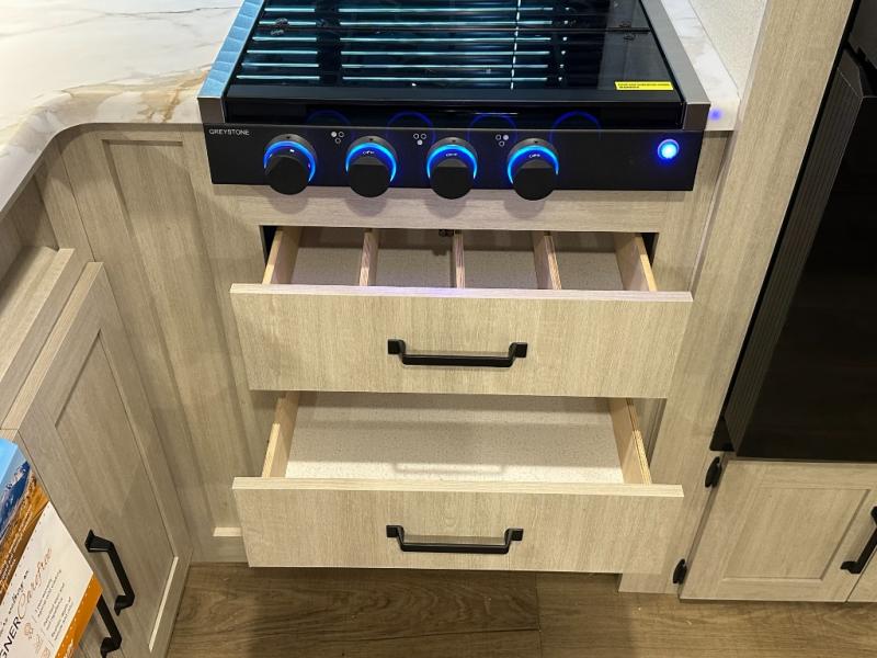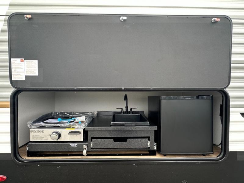 Outdoor Kitchen: Equipped with a Greystone griddle, sink with hot and cold water, and a mini-fridge, perfect for outdoor cooking and entertaining