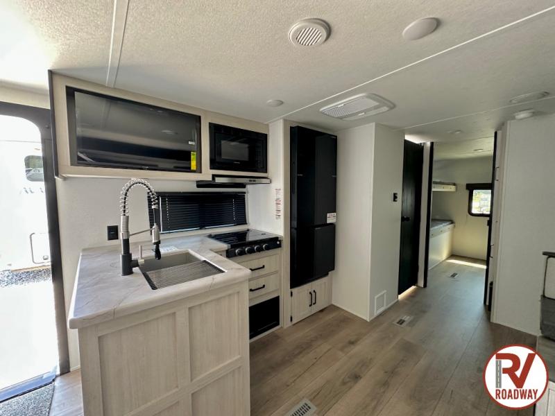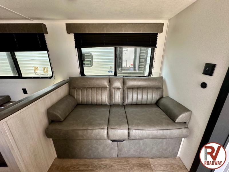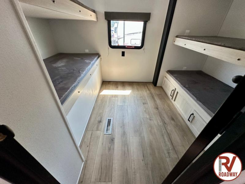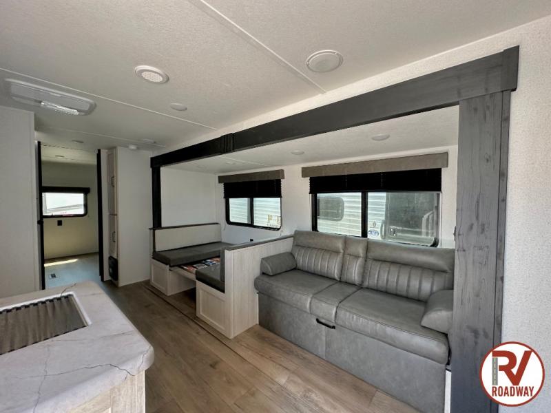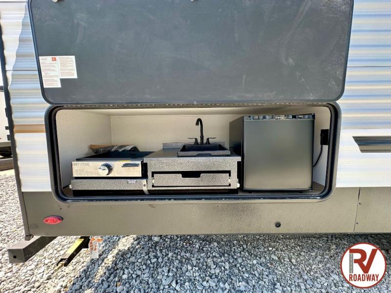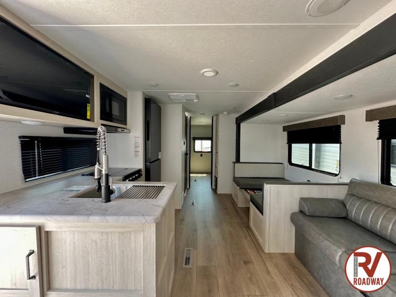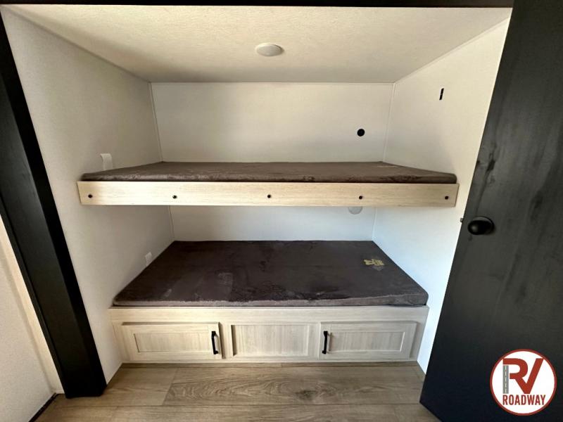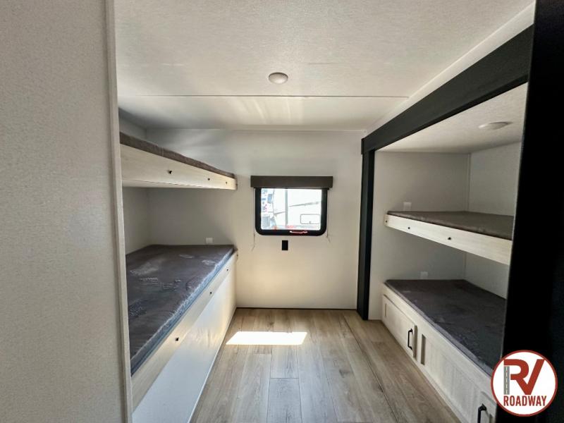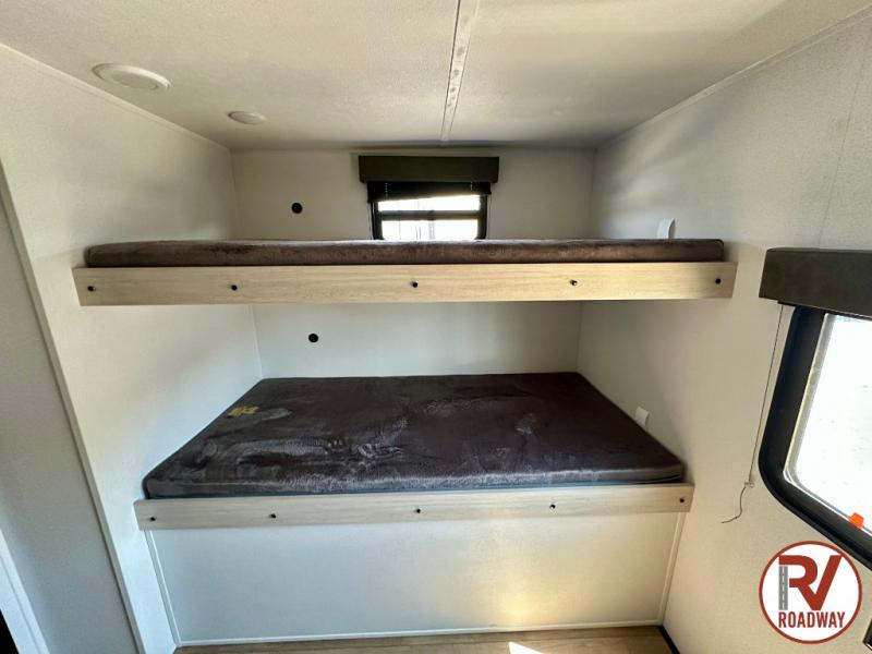 If you're looking for more space, this double axle, double slide out unit is perfect for your group of eight. Within the large slide in the living room, you'll find the booth dinette and sofa, which sit across from the optional TV if you want to enjoy movie nights. The full kitchen includes a stainless microwave and three burner cooktop to make meals, plus a pantry and 12V refrigerator for food storage. And an optional outside kitchen with a griddle can be added if you enjoy cooking outdoors! Your guests or littles are sure to enjoy the rear private bunkhouse that features a set of 38" x 76" bunks across from the third bunk and jiffy sofa within a slide out!