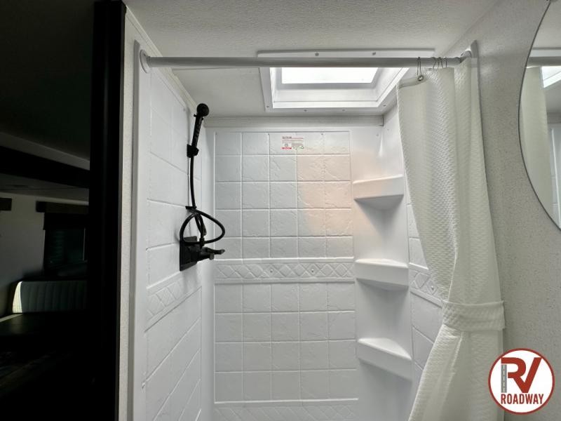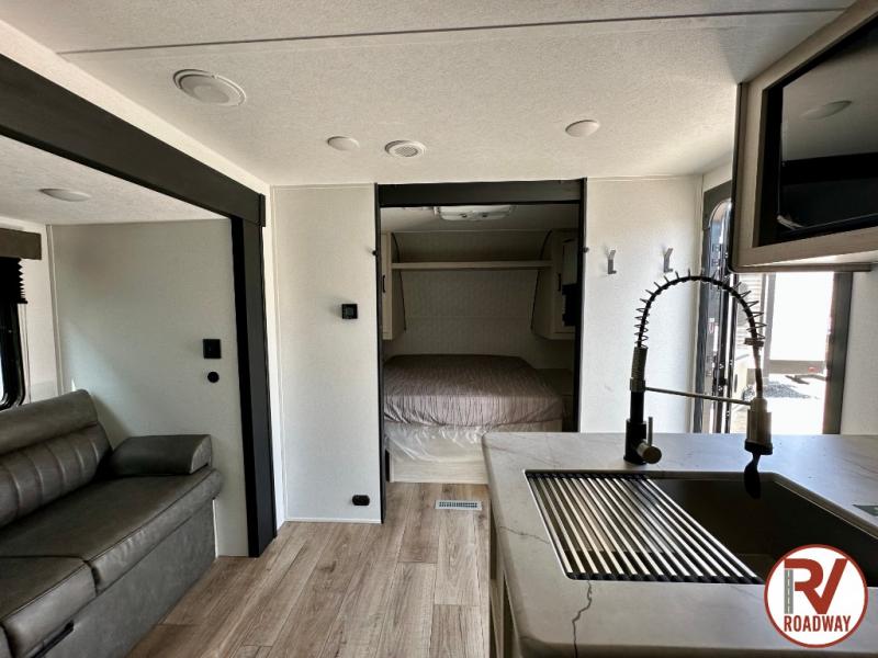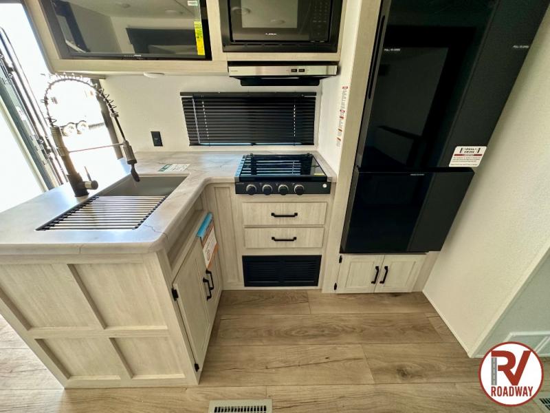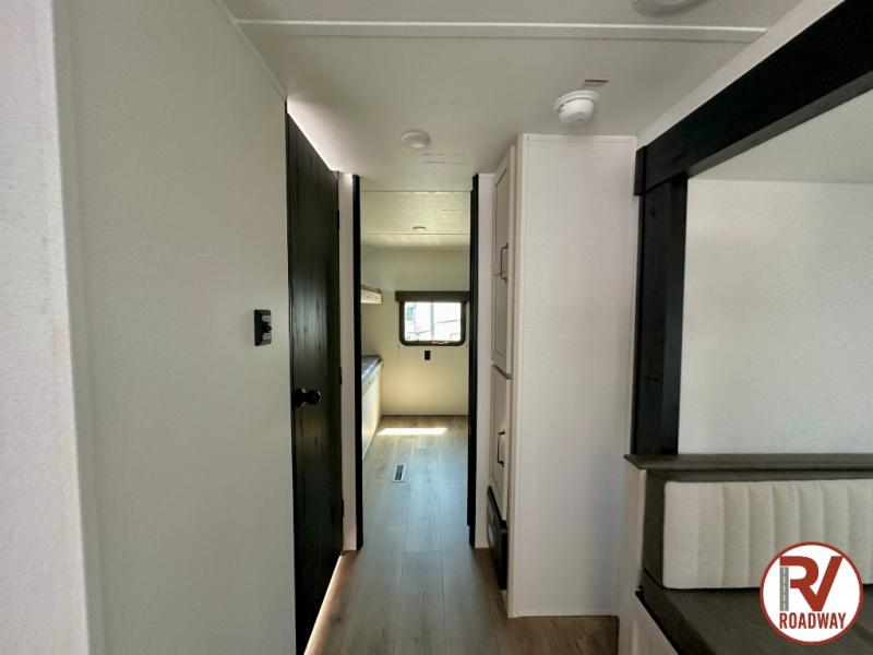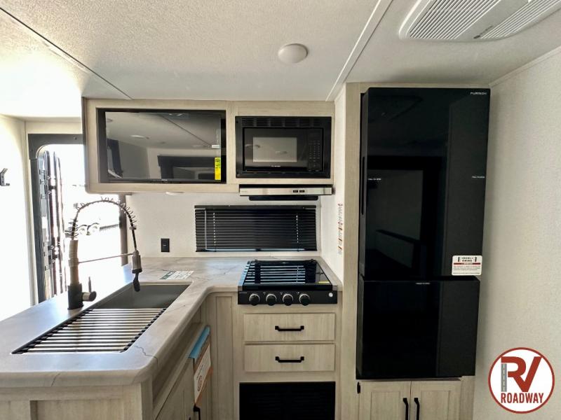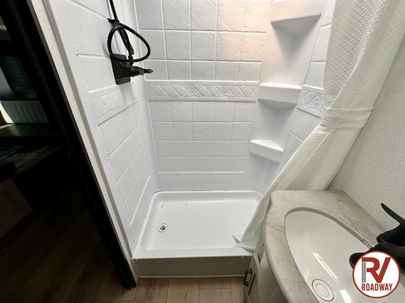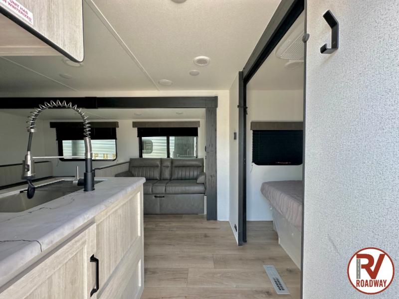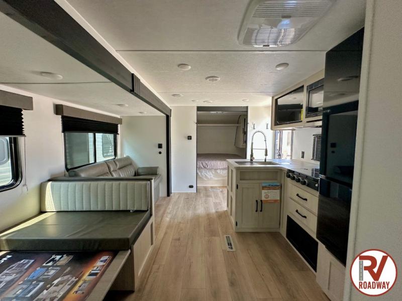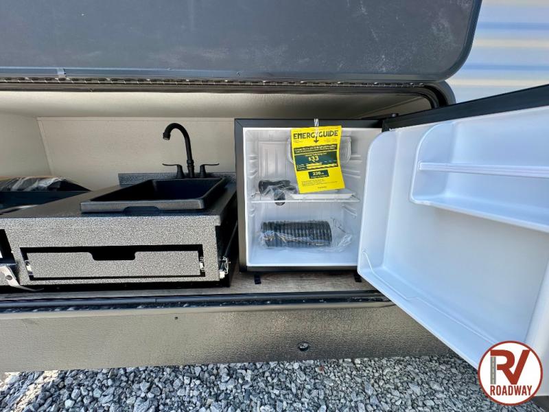 If you're looking for more space, this double axle, double slide out unit is perfect for your group of eight. Within the large slide in the living room, you'll find the booth dinette and sofa, which sit across from the optional TV if you want to enjoy movie nights. The full kitchen includes a stainless microwave and three burner cooktop to make meals, plus a pantry and 12V refrigerator for food storage. And an optional outside kitchen with a griddle can be added if you enjoy cooking outdoors! Your guests or littles are sure to enjoy the rear private bunkhouse that features a set of 38" x 76" bunks across from the third bunk and jiffy sofa within a slide out!