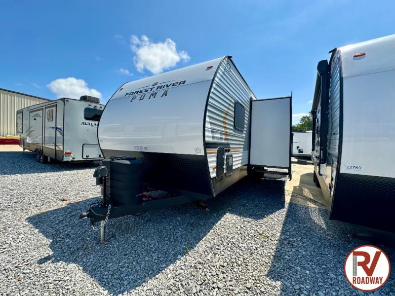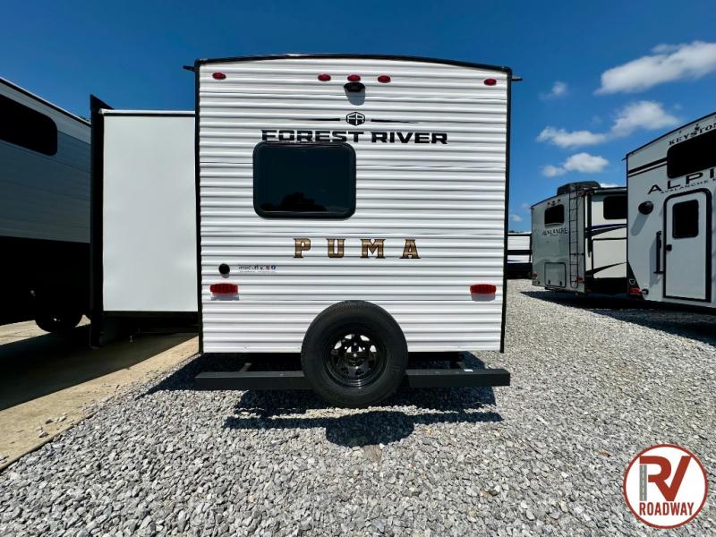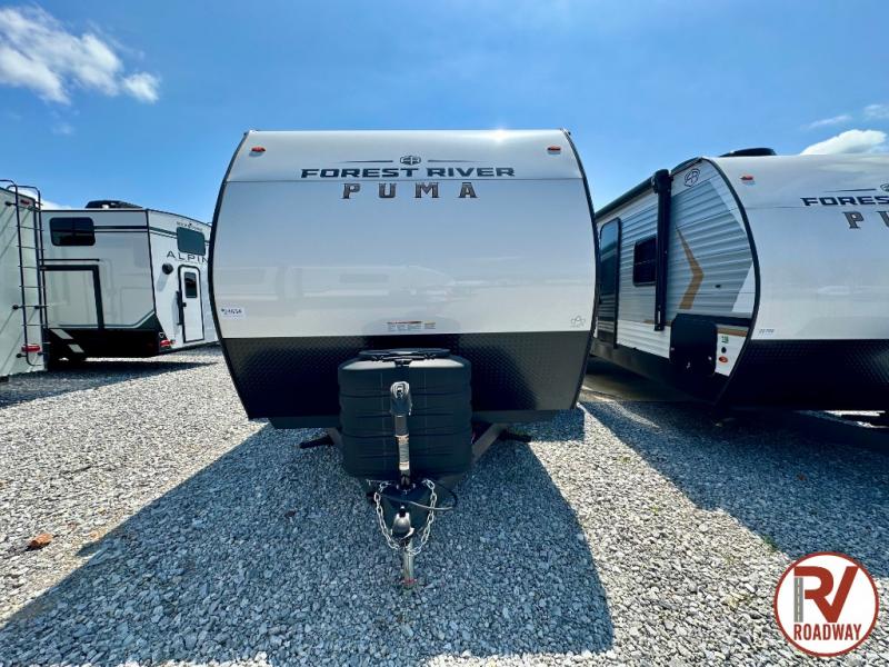 The Puma Camping Edition by Palomino offer an affordable travel trailer for rookie campers or seasoned RVers! They are built with 5/8" tongue and groove plywood flooring and a front diamond plate for added protection. There are also exterior clamp style door latches, back up camera prep, and 20 lb. LP bottles. Head inside to find Thermofoil countertops with a smooth drop edge, bedroom USB ports and outlets, and a GE appliance and kitchen package.