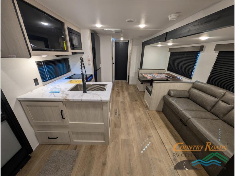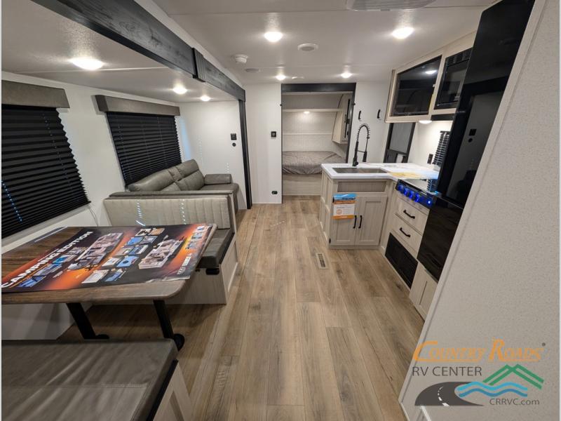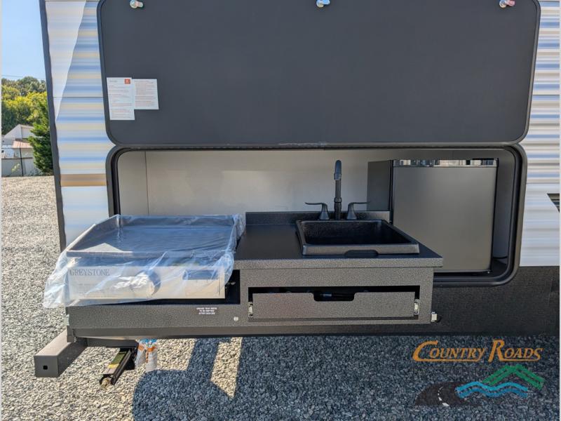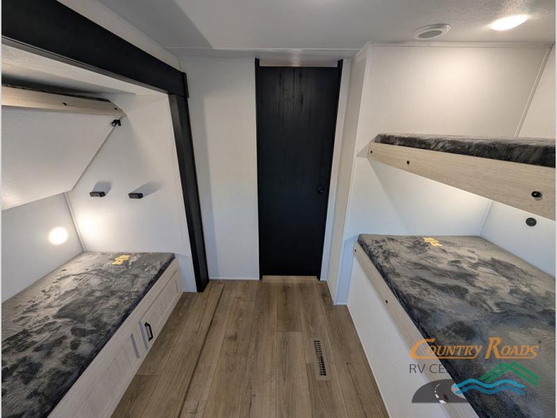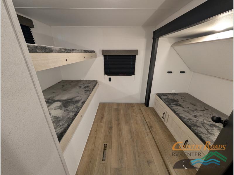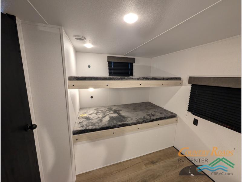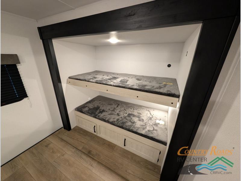 If you're looking for more space, this double axle, double slide out unit is perfect for your group of eight. Within the large slide in the living room, you'll find the booth dinette and sofa, which sit across from the optional TV if you want to enjoy movie nights. The full kitchen includes a stainless microwave and three burner cooktop to make meals, plus a pantry and 12V refrigerator for food storage. And an optional outside kitchen with a griddle can be added if you enjoy cooking outdoors! Your guests or littles are sure to enjoy the rear private bunkhouse that features a set of 38" x 76" bunks across from the third bunk and jiffy sofa within a slide out!