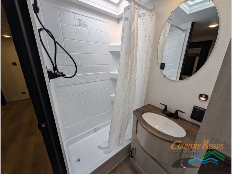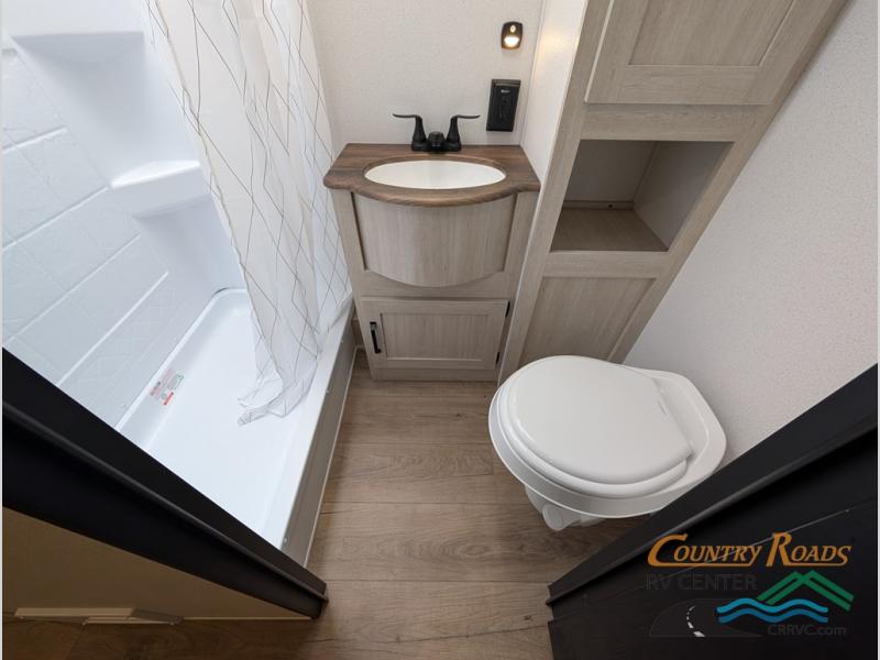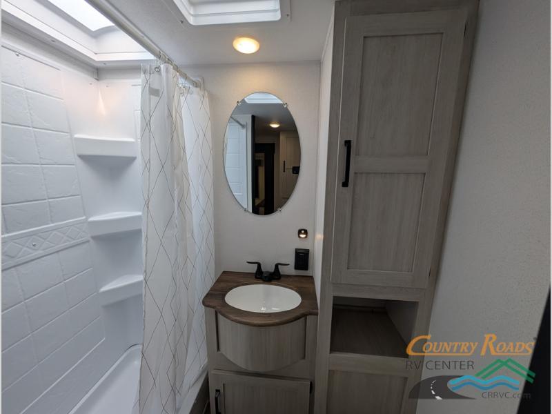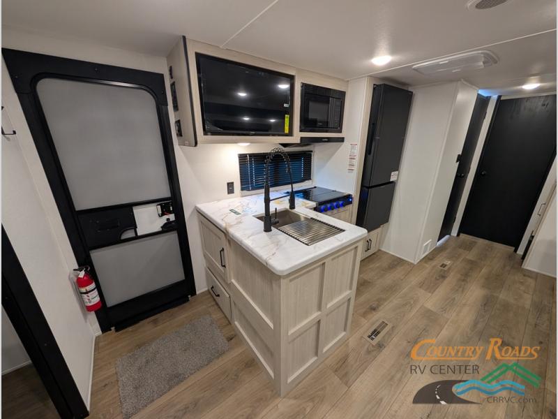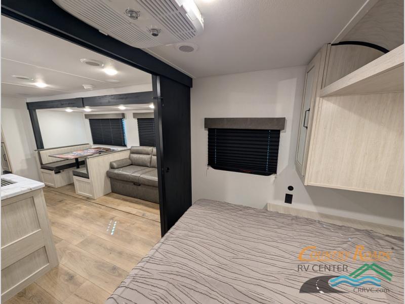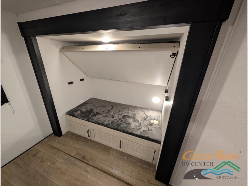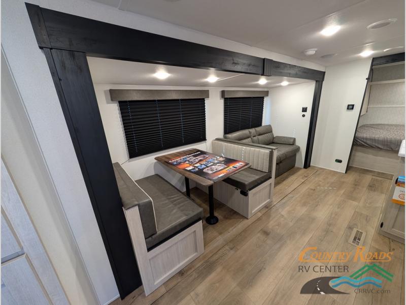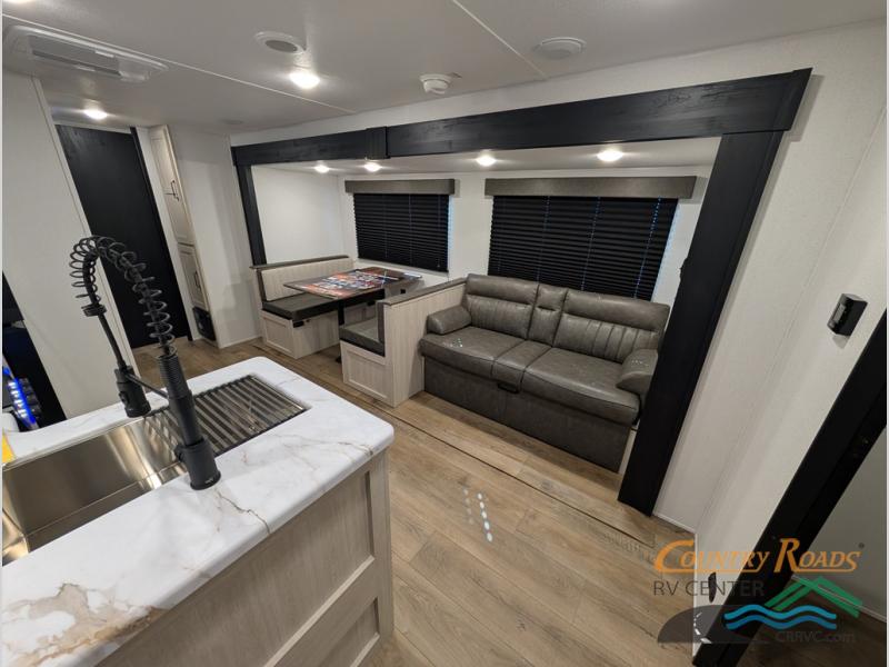 If you're looking for more space, this double axle, double slide out unit is perfect for your group of eight. Within the large slide in the living room, you'll find the booth dinette and sofa, which sit across from the optional TV if you want to enjoy movie nights. The full kitchen includes a stainless microwave and three burner cooktop to make meals, plus a pantry and 12V refrigerator for food storage. And an optional outside kitchen with a griddle can be added if you enjoy cooking outdoors! Your guests or littles are sure to enjoy the rear private bunkhouse that features a set of 38" x 76" bunks across from the third bunk and jiffy sofa within a slide out!