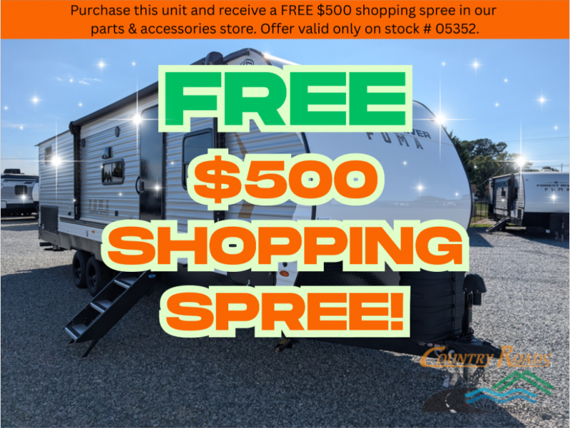 The Puma Camping Edition by Palomino offer an affordable travel trailer for rookie campers or seasoned RVers! They are built with 5/8" tongue and groove plywood flooring and a front diamond plate for added protection. There are also exterior clamp style door latches, back up camera prep, and 20 lb. LP bottles. Head inside to find Thermofoil countertops with a smooth drop edge, bedroom USB ports and outlets, and a GE appliance and kitchen package.