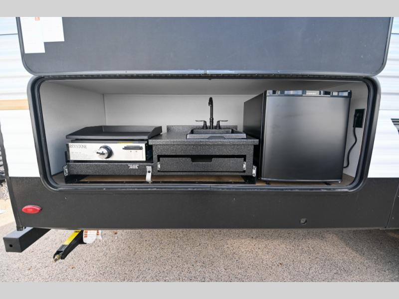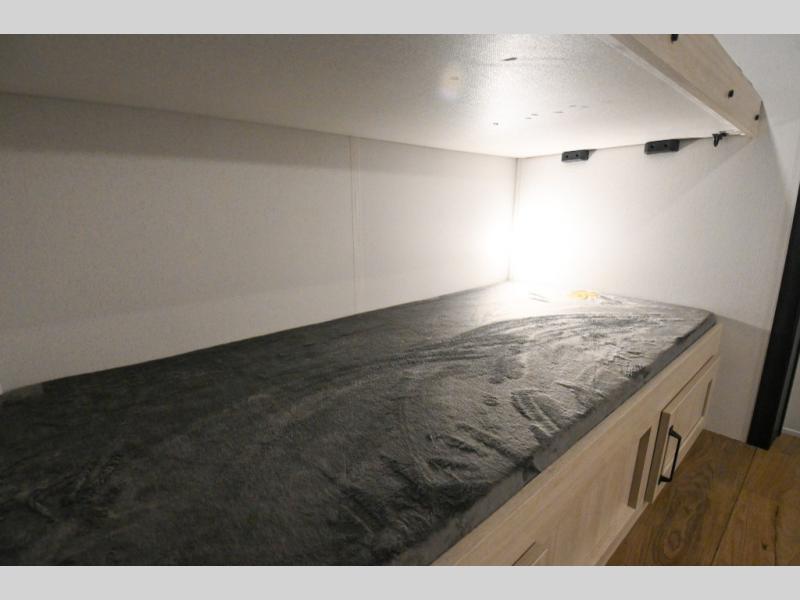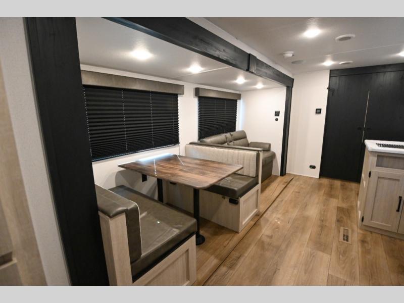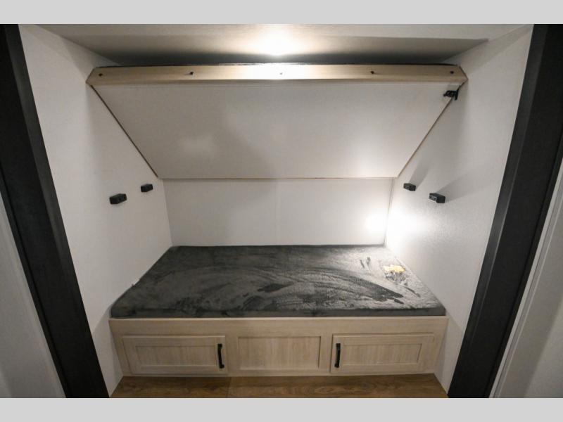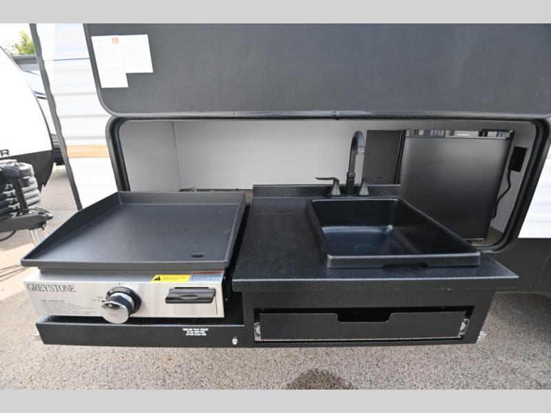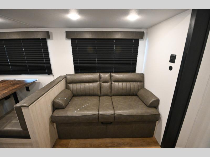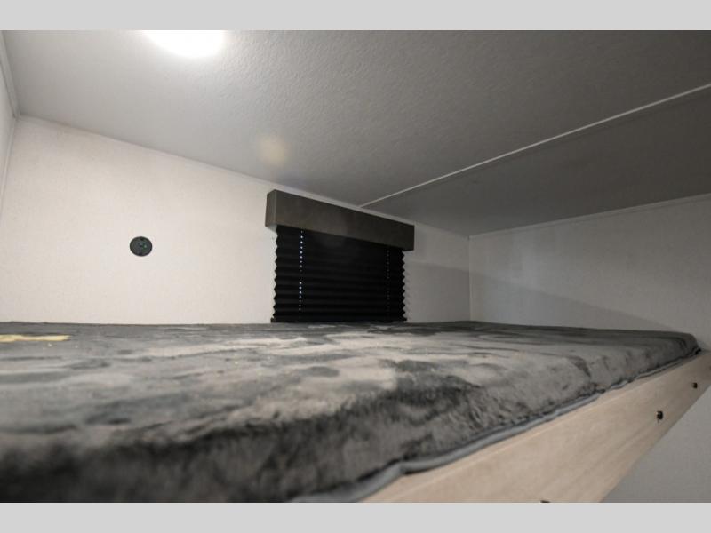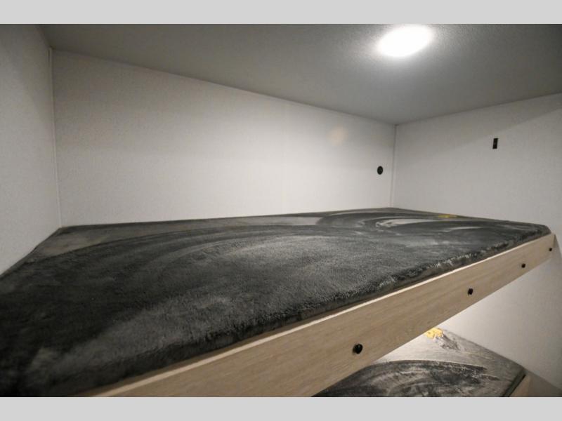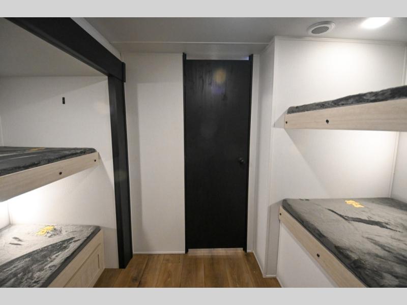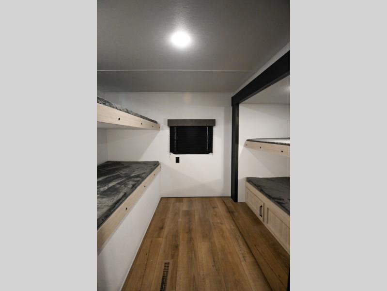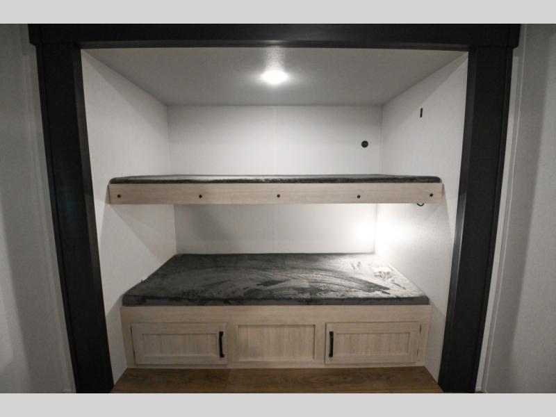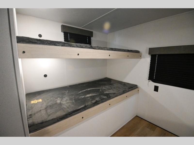 If you're looking for more space, this double axle, double slide out unit is perfect for your group of eight. Within the large slide in the living room, you'll find the booth dinette and sofa, which sit across from the optional TV if you want to enjoy movie nights. The full kitchen includes a stainless microwave and three burner cooktop to make meals, plus a pantry and 12V refrigerator for food storage. And an optional outside kitchen with a griddle can be added if you enjoy cooking outdoors! Your guests or littles are sure to enjoy the rear private bunkhouse that features a set of 38" x 76" bunks across from the third bunk and jiffy sofa within a slide out!